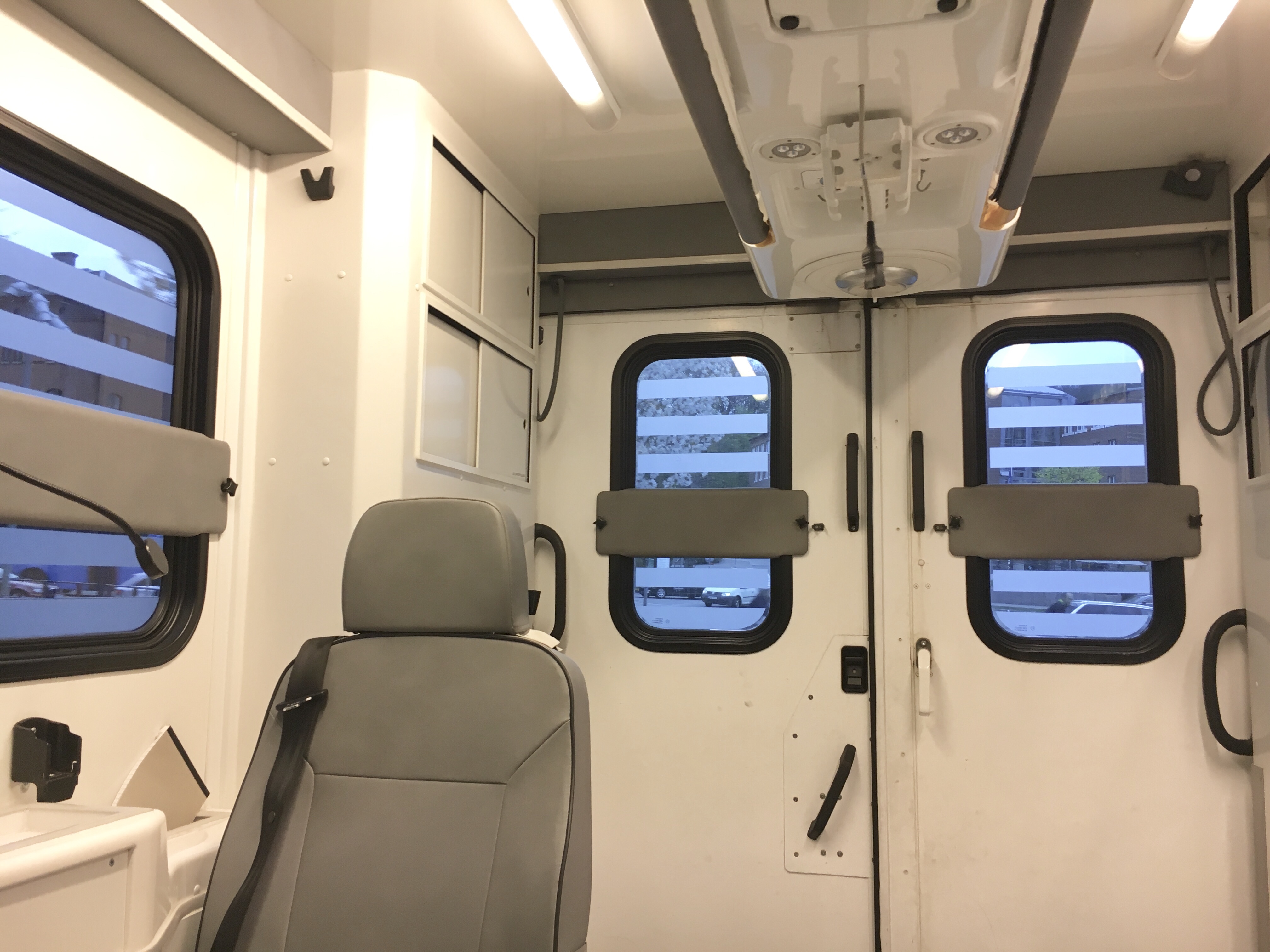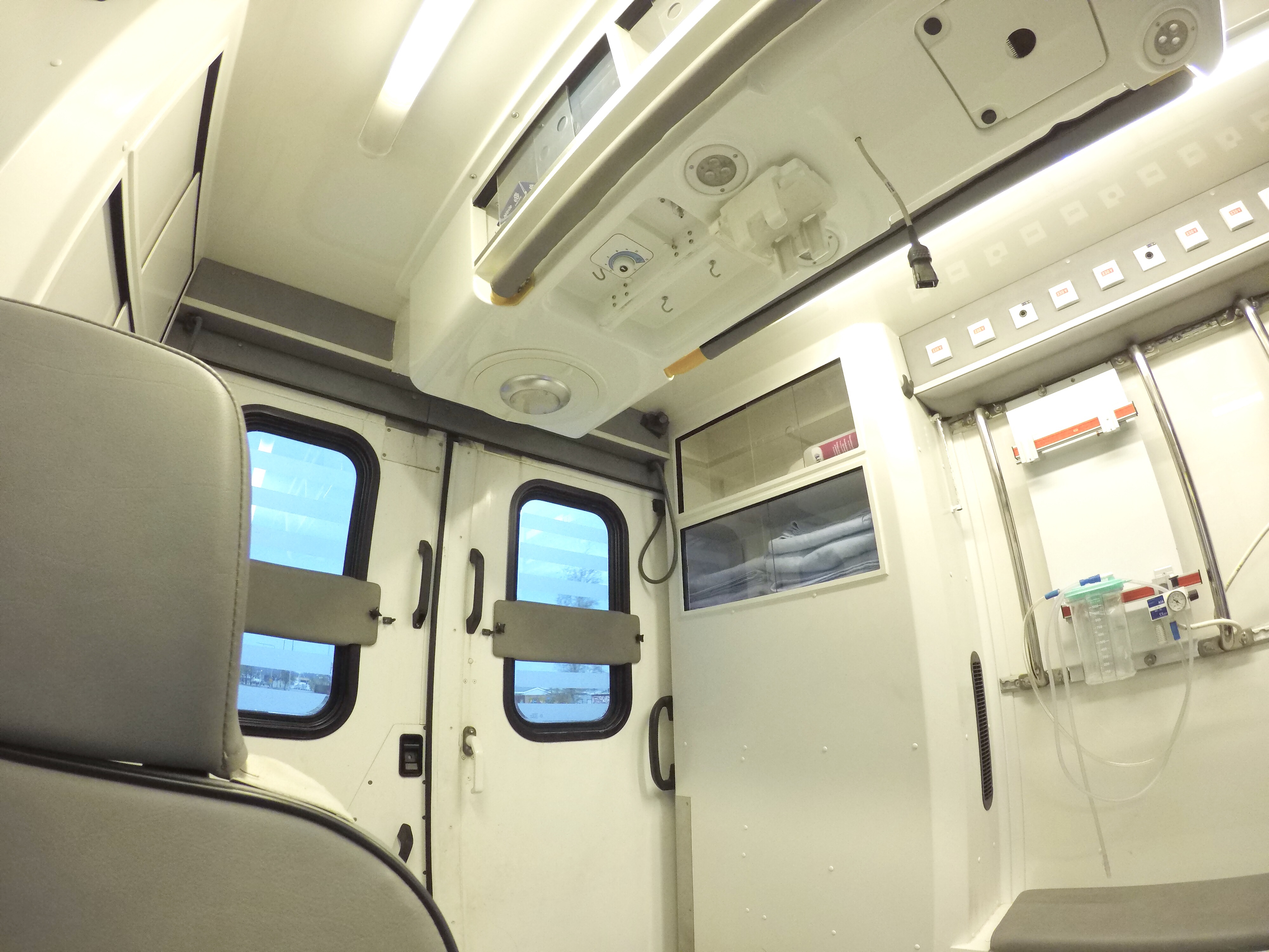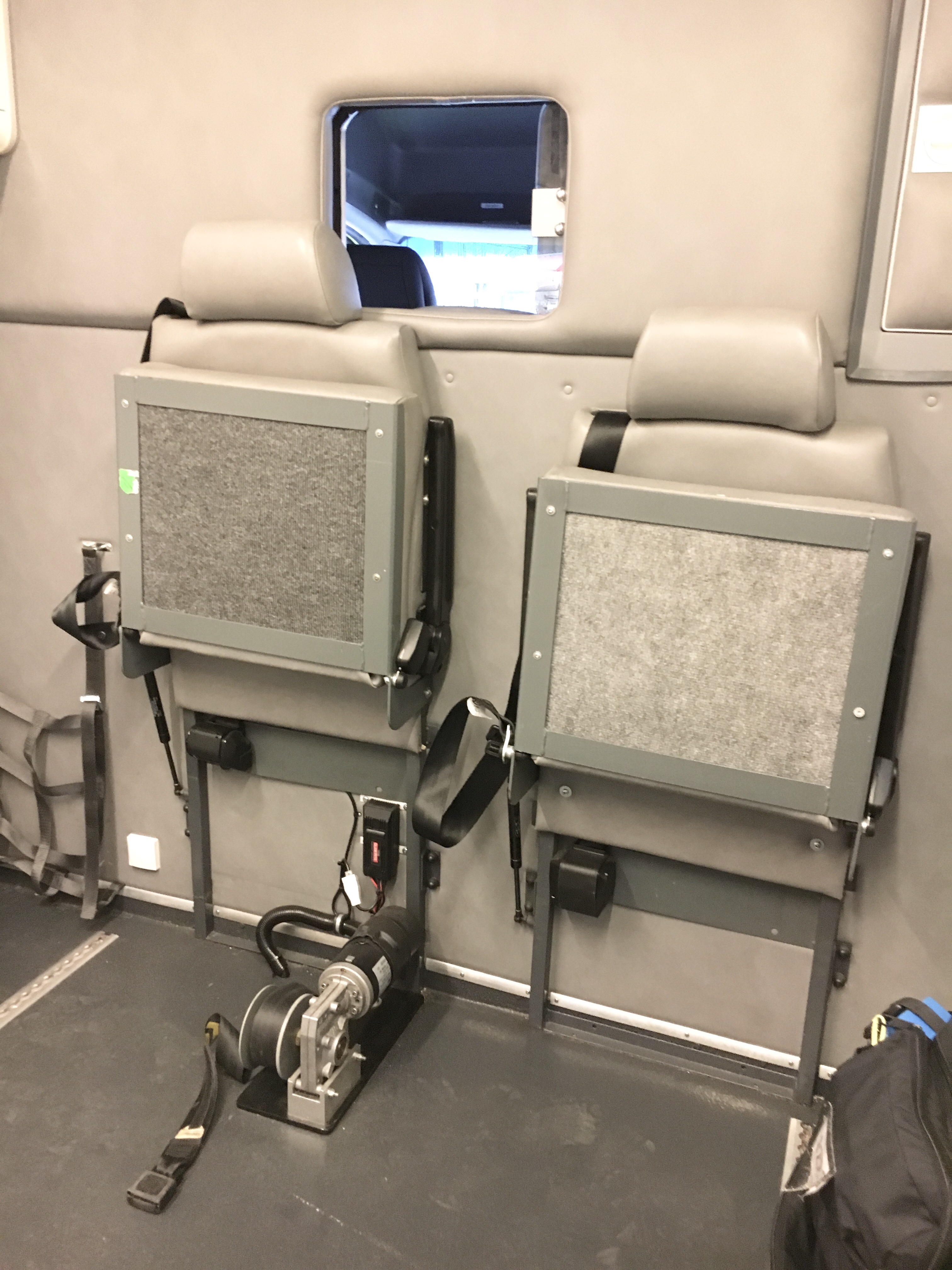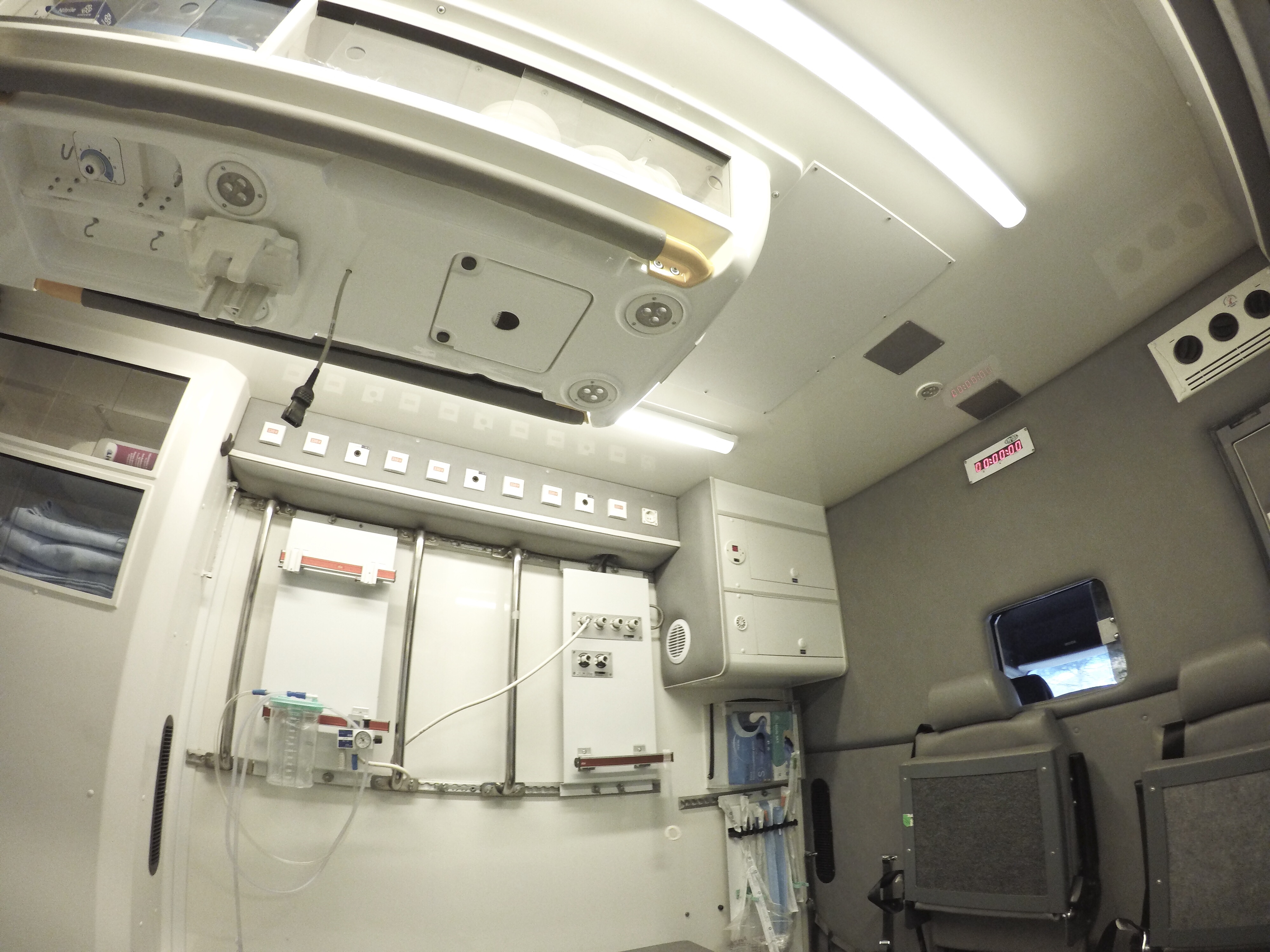 2. Ground Transport ตอนแรกคิดว่ารถ Ambulance ที่นั่งอยู่นี่แหละ เอาไว้สำหรับรีเฟอคนไข้ แต่ไม่ใช่จ้าาาา ถ้าเป็นเคสธรรมดา ไม่ใส่ท่อช่วยหายใจ ก็ใช้รถคันเดิม แต่ถ้าเป็นคนไข้หนักที่ใส่ท่อ มี IV + monitor เยอะแยะ เค้าจะต้องเปลี่ยนรถเป็นอีกคัน คันนี้จะใหญ่และหนักกว่า จึงต้องใช้ Driving License class C สำหรับพวกรถบรรทุกงี้ ซึ่งไม่ใช่ทุกคนมีใบขับขี่ชนิดนี้นะ คันนี้สามารถบรรจุได้ทั้งหมด 8 คน ด้านหน้ามีคนขับ และข้างคนขับ 2 คน ส่วนด้านหลัง มีคนไข้ 1 และเก้าอี้ที่มี Safety Belt 3 ที่นั่ง และเบาะยาว 1