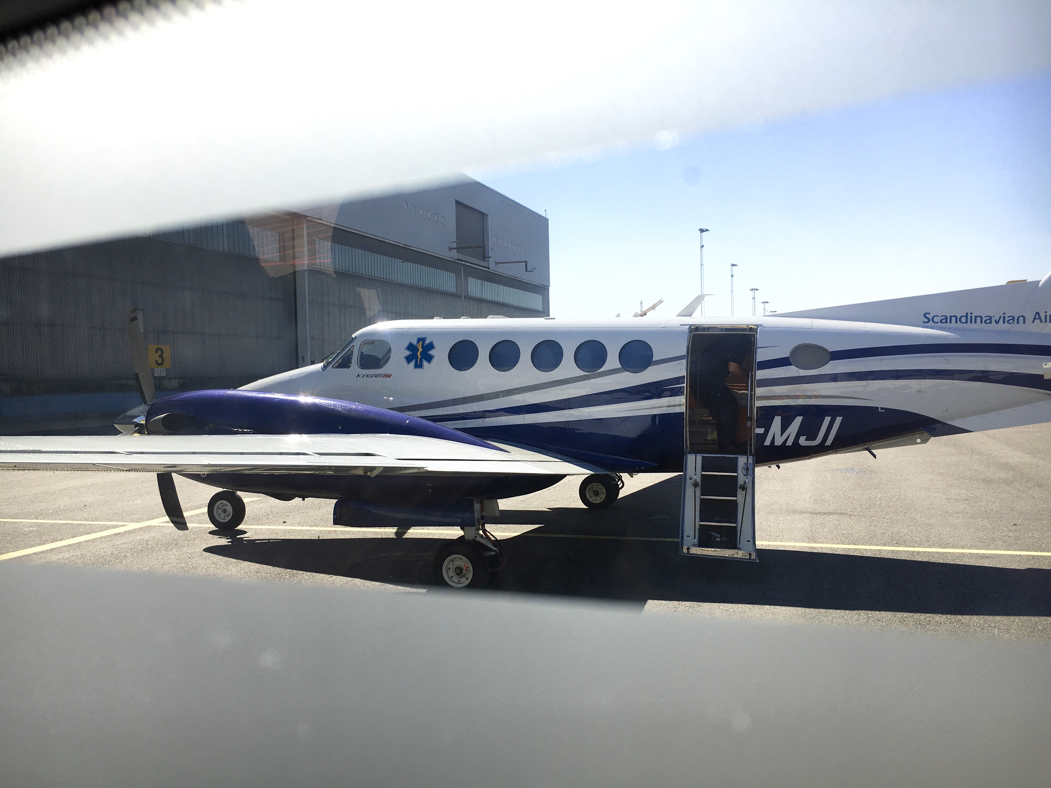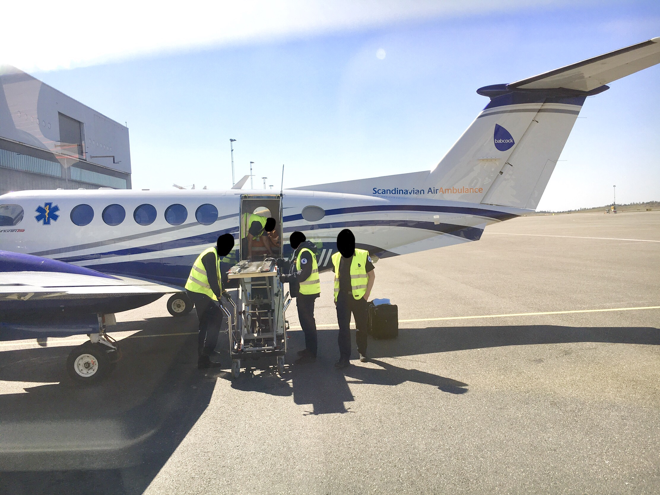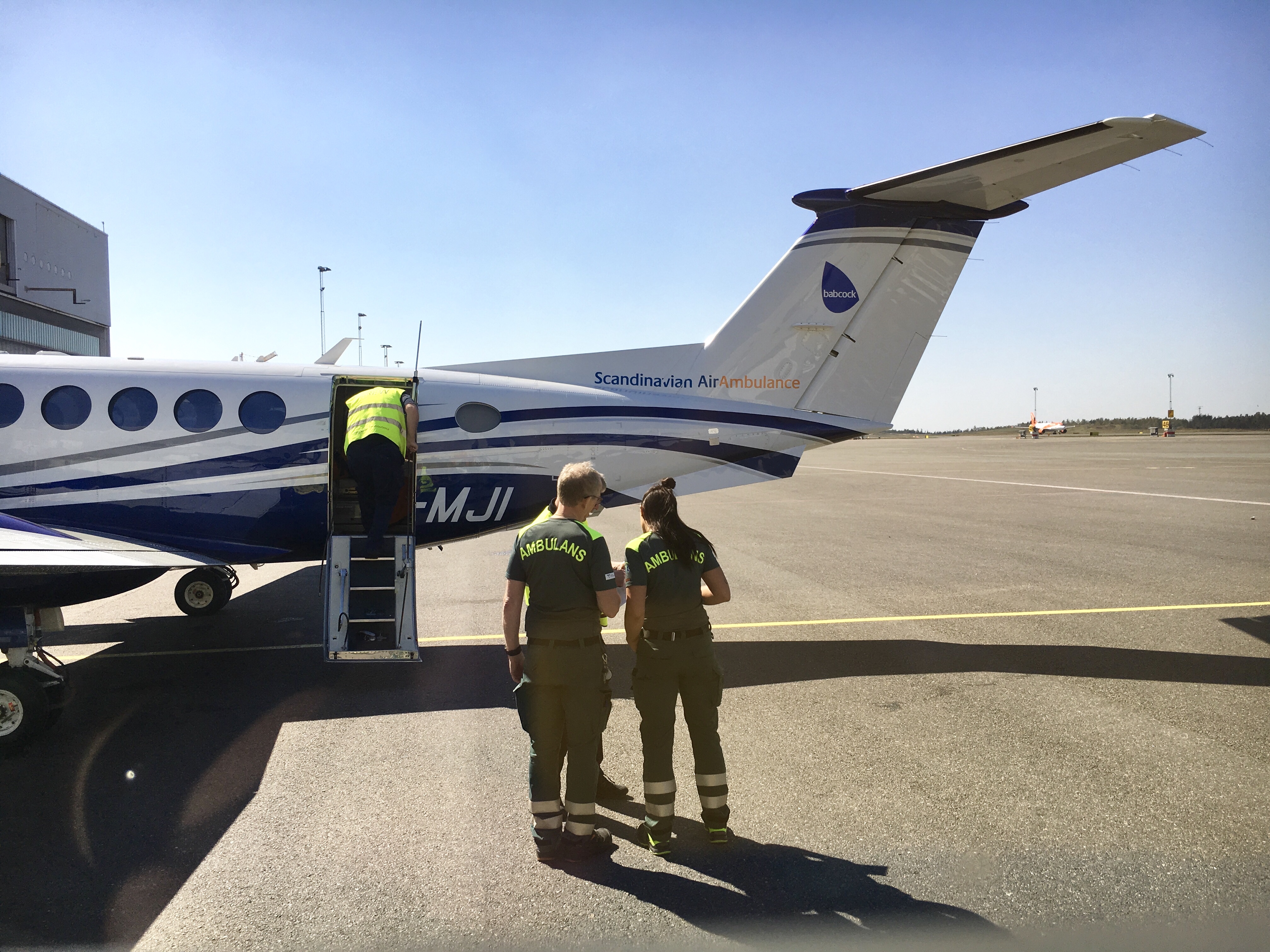 1. Air Transport รับจากสนามบิน Landvetter ไปยัง Sahlgrenska Hospital เจ้าหน้าที่แอมจะได้รับภารกิจจากศูนย์สั่งการ แจ้งกำหนดการณ์ Flight number และรายละเอียดของเคส ก็แค่ขับรถไปรอ แล้วรับคนไข้มา เป็นเคส Fracture Femur จากการเล่นสกี คนไข้เดินทางมาจากภาคเหนือของสวีเดน ใช้บริการ Scandinavian Air Ambulance เป็นเครื่องบินเจ็ท (ความจริงแล้วอาการดีมาก ไม่มี IV/monitor ใดๆ แค่ขาหักเฉยๆ แต่คิดว่าการเดินทางค่อนข้างยากและไกลจึงเลือกรีเฟอวิธีนี้ แต่ถ้าที่ไทยก็อาจบิน Commercial Flight แล้วนอน Stretcher ได้นะ 555) มีหมอคอยดูแลอยู่บนเครื่องบิน และภารกิจของหมอจบที่สนามบิน ไม่ต้องตามคนไข้มา ในเคสนี้ เค้าขนส่งคนไข้มา 2 คน คนนึง Fracture Femur ส่วนอีกคนเดินได้ แต่ไม่รู้ว่าเป็นอะไร ดังนั้นจึงมี Ambulance 2 คันที่มารับผู้ป่วย