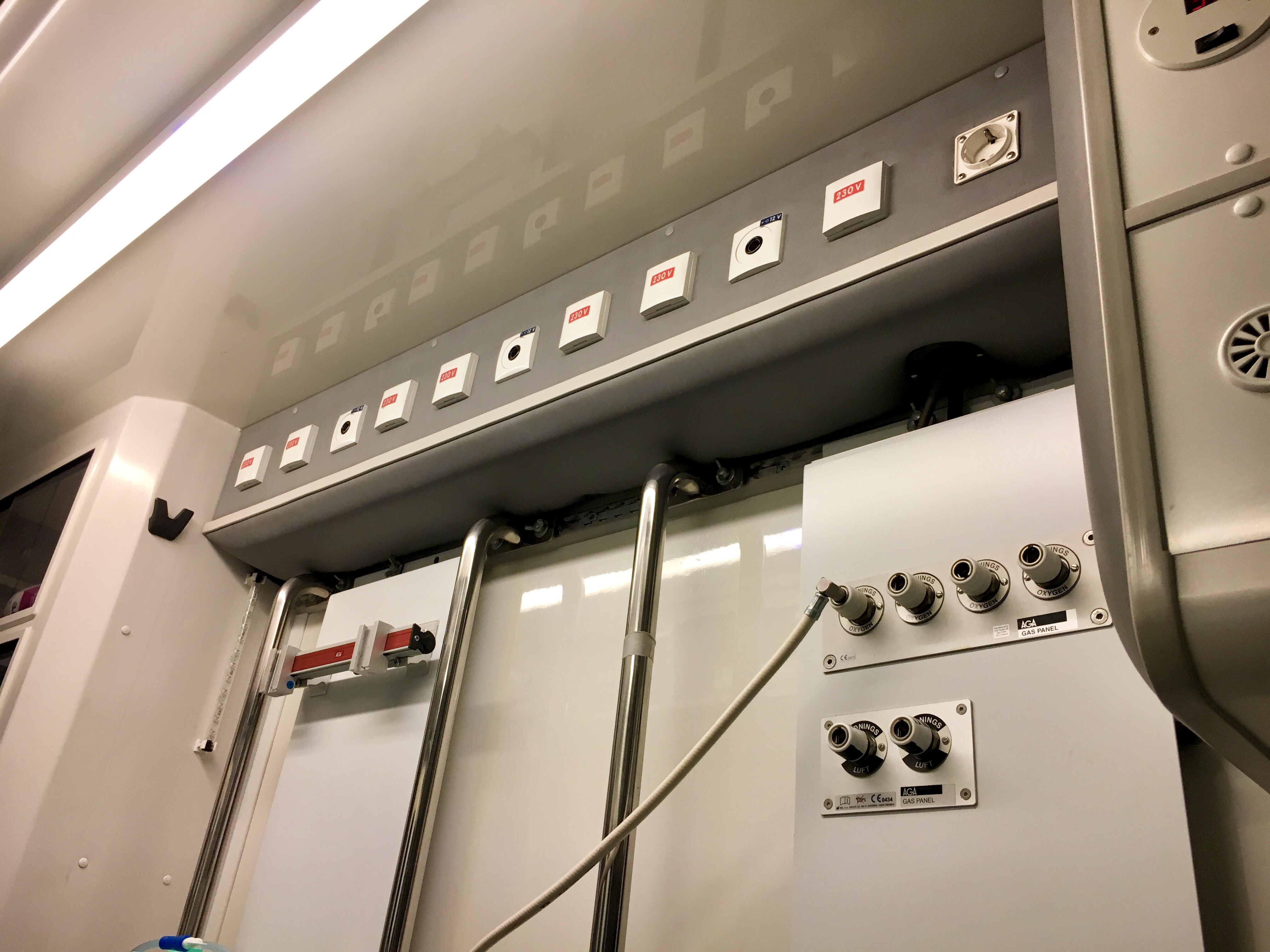 เค้าจะมีเตียงพิเศษที่เอาไว้สำหรับ Transfer คนไข้โดยเฉพาะ และไม่ใช่ Stretcher ธรรมดา เป็นชนิดพิเศษที่สามารถเอาไปใส่ในรถแอมคันใหญ่ได้ด้วย เตียงนี้เลิศมากกกกกกก ตรงที่มันมีชั้นวางของที่สามารถใส่อุปกรณ์ได้หมดทุกอย่าง ไม่ต้องไปเกี่ยวกับข้างเตียงผู้ป่วย มีที่วาง Ventilator ไว้เป็นชั้นวางข้างๆ เตียงผู้ป่วย (แค่ไม่ต้องมาบีบแอมบู และแทรกตัวระหว่างลิฟท์ ก็ดีใจน้ำตาจะไหลละ) ส่วนตัว Monitor ทั้ง Vital Signs และ จอ Ventilator ก็จะเป็นอีกชั้นหนึ่งที่หัวเตียง ซึ่งชั้นนี้สามารถหมุนไปทางศีรษะคนไข้ หรือไปทางด้านข้างของคนไข้ได้ ดังนั้นเวลาเข็นเตียงงี้ ก็พับไปทางศีรษะคนไข้ สะดวกสบาย แต่พอขึ้นไปบนรถแล้ว ก็พับไปทางด้านข้าง หมอก็จะสามารถนั่งดู monitor ได้สะดวก (นึกถึงโมเม้นที่ต้องเข็น ventilator ตามเตียงไป แล้วสายก็ตึงงี้ จะหลุดล้าวววงี้ มัน safe มั้ย? ฮืออออ )