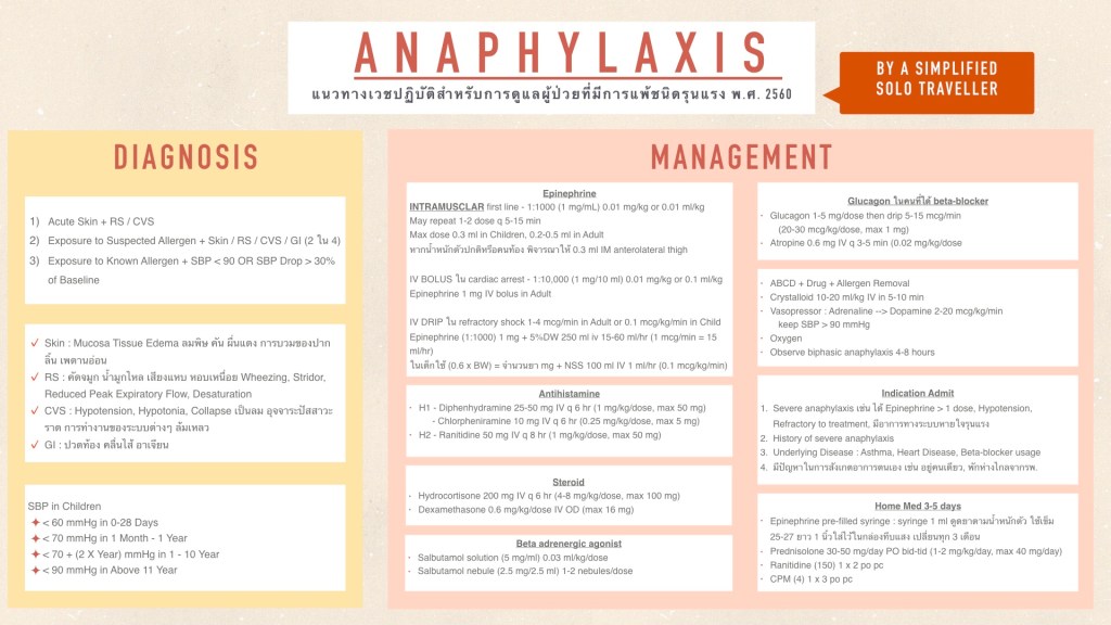 Clinical Practice Guideline for Anaphylaxis 2017 อ้างอิงตาม แนวทางเวชปฏิบัติสำหรับการดูแลผู้ป่วยที่มีการแพ้ชนิดรุนแรง พ.ศ. 2560 โดย คณะทำงานเพื่อการรักษาและป้องกันการแพ้ชนิดรุนแรงแห่งประเทศไทย