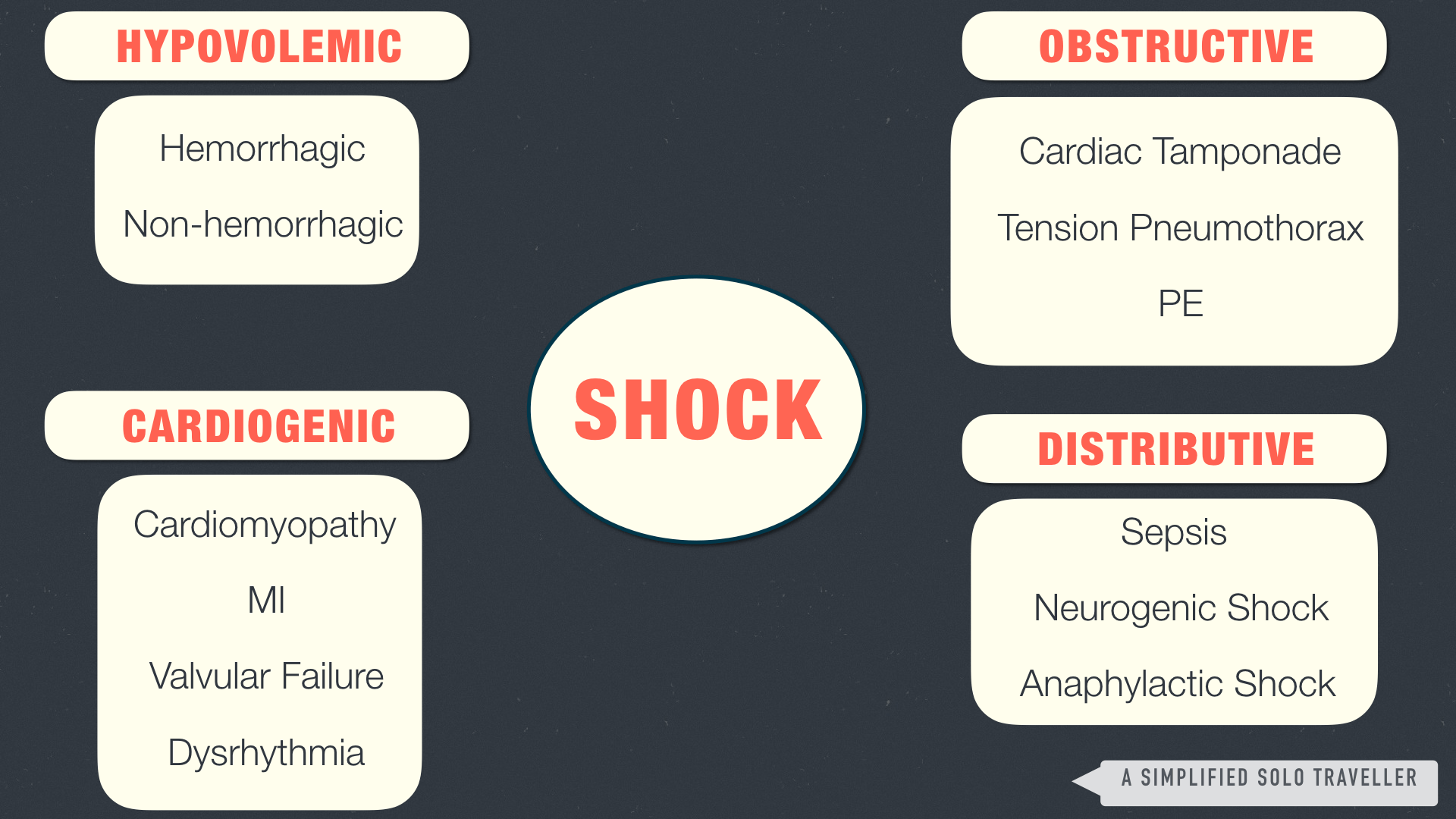 1. Hypovolemic เช่น hemorrhage จาก trauma, GI, intraabdominal หรือ rupture aortic aneurysm, หรือ dehydration สิ่งที่พบคือ Hypercontractile heart, small chamber, flat IVC และพบสาเหตุของ fluid loss ใน pleural, peritoneal และ aortic dissection