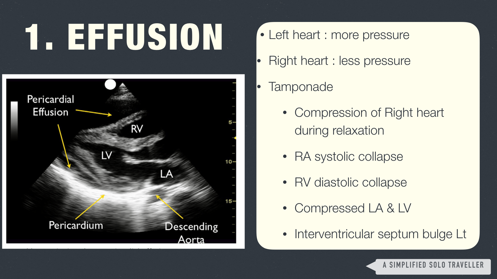 ❤️ Cardiac Effusion – cardiac tamponade จะมี Left heart pressure > Right heart pressure ดังนั้นจะพบ Right Atrium systolic collapse, Right Ventricle diastolic collapse, Left Atrial & Ventricle collapse, interventricular septum bulging to left side และ swinging heart