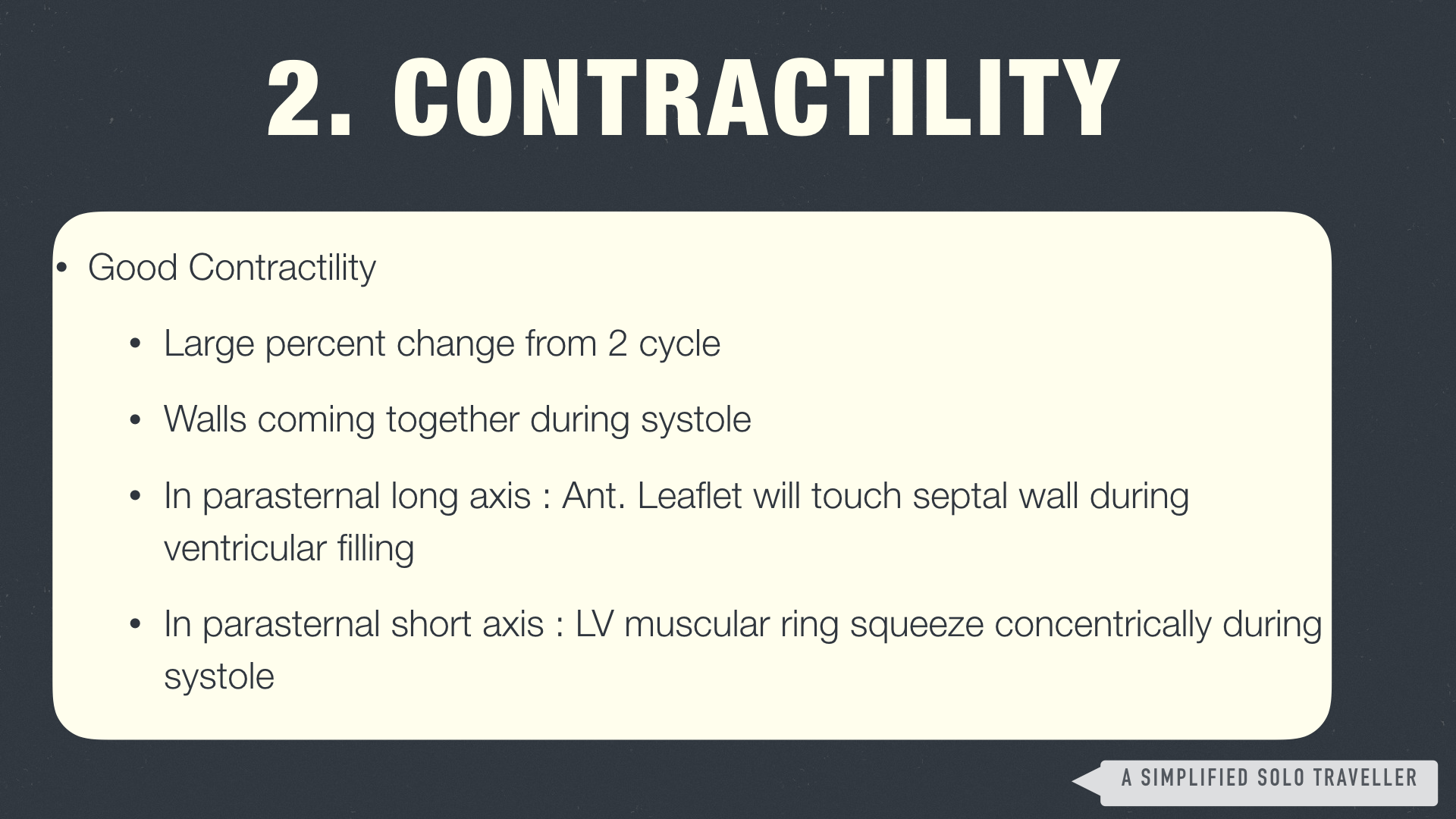 ❤️ Is the pump strong? – ดู heart contractility โดยเทียบระหว่างช่วง systole และ diastole, wall ขยับเท่าๆ กันและบีบตัวสุดในช่วง systole ใน parasternal long axis จะดูช่วงที่ anterior leaflet แตะ septal wall และใน parasternal short axis จะดูช่วงที่ Left Ventricle muscular ring บีบตัวเข้าหากัน