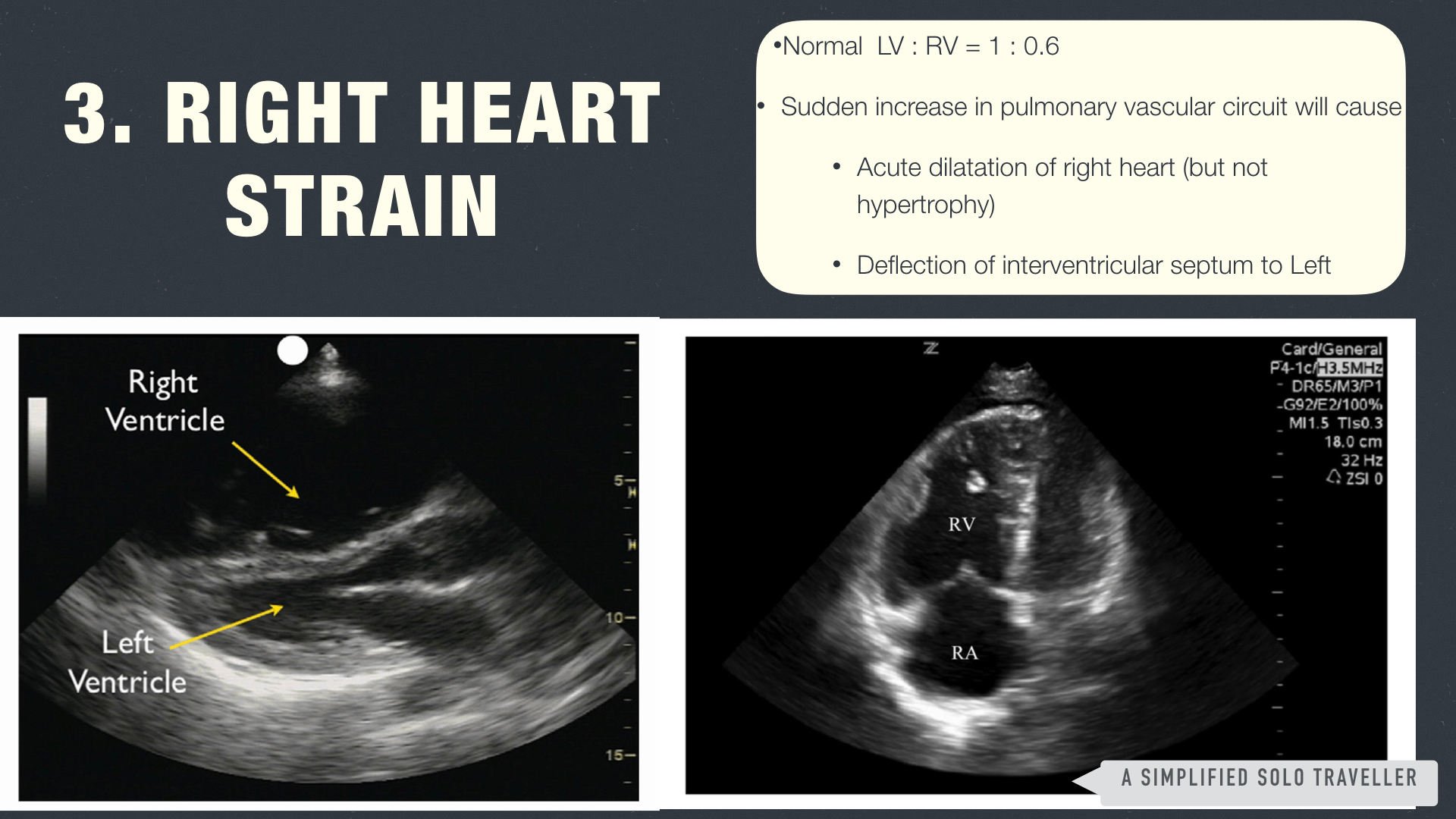 ❤️ Strain of pump – right ventricular strain for pulmonary embolism เช่น Right Atrium & Ventricular dilatation (แต่ไม่ใช่ hypertrophy เพราะไม่งั้นอาจเป็น chronic pulmonary hypertension) สัดส่วนปกติของ Left ventricle ต่อ Right ventricle คือ 1 : 0.6 (จำง่ายๆ ว่า LV ต้องใหญ่กว่า RV) มี deflection of interventricular septum to left, Left Ventricular D-Shape หรืออาจพบ intra-cardiac thrombus เป็นต้น