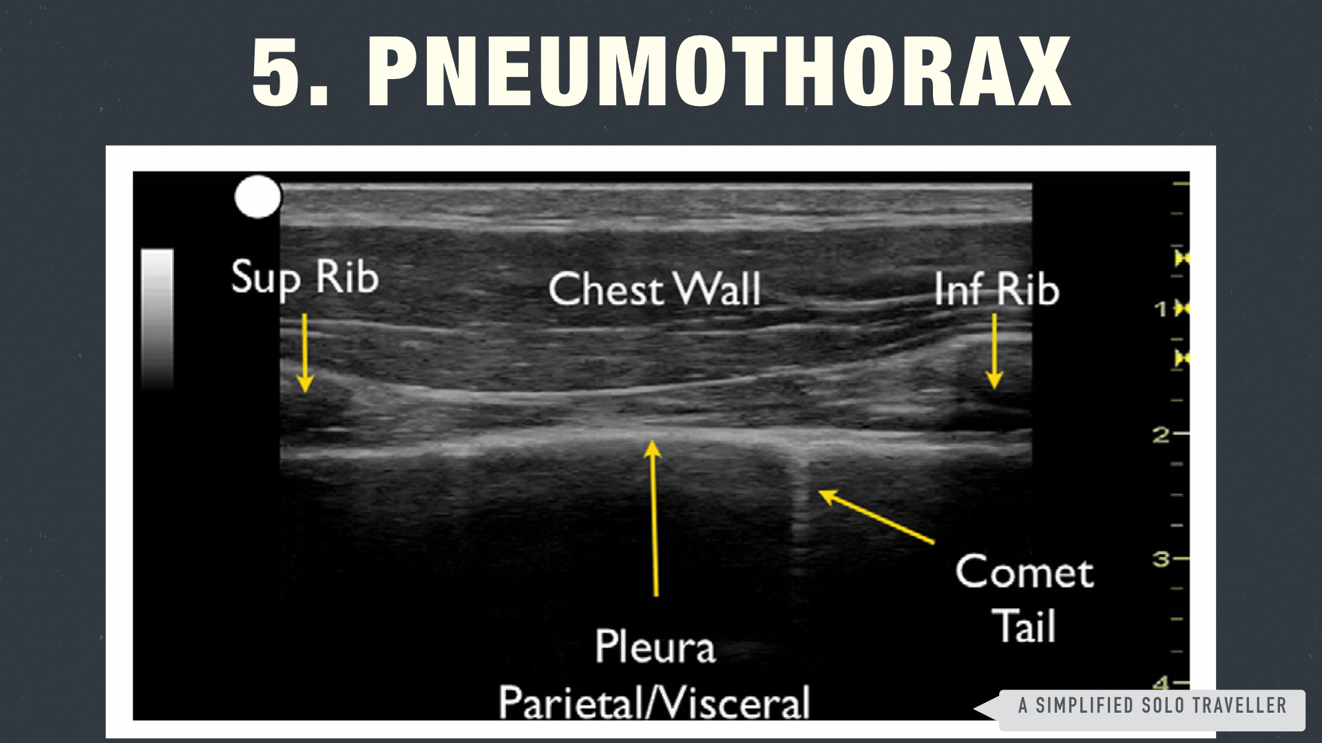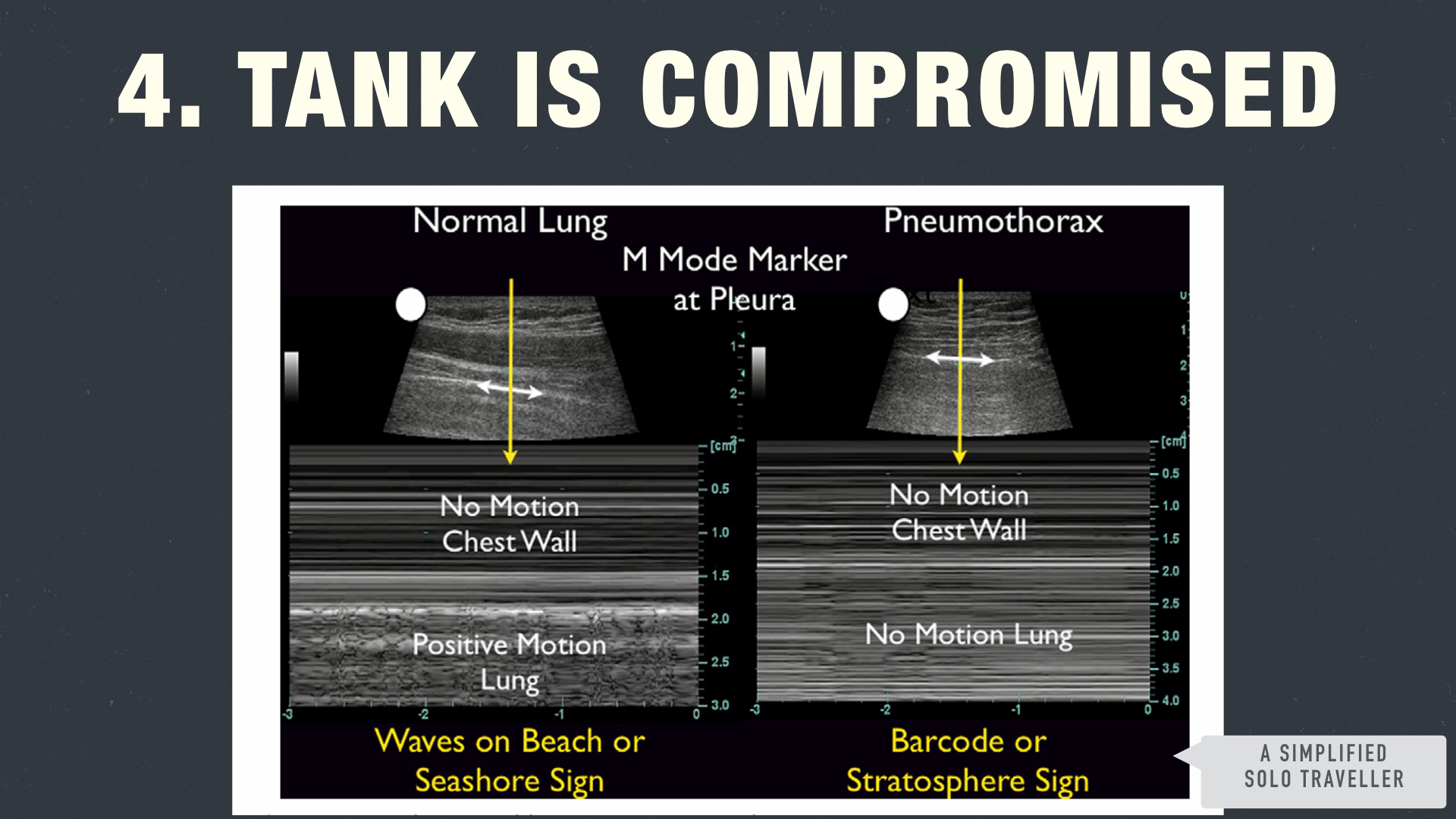 🥃 Tank is compromised เช่นมี pneumothorax ใช้ linear probe ดูที่ 3-5 intercostal space midclavicular line ให้ดู lung sliding sign, lung point และ barcode/stratosphere sign