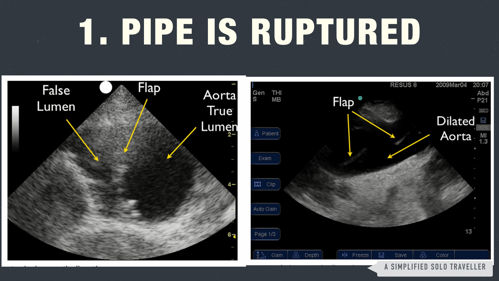 🚿 Pipe is ruptured ใช้ curvilinear probe ดูที่ aorta เช่นมี ruptured aortic aneurysm โดยจะพบขนาด aorta > 3 cm, aortic root dilatation, intimal flap, aortic regurgitation และ pericardial effusion