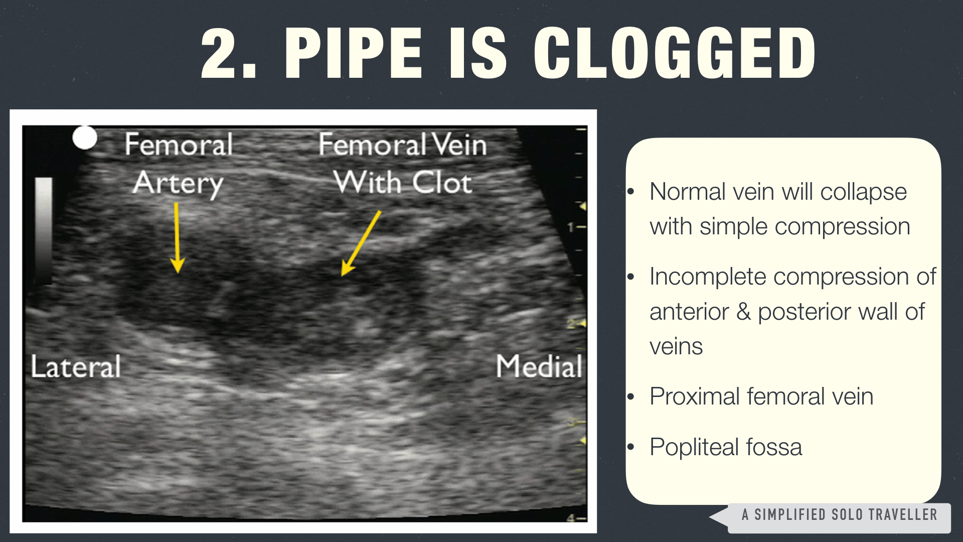 🚿 Pipe is clogged ใช้ linear probe ดูที่ vein เช่น deep vein thrombosis ใน normal vein จะกดแล้วสุด (collapse with compression) แต่ถ้ากดไม่ได้แสดงว่าอาจมี clot อยู่ ถ้าไม่มั่นใจสามารถเปิดดู flow ได้ โดยจะดูคร่าวๆ ที่บริเวณ common femoral vein ใต้ต่อ inguinal ligament และที่ popliteal fossa