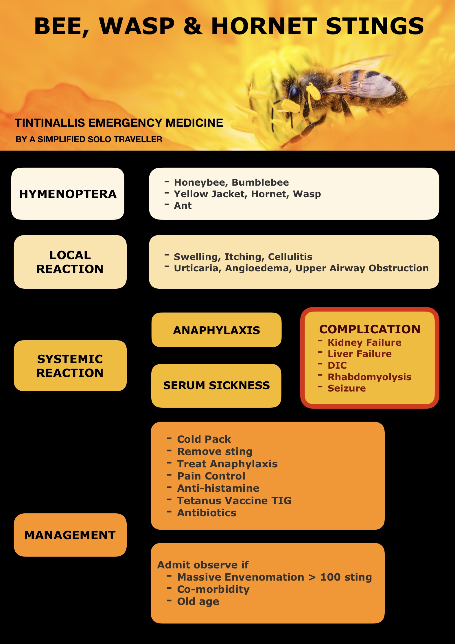 ในคนไข้ที่โดนผึ้ง ต่อ แตนต่อย ให้หา life-threatening condition เช่น Anaphylaxis ในรายที่โดนต่อยเยอะมาก ให้ระวัง Complication เช่น AKI, Liver Failure, DIC, Rhabdomyolysis คนไข้จะแย่ลงเร็วมาก อาจต้อง Hemodialysis หรือ Alkalinize Urine ร่วมด้วย อย่าลืมเอาเหล็กในออก ฉีดยาแก้ปวด ยาแก้แพ้ วัคซีนบาดทะยัก ยาฆ่าเชื้อด้วย