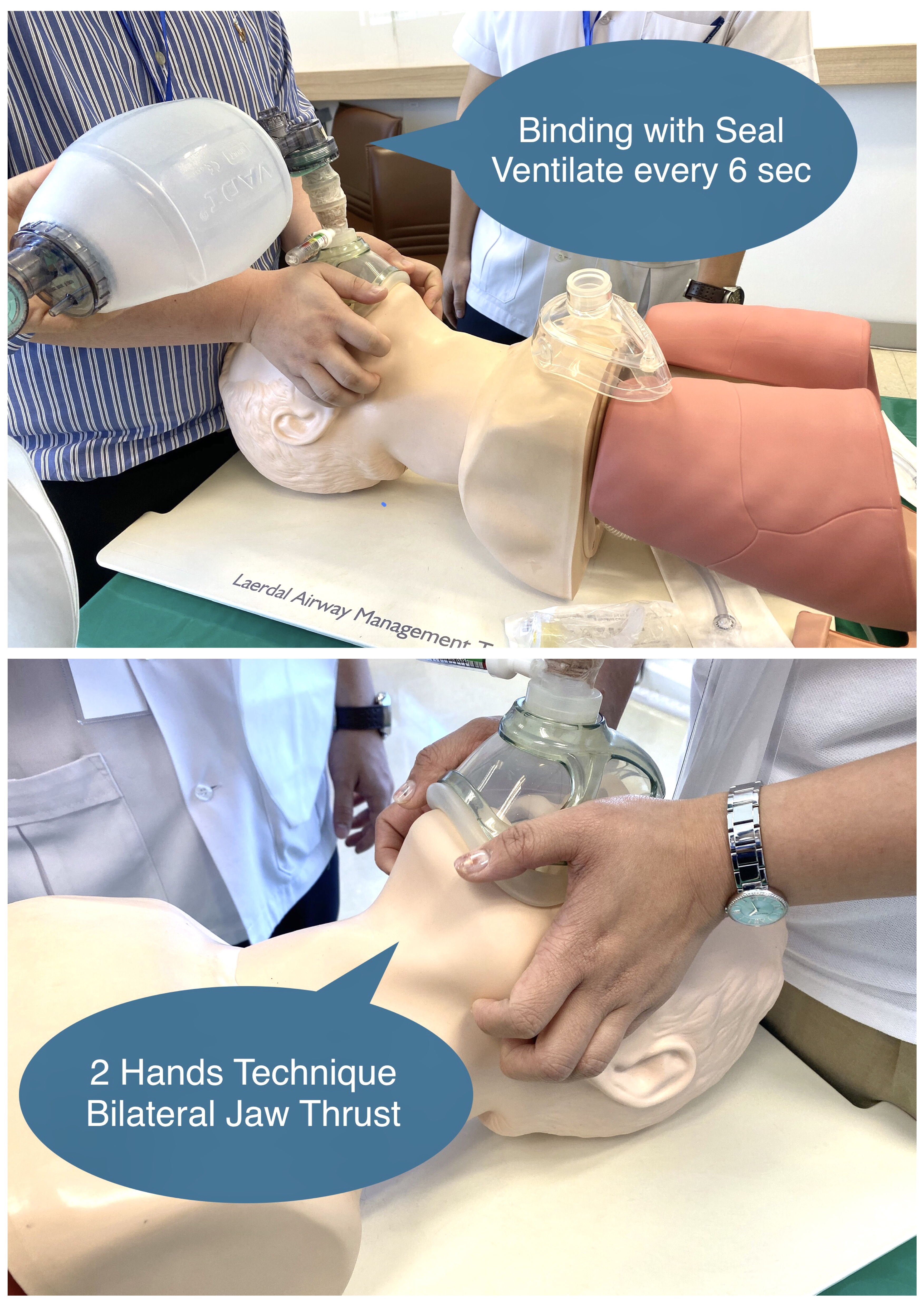 ⁃ 2 Hand Technique ใช้สองมือดีที่สุด เอาหัวแม่โป้งทั้งสองอันชี้ไปที่เท้าผู้ป่วย แล้วออกแรงโดยใช้ฝ่ามือกดที่ Mask ส่วนนิ้วที่เหลือให้ทำ Bilateral Jaw Thrust ดังนั้นต้องมีคนช่วยบีบเสมอ