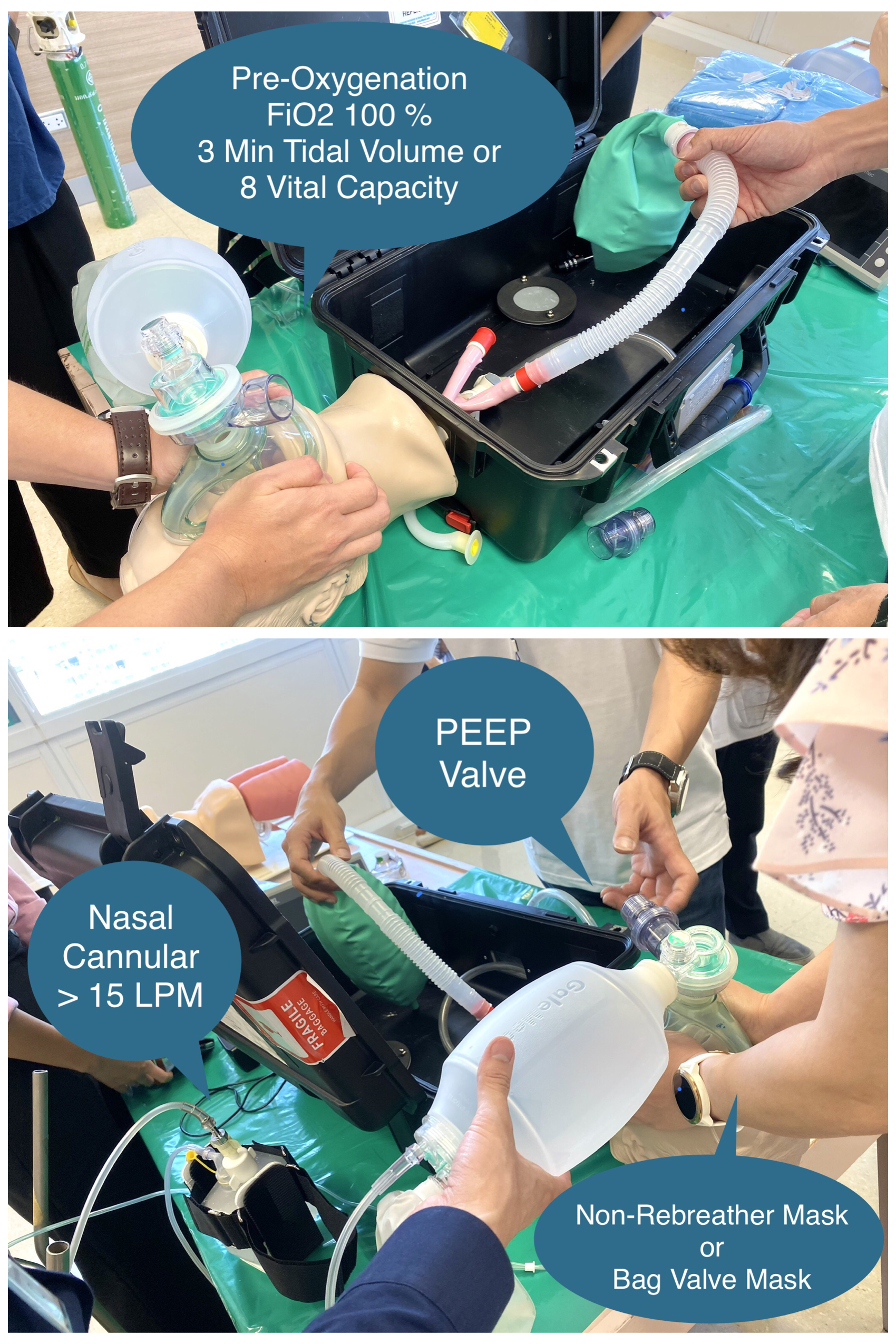 ⁃ Nasal Cannular Flush Rate > 15 LPM 3-5 min (เพื่อให้มี Apneic Oxygenation และ มี PEEP/CPAP 6-8 cm H2O ) ใช้ควบคู่กับ Non-Rebreathing Mask 15 LPM (มี Mask Seal Leak ให้อย่างเดียวเลยไม่พอ)