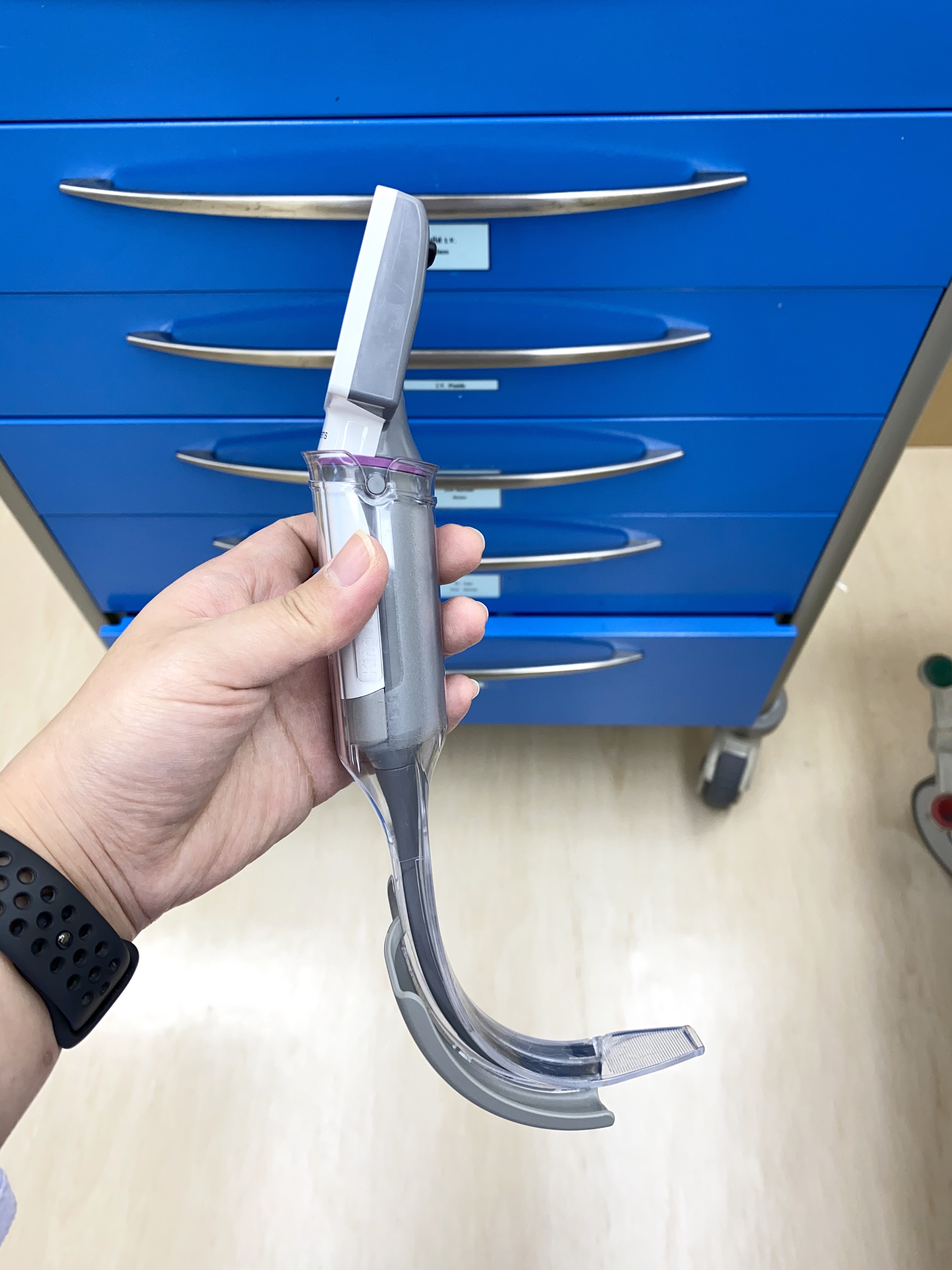 ☝🏻 ด้วยความที่เครื่อง King Vision ค่อนข้างยาว เวลาใส่อาจจะไปงัดกับทรวงอก แนะนำว่าอาจจะใส่ Blade เข้าไปอย่างเดียวก่อน แล้วค่อยต่อกับตัวเครื่องทีหลัง หรืออาจจะใส่กลับหลังแบบ Oropharyngeal Airway แล้วค่อยหมุน 90 องศาอีกที