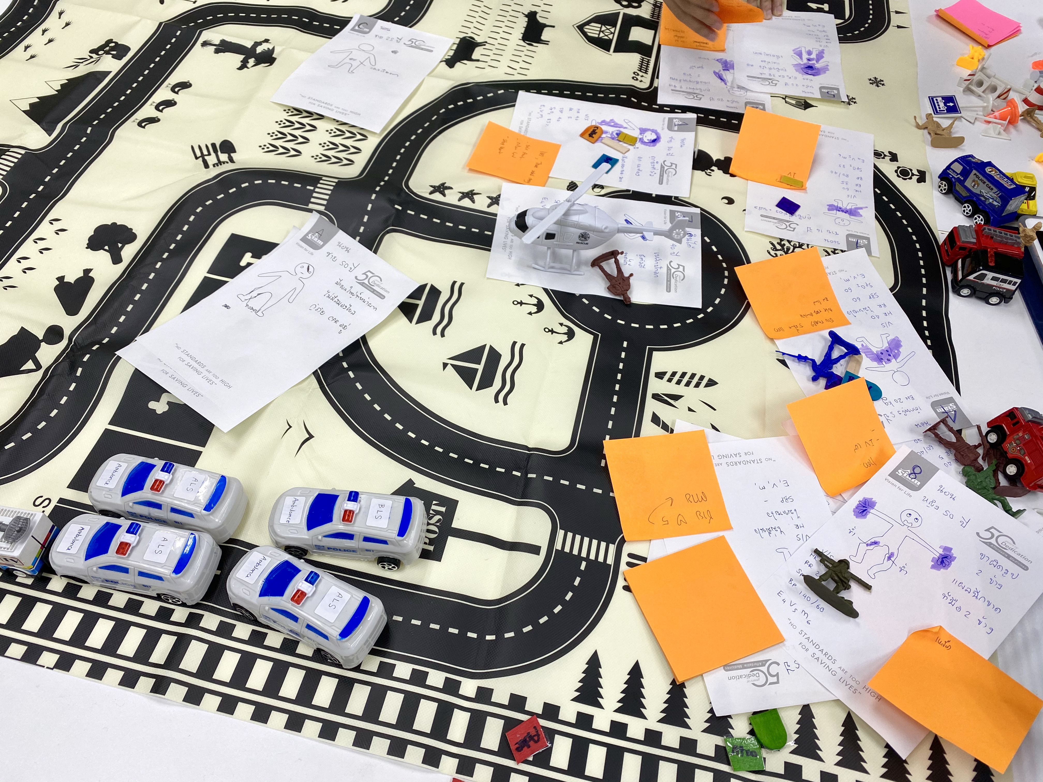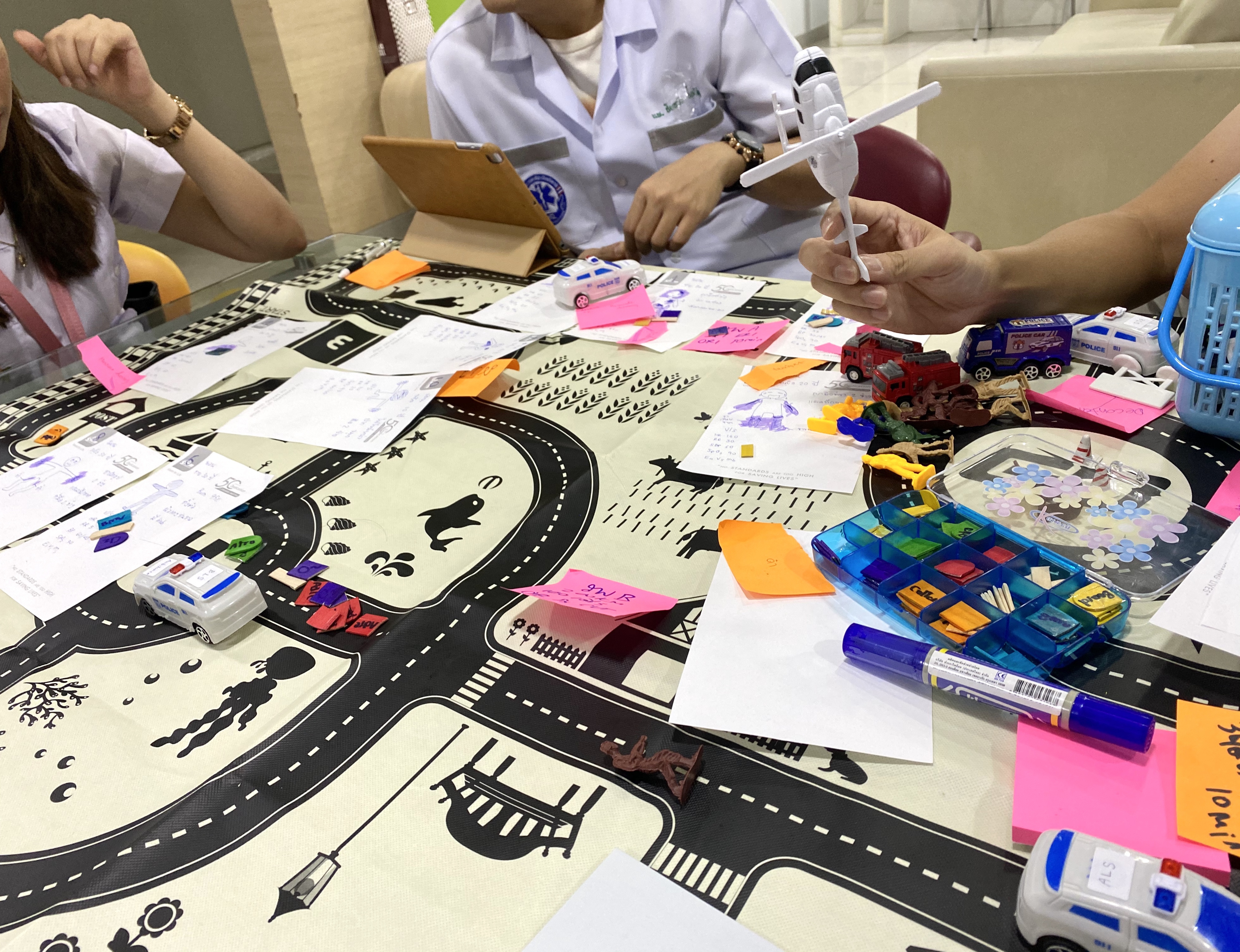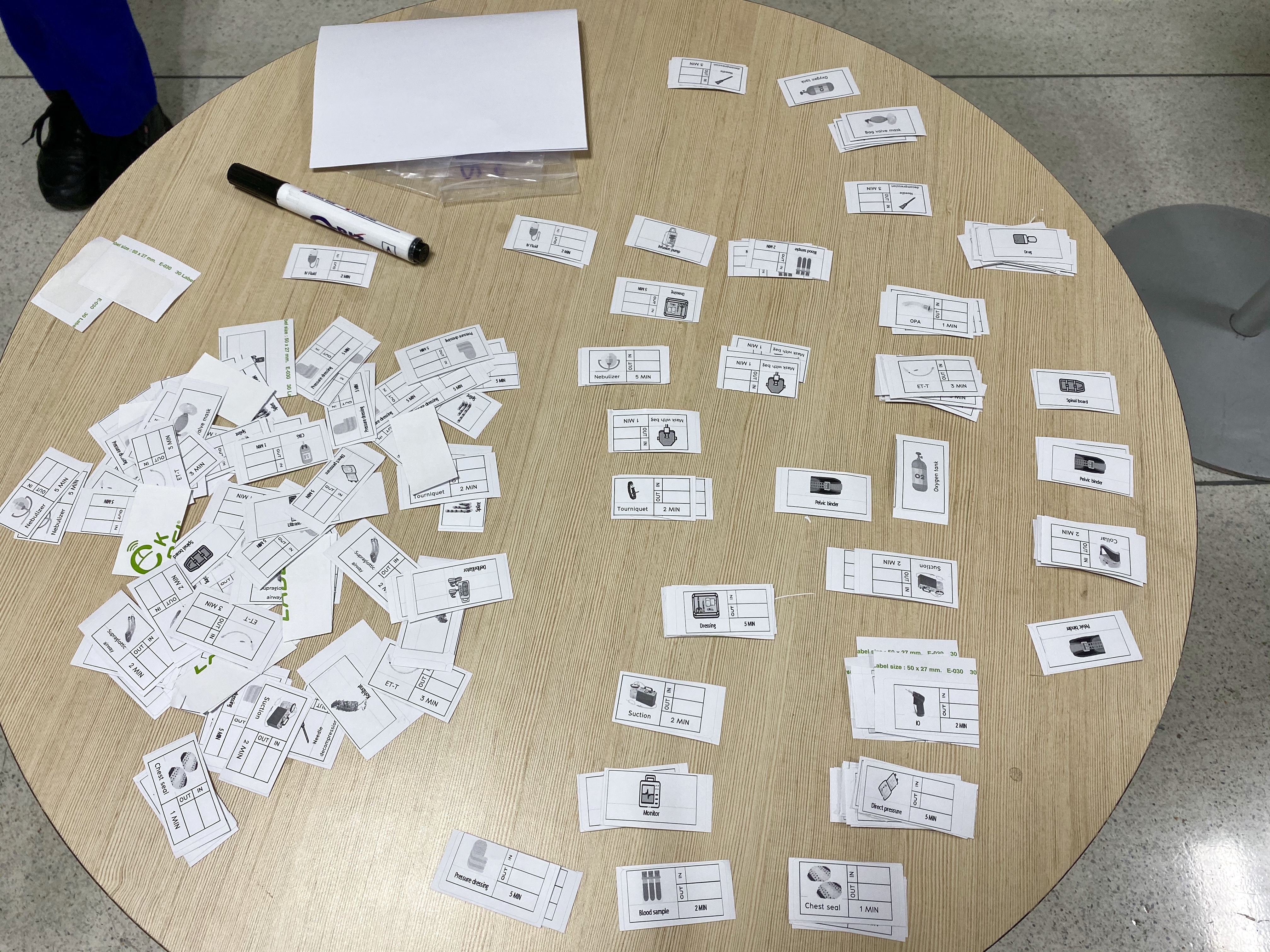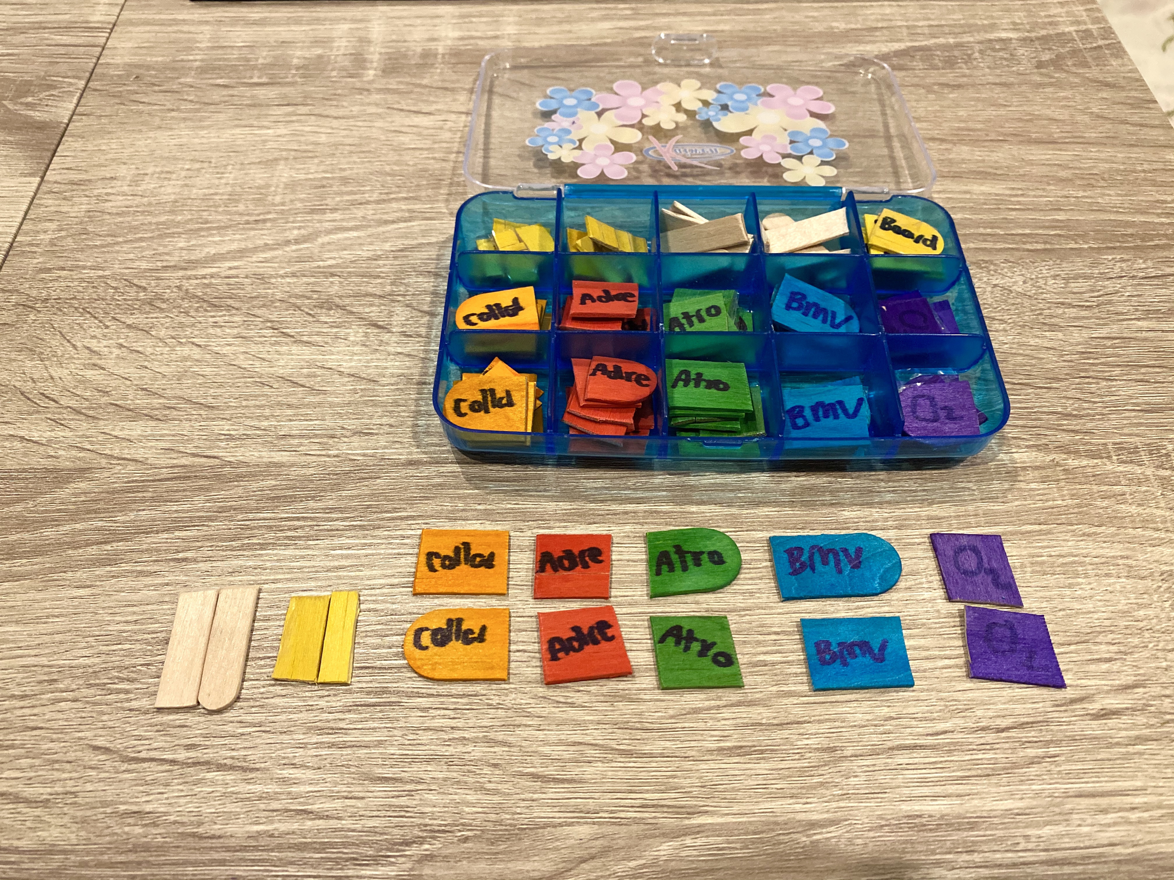 📌 ไม้ไอติมตัดเป็นชิ้นแทนทรัพยากร เพราะต้องการให้จัดการเหตุภายใต้ทรัพยากรที่ไม่พียงพอ เช่น ไม้ไอติมสีฟ้าแทน Bag Mask Ventilation (แอมบู) หากรถพยาบาลไปออกเหตุ จะให้มีแค่คันละ 1-2 ชิ้นเท่านั้น ถ้าใช้ไปแล้วถือว่าของหมด นอกจากนี้ ควรกำหนดระยะเวลาของการทำหัตถการด้วย เช่นใส่ท่อช่วยหายใจใช้เวลา 5 นาที (ในระหว่าง 5 นาทีนี้ห้ามทำกิจกรรมอื่น) ถ้าคนที่มีกำลังทรัพย์ ก็สามารถ DIY อุปกรณ์ให้มีความเสมือนจริง เช่นใช้ตุ๊กตาคนทาสีแดงตามแขนขา เอากระดาษลังมาทำ Spinal Board หรือปริ้นรูปท่อช่วยหายใจมาแปะใส่กระดาษแข็งเป็นต้น