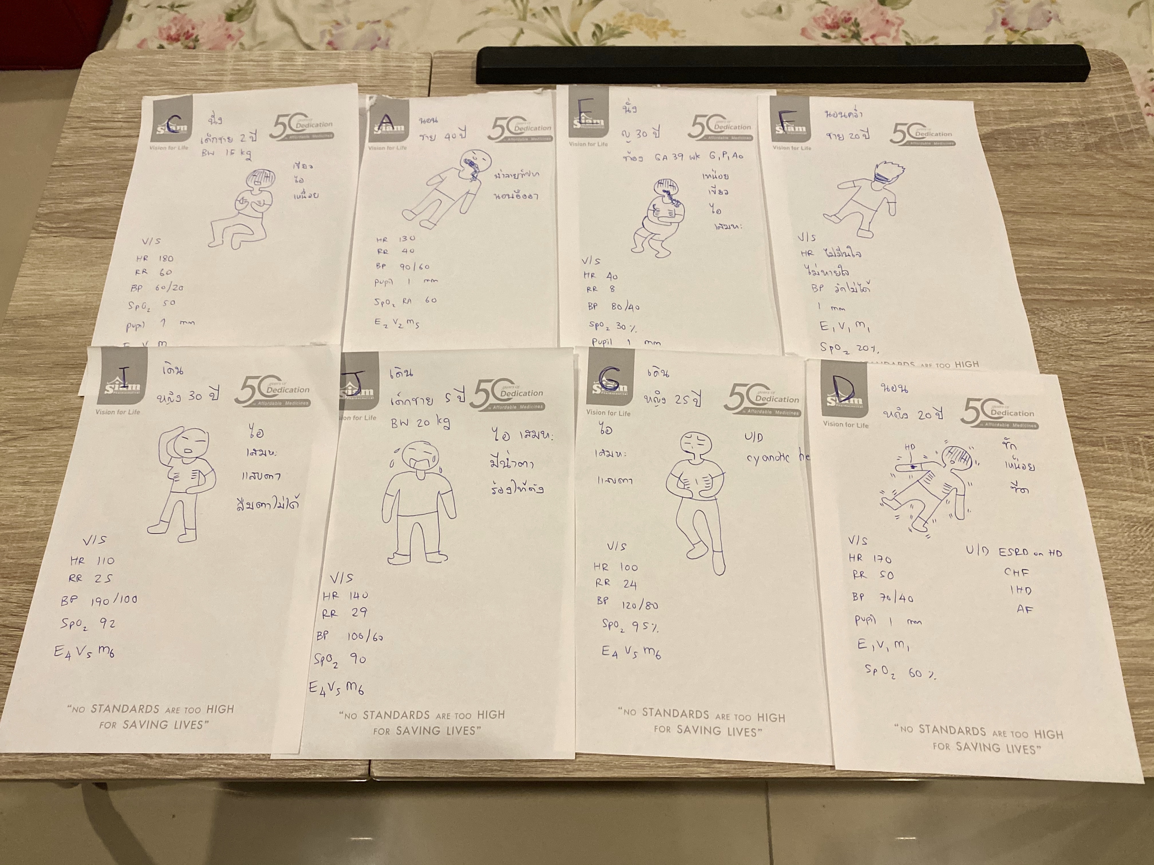 📌 แผ่นกระดาษตุ๊กตาระบุข้อมูลผู้ป่วย วาดรูปให้เห็นภาพ ใส่บาดแผลเข้าไป เช่นโดนมีดแทง แขนขาดขาขาด เลือดนองปริมาณมาก ถ้าวาดไม่เป็นก็ปริ๊นรูปจากอินเตอร์เน็ทได้ ใส่ Vital Signs spO2 GCS เพื่อประกอบการ Triage
