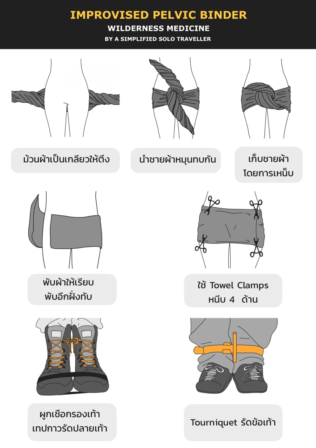 📌 นอกจากนี้ เนื่องจากเราต้องการให้ขาทั้งสองข้างชิดกันมากที่สุด (Internal Rotation) ดังนั้นจึงควรพันผ้าที่ข้อเท้า หรือ ปลายเท้าด้วย โดยปกติมักใช้ Elastic Bandage กัน แต่เราสามารถใช้ Tourniquet, เชือก, เทปกาว หรือเชือกรองเท้ามาประยุกต์แทนได้