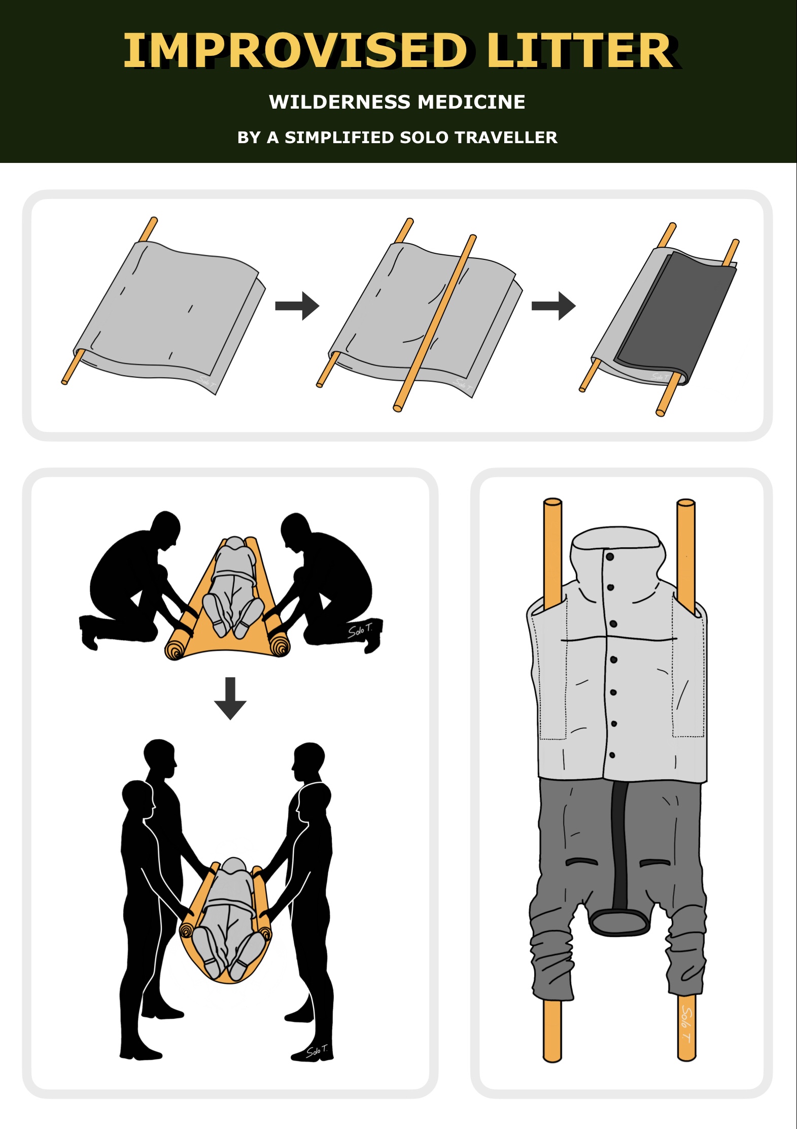💛 เปลหามแบบนี้เหมาะสำหรับการเคลื่อนย้ายผู้ป่วยที่อาการไม่หนักมาก ใช้ในภูมิประเทศที่ไม่โหดร้ายนัก เน้นแนวราบ นอกจากนี้ ไม่ควรใช้ในคนไข้ที่สงสัยการบาดเจ็บของกระดูกคอ ประยุกต์ได้หลายวิธี