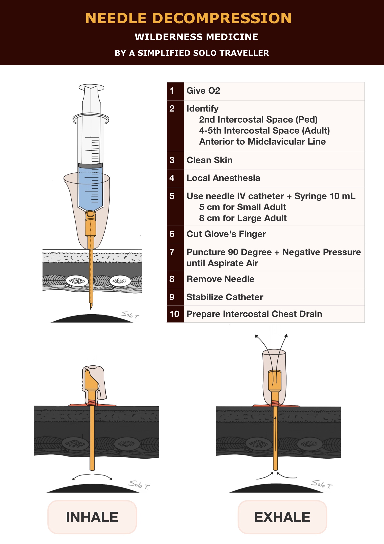 💨 การเจาะปอดเพื่อแก้ไข Tension Pneumothorax ในสถานที่ทุรกันดาร จะทำในกรณีที่มี Shock, เส้นเลือดที่คอโป่ง, หลอดลมถูกดันไปด้านตรงข้าม, เสียงปอดเบาลง และเคาะปอดโปร่ง โดยโรคนี้วินิจฉัยจากประวัติและตรวจร่างกาย เป็น Clinical Diagnosis ไม่ต้องใช้ Film Confirm สามารถทำได้ดังนี้