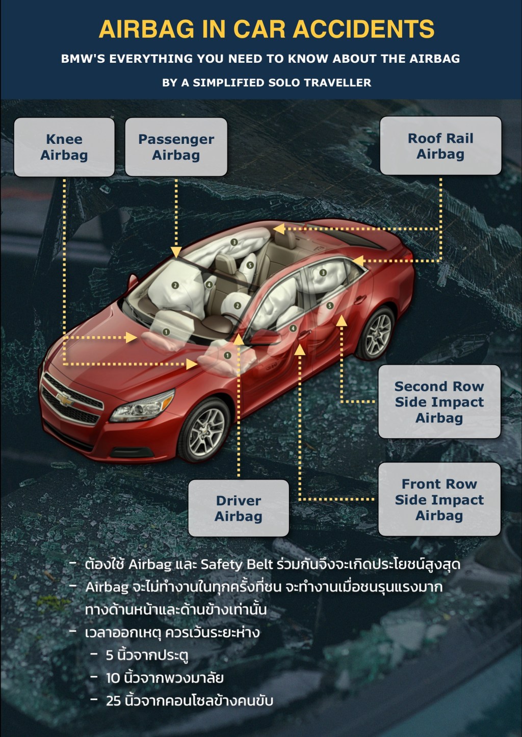 ✅ ต้องใช้ Airbag และ Safety Belt ร่วมกันถึงมีประสิทธิภาพสูงสุด ถ้าไม่รัดเข็มขัด ตัวก็จะกระแทกกับถุงลมนิรภัย บาดเจ็บมากขึ้นอีก