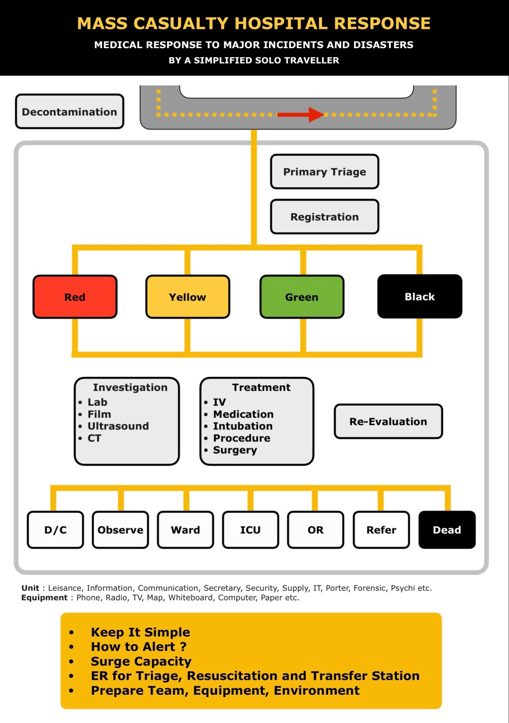 ⭐️ ER – แต่งตั้งหัวหน้า ควรเป็นคนที่มีประสบการณ์สูงสุด Staff ER มีหน้าที่ Primary Triage คัดกรองคนที่ด่วนและไม่ด่วน ให้เคลียเตียง Admit / Observe / Discharge งดรับผู้ป่วยทั่วไปที่ไม่ฉุกเฉิน ประกาศแจ้งผู้ป่วยที่รอตรวจให้ทราบ หากอาการไม่หนักแนะนำให้ตรวจวันอื่น เตรียมทรัพยากรให้พร้อม เช่นเวชภัณฑ์ ยา เลือด หยิบใช้ง่ายในยามที่ต้องการ กรณีทราบว่าผู้ป่วยจะมากี่โมง ควรรวมพลเจ้าหน้าที่มารอที่ ER จะได้ไม่ล่าช้า เจ้าหน้าที่ใส่ชุดที่บ่งบอกง่ายว่าตำแหน่งอะไร ต้องมีจุดเวชระเบียนเพื่อลงทะเบียนผู้ป่วย อาจใช้แบบฟอร์มกระดาษ แบ่งตามสีแดง เหลือง เขียว ขาว ดำ ทำเป็น Checklist เพื่อความรวดเร็ว ติดป้ายข้อมือกันผู้ป่วยหายหรือหาผู้ป่วยไม่เจอ (มีชื่อ + สี) ถ้าไม่ทราบชื่ออาจต้องถ่ายรูป ต้องรวบรวมเบอร์ติดต่อที่จำเป็นต้องใช้ ถ้าเหตุใหญ่มากต้องตั้งเต๊นเพิ่ม