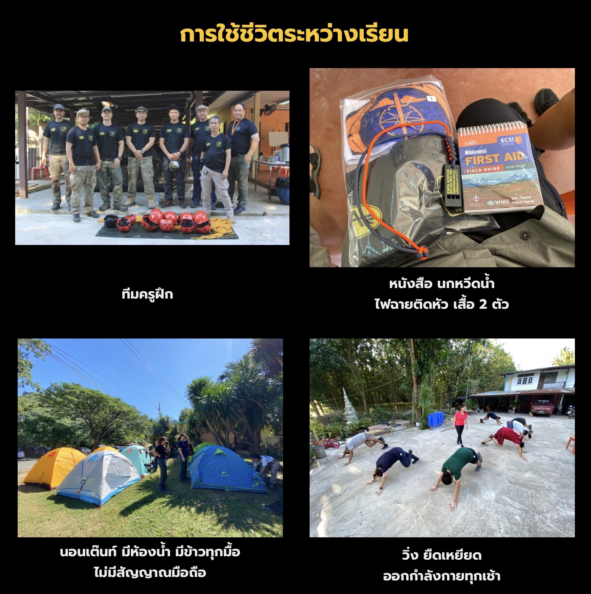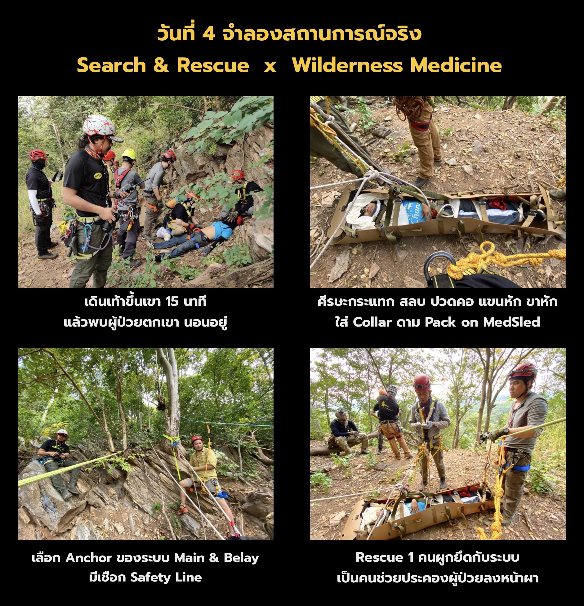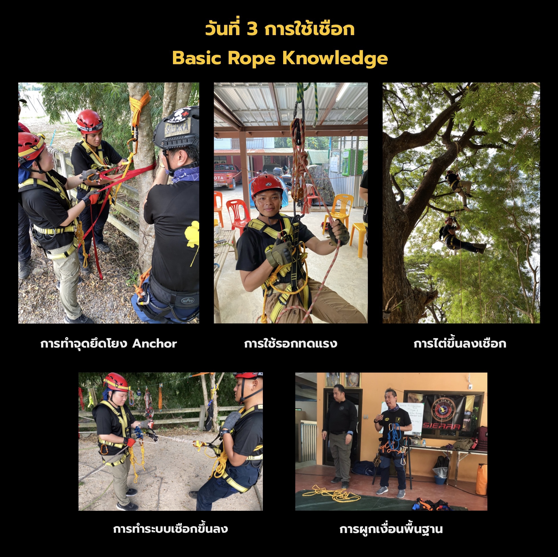 🪢 วันที่ 3 เรียนเรื่องการใช้เชือกขั้นพื้นฐาน ช่วงเช้าอธิบายการผูกเงื่อนชนิดต่างๆ, มีสอนการใช้รอกทดแรง Mechanical Advantage, การไต่เชือกขึ้นลงแบบ Non-Device ด้วย Klemheist Knot ไปจนถึงยอดกิ่งไม้แล้วโรยตัวลงมาด้วยเงื่อนเดิม, การทำระบบเชือกดึงผู้ประสบภัยขึ้นลงเนิน จบท้ายด้วยมอบหมายภารกิจในวันรุ่งขึ้น เป็นสถานการณ์จำลอง มีผู้ป่วยตกเขา ไม่แจ้งรายละเอียดเพิ่มเติม ไม่รู้อาการ ติดอยู่ที่หน้าผาสูง 40 เมตร ทางขึ้นชันมาก ต้องเคลื่อนย้ายผู้ป่วยโดยการโรยตัวลงจากหน้าผาเท่านั้น กลับทางเดิมไม่ได้ หลังจากนั้นต้องใช้ระบบเชือกดึงผู้ป่วยขึ้นเนินชัน 70 องศา ระยะ 5 เมตร จึงจะถึงจุดที่ปลอดภัย นักเรียนคือทีมที่จะเข้าไปช่วยเหลือ ครูฝึกจะไม่ช่วยเลย ให้นักเรียนปฏิบัติเอง จะได้ใช้ทุกอย่างที่เรียนตลอด 3 วัน