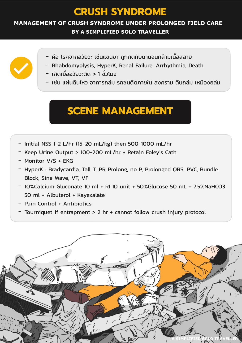 ❤️ Crush Syndrome เกิดเมื่อแขนขาถูกกดทับหนัก+นาน เกิดเร็วสุดใน 1 ชั่วโมง ห้ามเอาผู้ป่วยออกทันที ต้องให้น้ำเกลือก่อน ถ้าเอาออกโดยไม่เตรียมก่อนจะ Cardiac Arrest จาก HyperK ดังนั้นทีมแพทย์ต้องคุยกันกับทีม Rescue