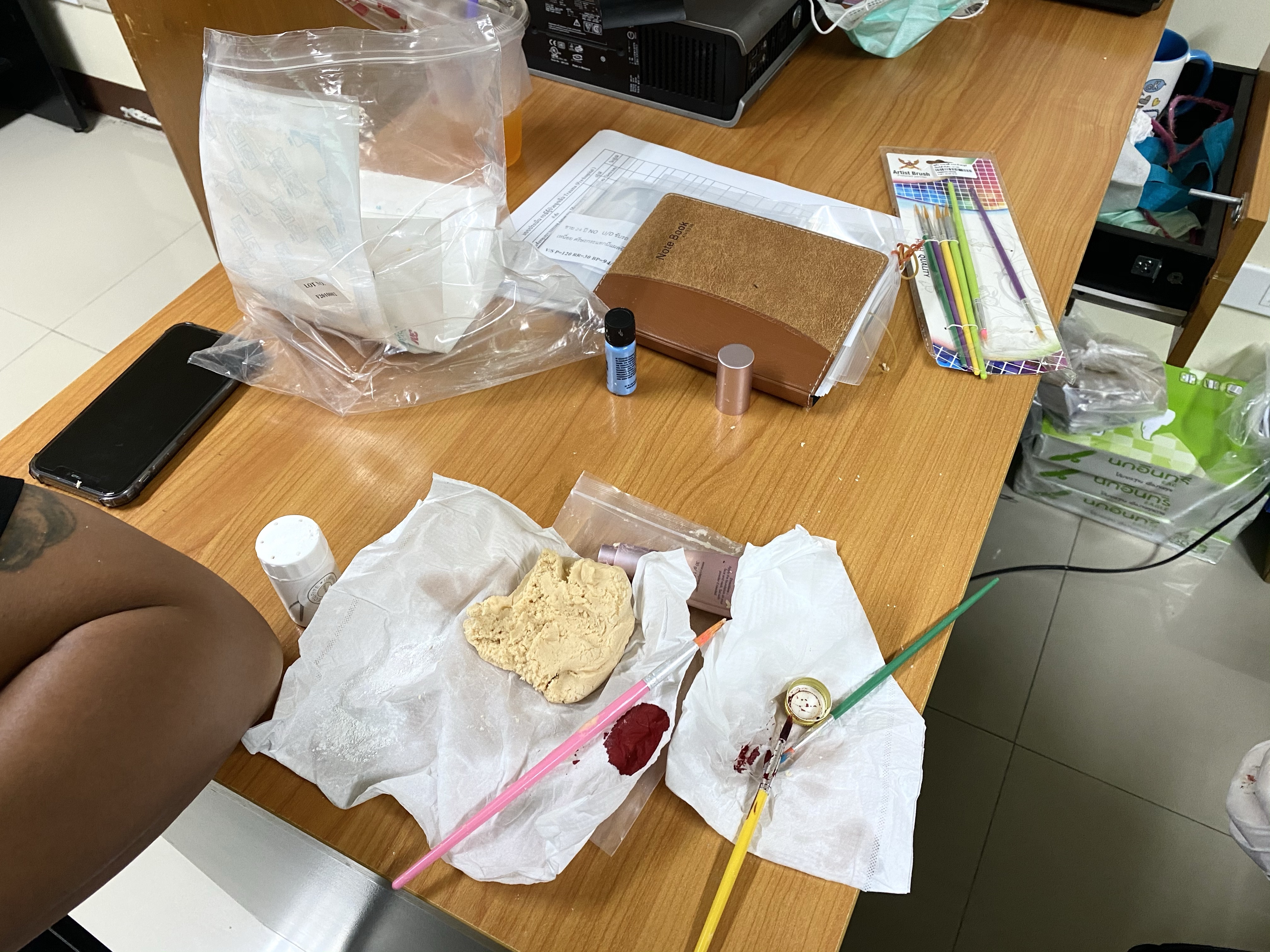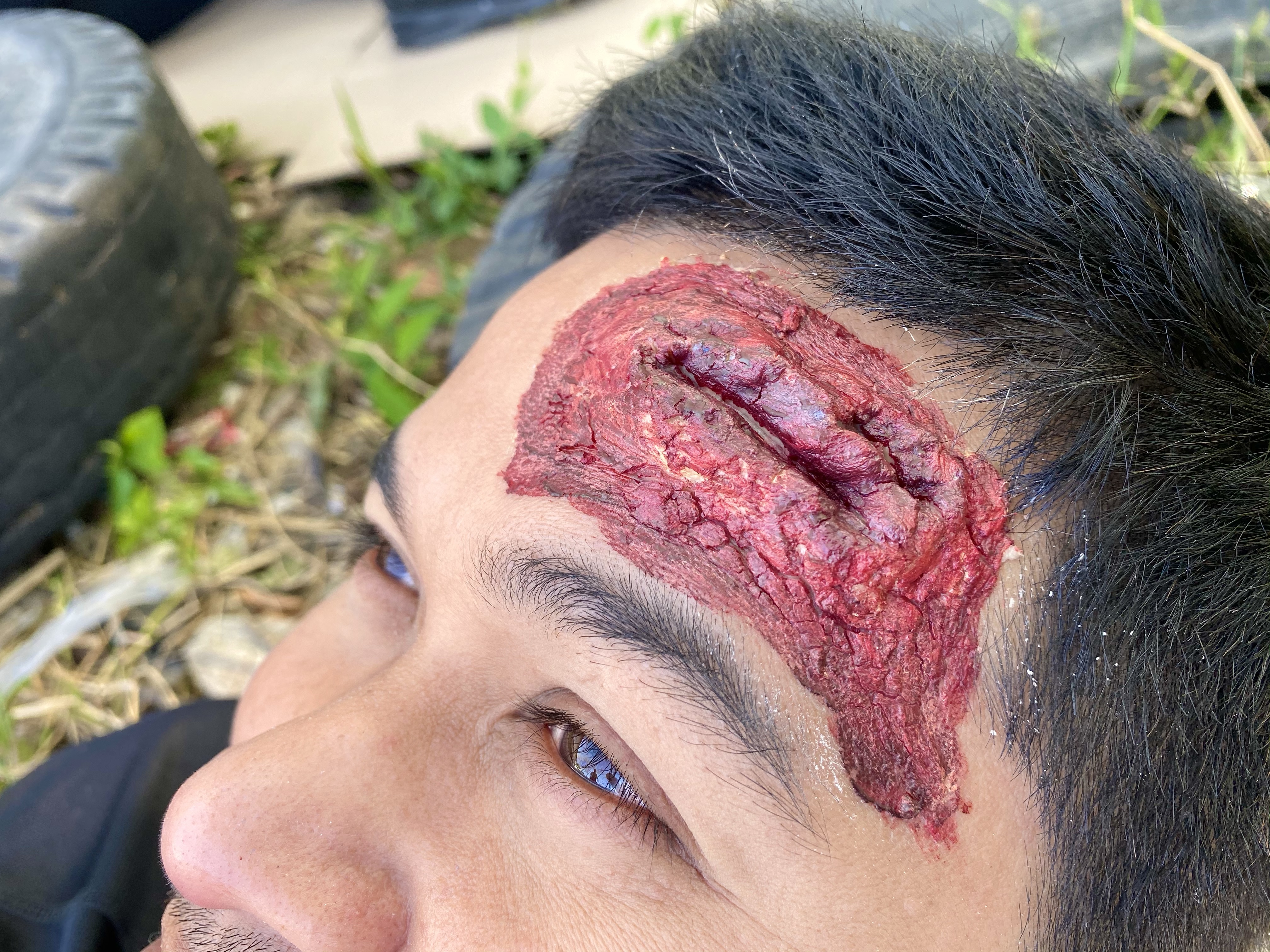 🩸 แผลปลอมทำจากการผสมแป้งข้าวโพด วาสลีน และรองพื้นสีเนื้อเข้าด้วยกัน ปั้นๆๆๆ เป็นก้อนแล้วเกลี่ยบนบริเวณผิวที่ต้องการ ระวังอย่าปั้นก้อนใหญ่ไป มันจะหล่นลงมา จากนั้นเอาสีผสมอาหารสีแดงตกแต่ง อาจจะใช้สีเหลืองกับดำเพิ่มเพื่อความสมจริง