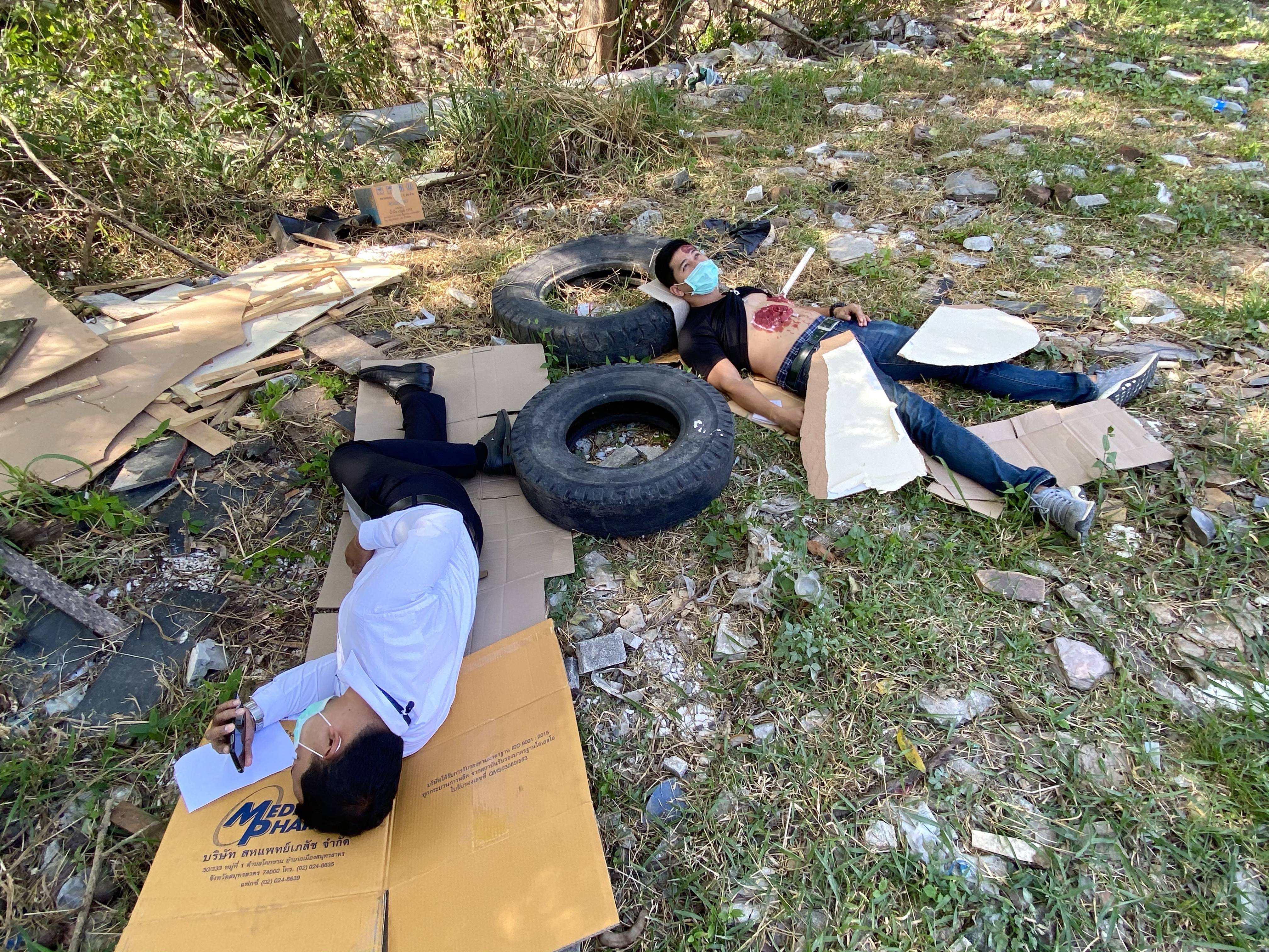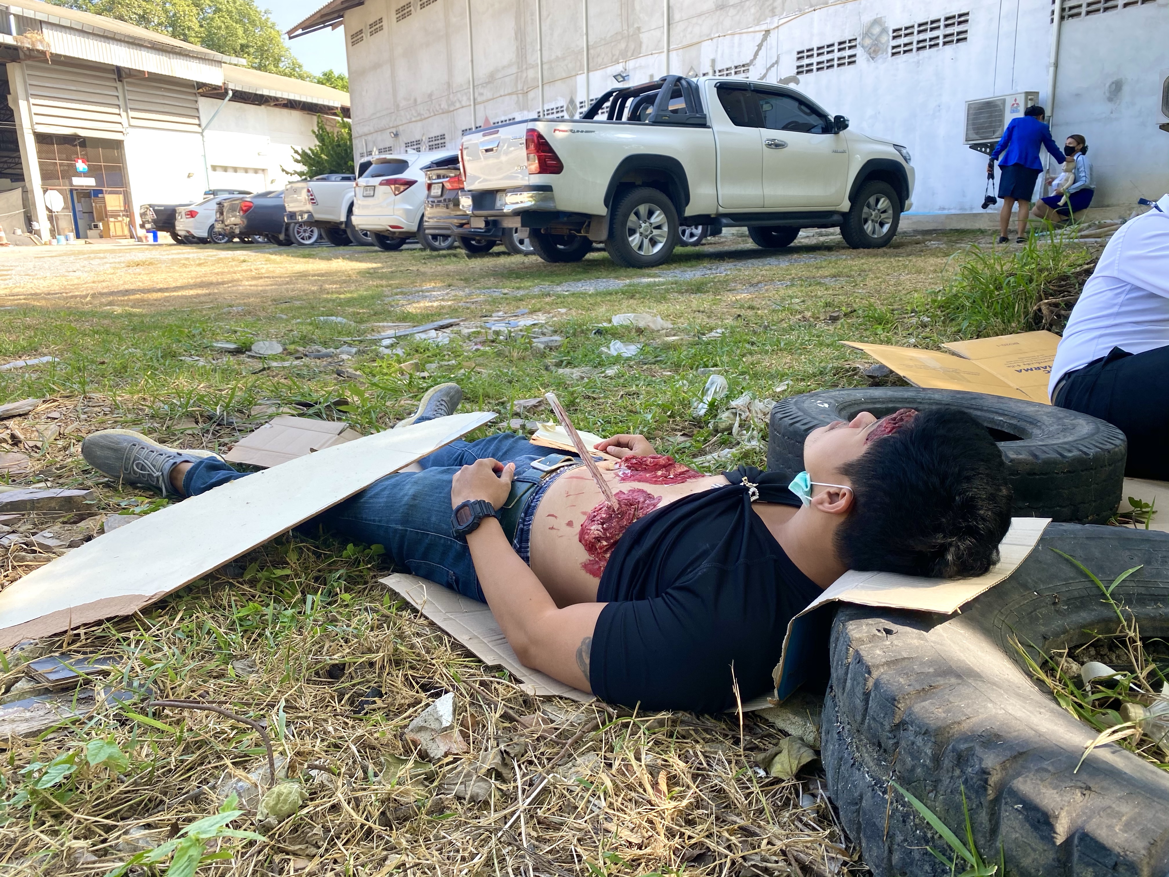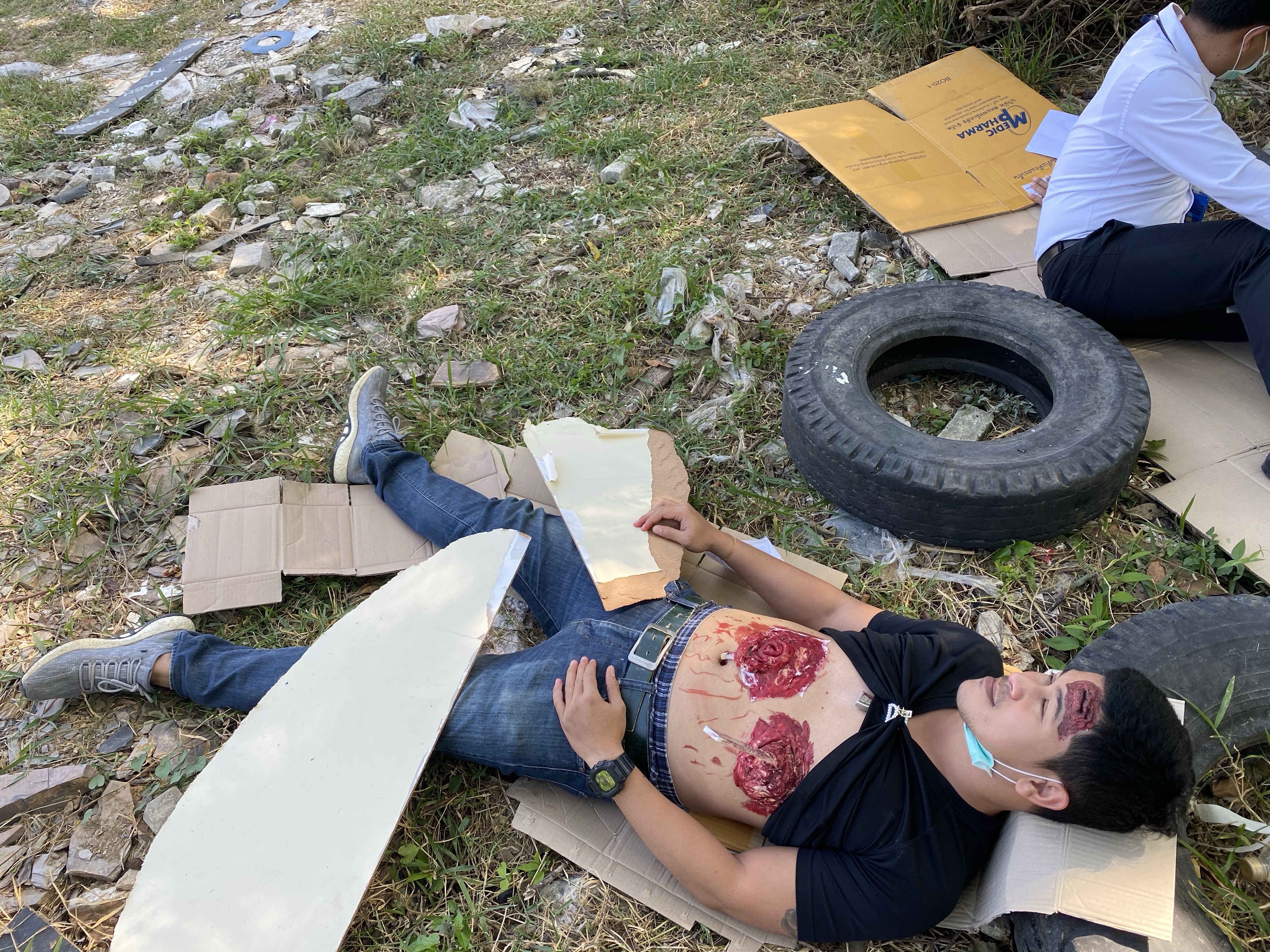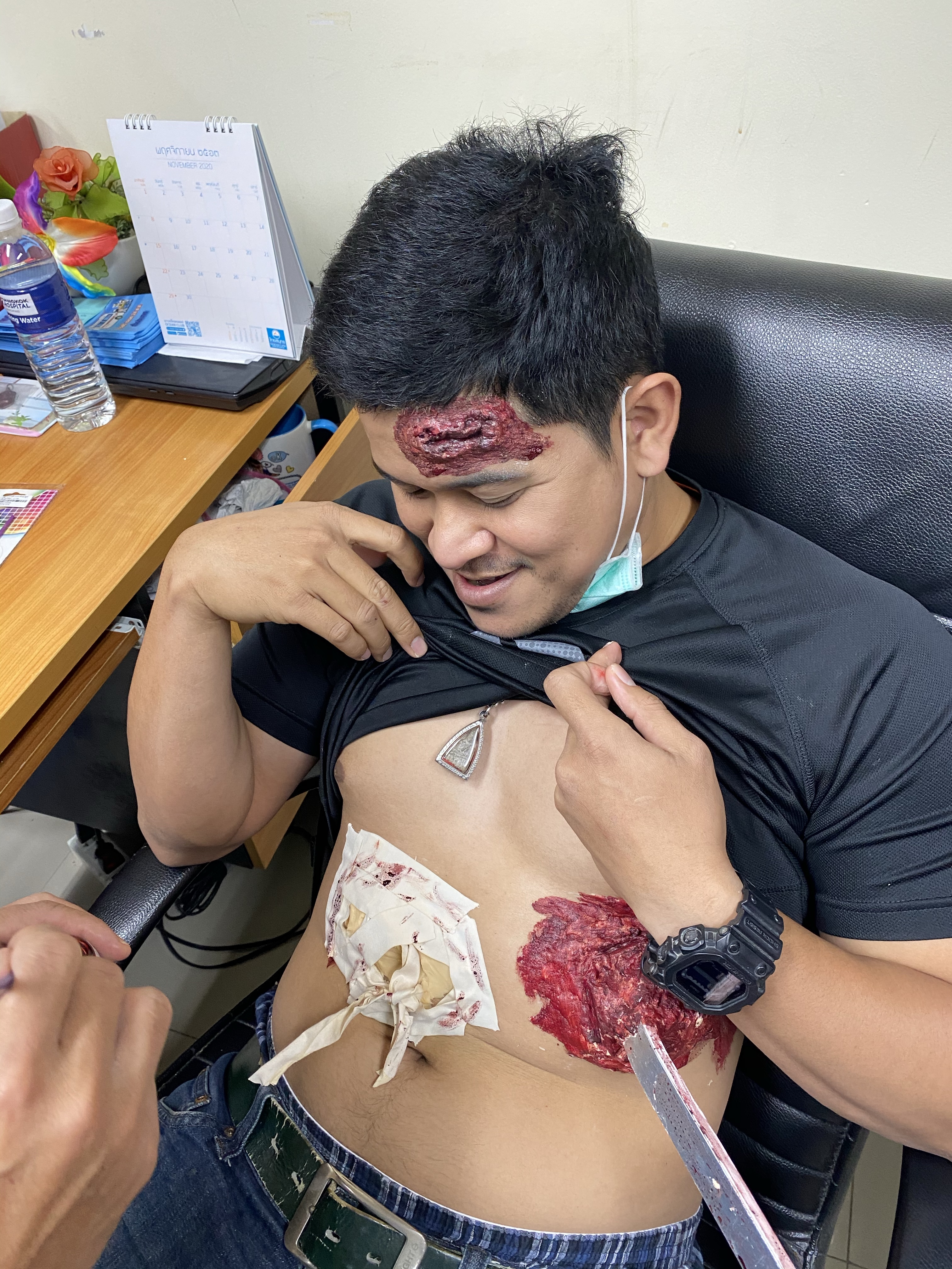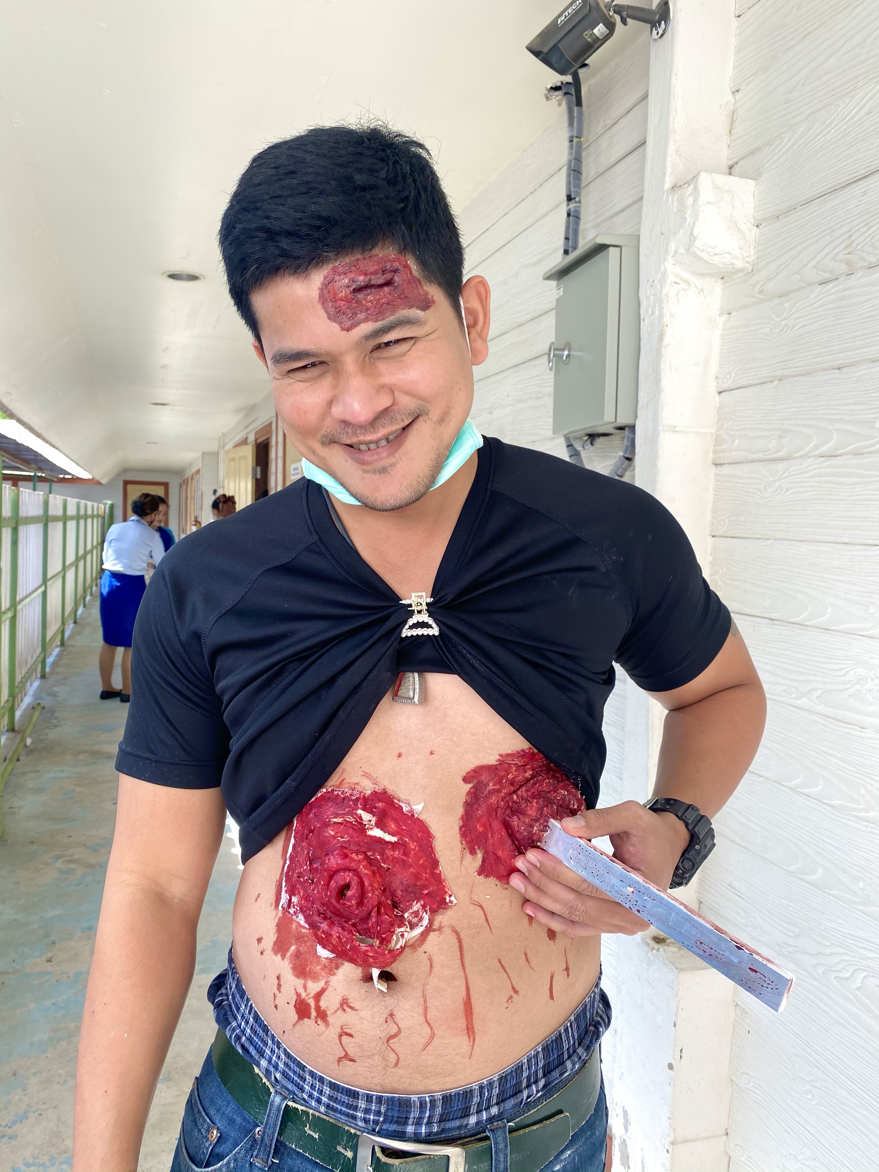 🔪 เคสนี้ถูกเหล็กเสียบที่อก ก็นำ Aluminium Splint มาใช้แทน ส่วนที่ท้องมีแผลเปิด ไส้ไหล ใช้เทปผ้าเหนียว Neo tape แปะเป็นเส้นยาวๆ ถ้าให้เหมือนกว่านี้น่าจะทาไส้เป็นสีเหลืองเพิ่ม