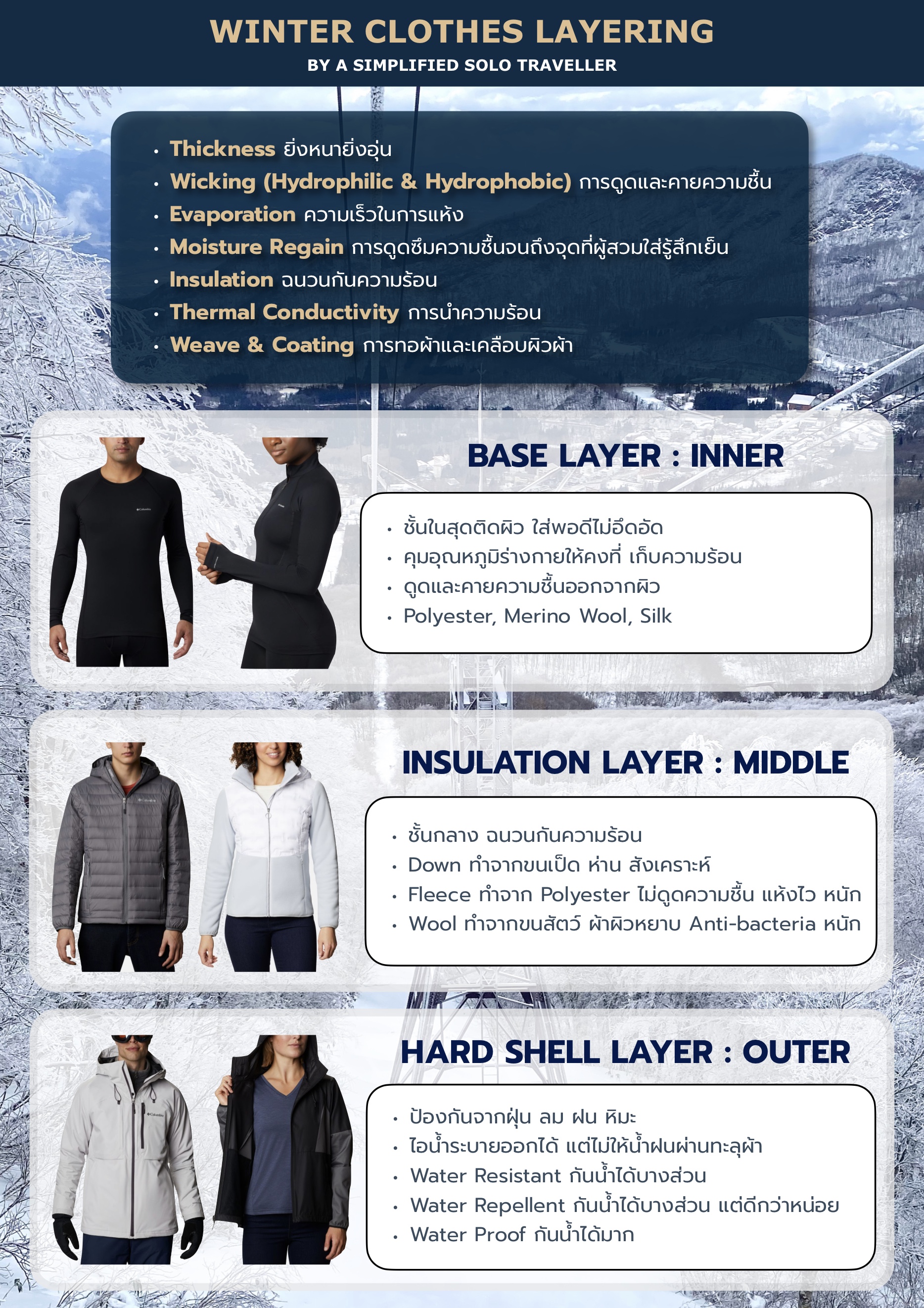 วิธีใส่เสื้อให้อุ่น คือ ใส่ 3 ชั้น ได้แก่ Inner Layer, Middle Layer และ Outer Layer ถ้าอยากให้ร่างกายอุ่น ต้องใส่เสื้อผ้าที่แห้งและเป็นฉนวนกันความร้อนที่ดี ยิ่งผ้าเปียกง่ายและอมน้ำ ยิ่งทำให้หนาว ไม่แนะนำการใส่ผ้า Cotton ในอากาศหนาว