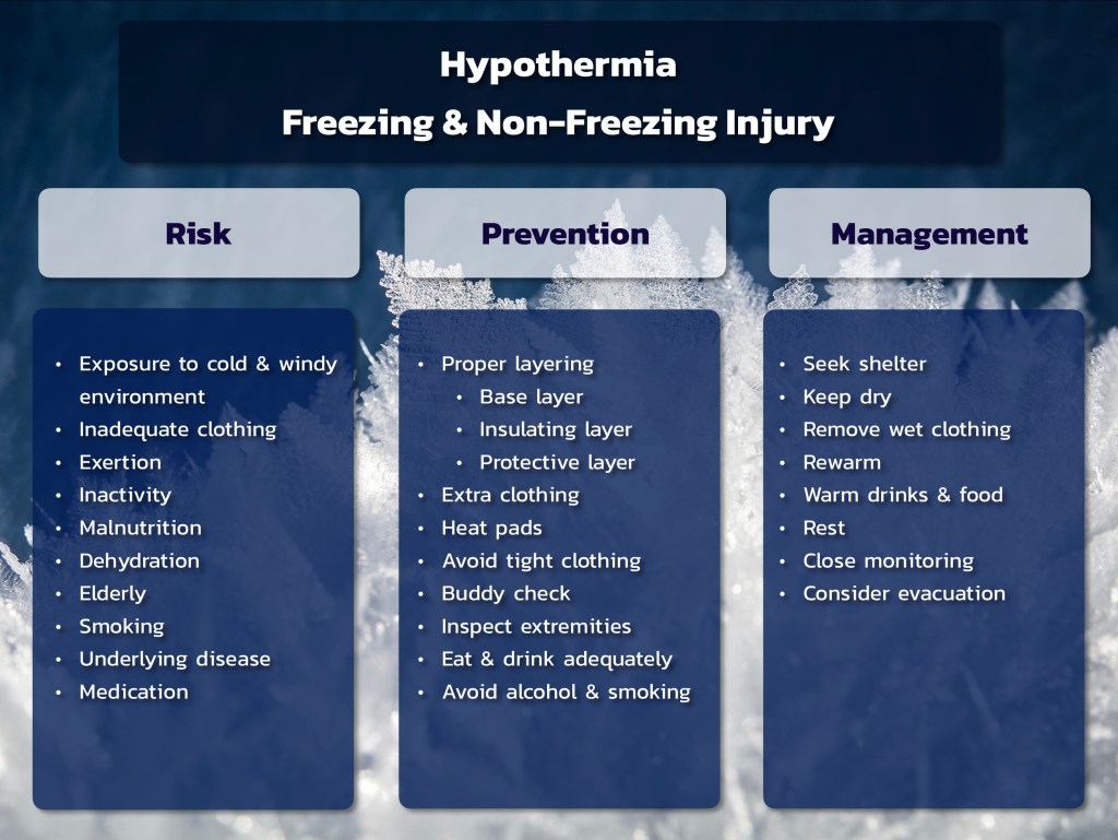 🧊 ความเสี่ยงต่อ Hypothermia และ Freezing & Non-Freezing Injury ได้แก่ การสัมผัสสิ่งแวดล้อมที่หนาวและลมแรงโดยใส่เสื้อผ้าที่ไม่เพียงพอ ออกแรงมากจนเหนื่อยล้าหรือการอยู่เฉยๆ ร่างกายก็จะไม่ผลิตความร้อน ภาวะขาดน้ำขาดอาหาร คนสูงวัย สูบบุหรี่ มีโรคประจำตัวหรือทานยาที่เกี่ยวกับการควบคุมความร้อนของร่างกายและเส้นเลือด