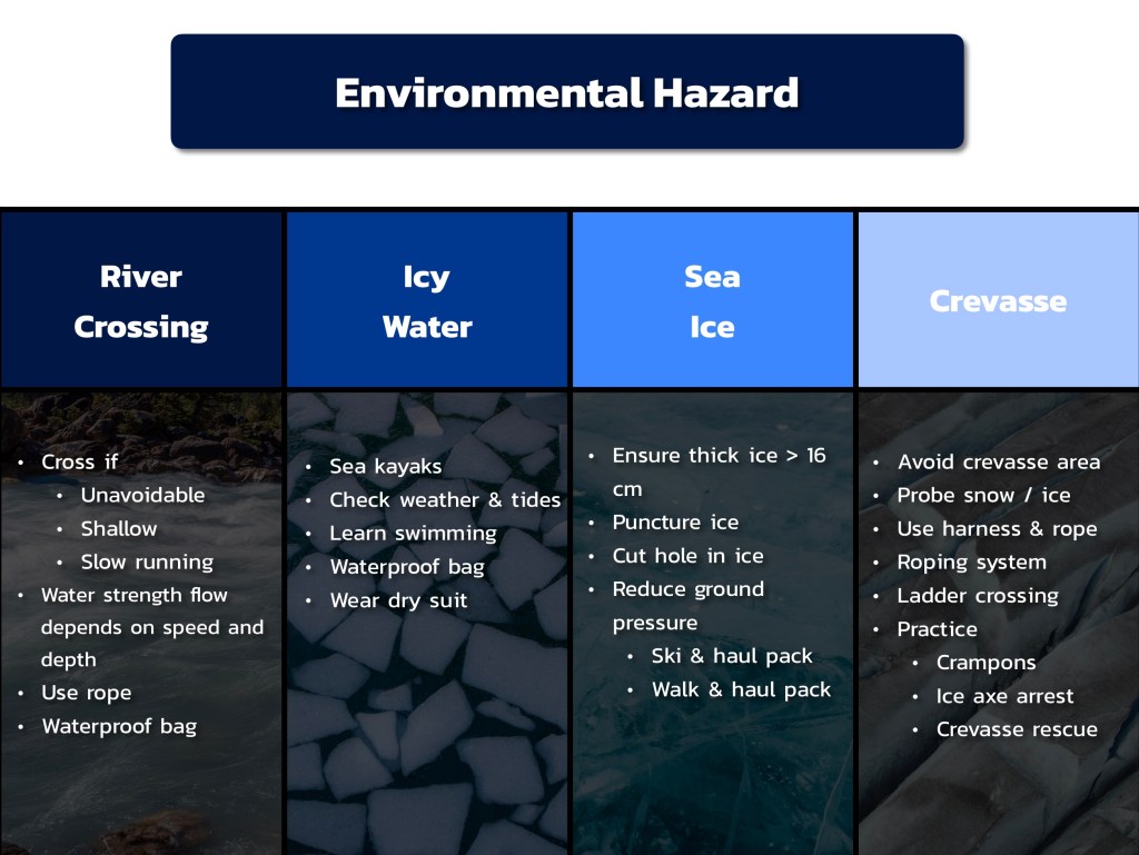 🧊 แผ่นน้ำแข็งก็ถือเป็นสิ่งอันตราย เพราะถ้าแผ่นน้ำแข็งบางไป รับน้ำหนักไม่ไหว ก็จะพังทลายลงมา ต้องระวังโดยเฉพาะกิจกรรมขับรถ ขับเจ็ทสกีน้ำแข็ง เล่นสกี หรือเดินข้ามธารนำแข็ง ถ้าน้ำแข็งบางน้อยกว่า 16 cm ก็มีโอกาสแตก ดังนั้นวิธีแก้คือ ควรลดแรงดันที่พื้นโดยการเฉลี่ยน้ำหนัก ลด Ground Pressure เช่นการใส่สกีหรือเดินลากของจะดีกว่าการแบกของ