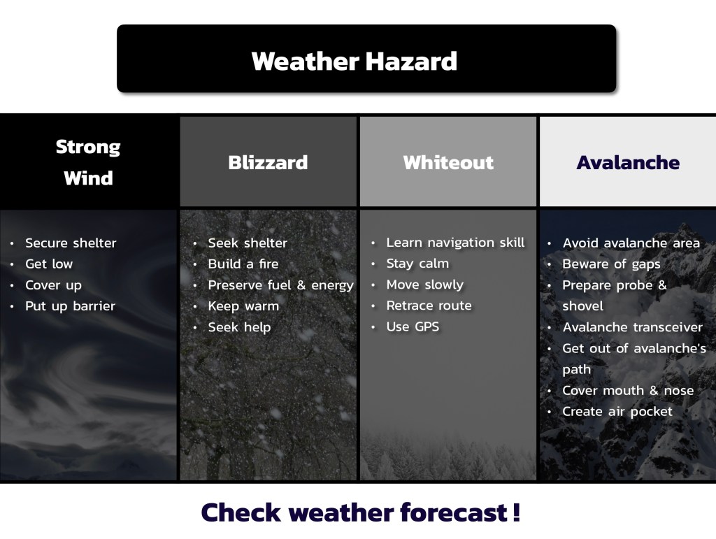 💨 Avalanche หิมะถล่มอาจเกิดถ้าหิมะตกหัก แนะนำให้หลีกเลี่ยงบริเวณที่เกิดบ่อย ใช้อุปกรณ์ Avalanche transceiver ซึ่งจะส่งสัญญาณบอกตำแหน่งว่าถูกฝังอยู่ที่ไหน ในกรณีที่ถูกหิมะกลบฝัง ให้ปิดปากปิดจมูก พยายามอยู่ด้านบนให้มากที่สุด ถ้าไหลออกจากทางของหิมะถล่มได้ยิ่งดี ถ้าถูกฝังให้พยายามสร้างแอ่งอากาศ เรียกว่า Air Pocket เพราะส่วนใหญ่ ทางเดินหายใจของคนที่ตายจะเต็มไปด้วยหิมะ เตรียมไม้ยาวๆ Probe คอยจิ้มหิมะดูว่ามีมนุษย์อยู่ข้างล่างมั้ย และเตรียมพลั่วไว้ตักหิมะ