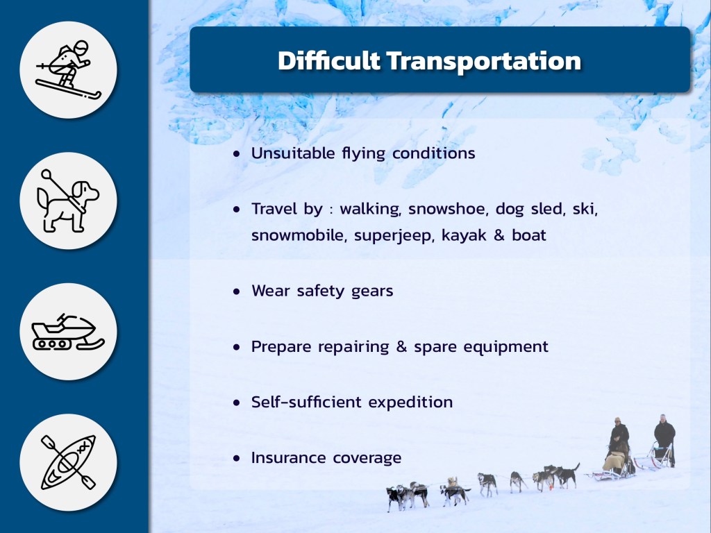 ⛷🦮🛶🛳🚁✈ การเดินทางเป็นสิ่งที่ยากลำบากในประเทศแถบขั้วโลก เพราะสภาพอากาศที่เลวร้าย เครื่องบินหรือเฮลิคอปเตอร์สามารถบินได้เฉพาะบางเวลาเท่านั้น นอกจากนี้ไฟลท์ก็น้อย บางครั้งต้องบินไปต่อไฟลท์ที่บางเมือง การไปขั้วโลกใต้ยิ่งยากลำบาก มีเครื่องบินตกบ่อยมาก ถ้าป่วยหรือบาดเจ็บรุนแรงก็มีโอกาสที่จะไม่ได้ถูกนำส่งโรงพยาบาลเพราะเดินทางไปถึงไม่ได้ เช่นหมอที่ติดอยู่ใน Antarctica แล้วเป็นไส้ติ่งอักเสบ ต้องผ่าไส้ติ่งตัวเอง การเดินทางในแถบขั้วโลกทำได้ทั้ง เดินแบบปกติ เดินแบบใช้รองเท้าหิมะ ขึ้นเกวียนลากน้องหมา Dog Sled สกี เจ็ทสกีน้ำแข็ง รถ Superjeep พายคายัก หรือใช้เรือ ต้องใช้ PPE ที่เหมาะสม เช่นมีหมวกกันน็อค ใส่เสื้อชูชีพให้พร้อม นอกจากนี้ การเดินทางนี้ต้องอยู่ได้ด้วยตัวเอง ซ่อมอุปกรณ์เองได้ในกรณีที่เครื่องมือเสีย มีประกันการเดินทางที่เพียงพอและครอบคลุมต่อเหตุบังเอิญใดๆ
