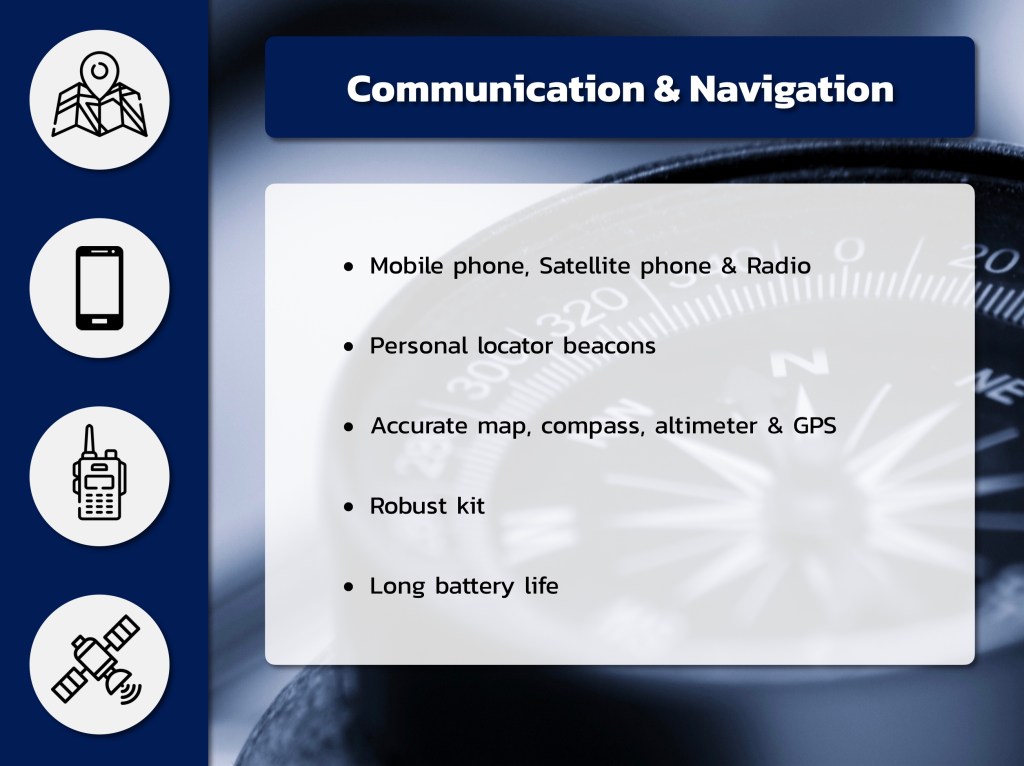 📱🧭📡การสื่อสารและการนำทางเป็นอีกเรื่องที่สำคัญ จะอันตรายมากถ้าเดินทางแล้วขาดการติดต่อสู่โลกภายนอก มีหลายวิธีในการสื่อสาร เช่นใช้สัญญาณมือถือ (อาจติดๆ ดับๆ) ใช้วิทยุ (บางประเทศ ถ้านำเข้าจะผิดกฏหมาย ต้องเช่าเอเยนต์) หรือมือถือดาวเทียม (ราคาแพง) บางคนจะพกตัวส่งสัญญาณอัตโนมัติที่เรียกคนมาช่วยได้ เรียกว่า Personal Locator Beacon ถ้ากดปุ่ม ทีมช่วยเหลือจะได้รับสัญญาณ อุปกรณ์ในการนำทาง เช่นแผนที่ เข็มทิศ ตัววัดความสูง และ GPS ควรมีคุณภาพที่ดี อย่าลืมว่าสภาพอากาศในขั้วโลกเลวร้ายมาก อุปกรณ์มีโอกาสที่จะเสียหายจากอุณหภูมิที่ต่ำ การกระแทก และการสั่นสะเทือน นอกจากนี้แบตเตอร์รี่จะใช้งานได้สั้นลงเมื่ออากาศหนาวด้วย