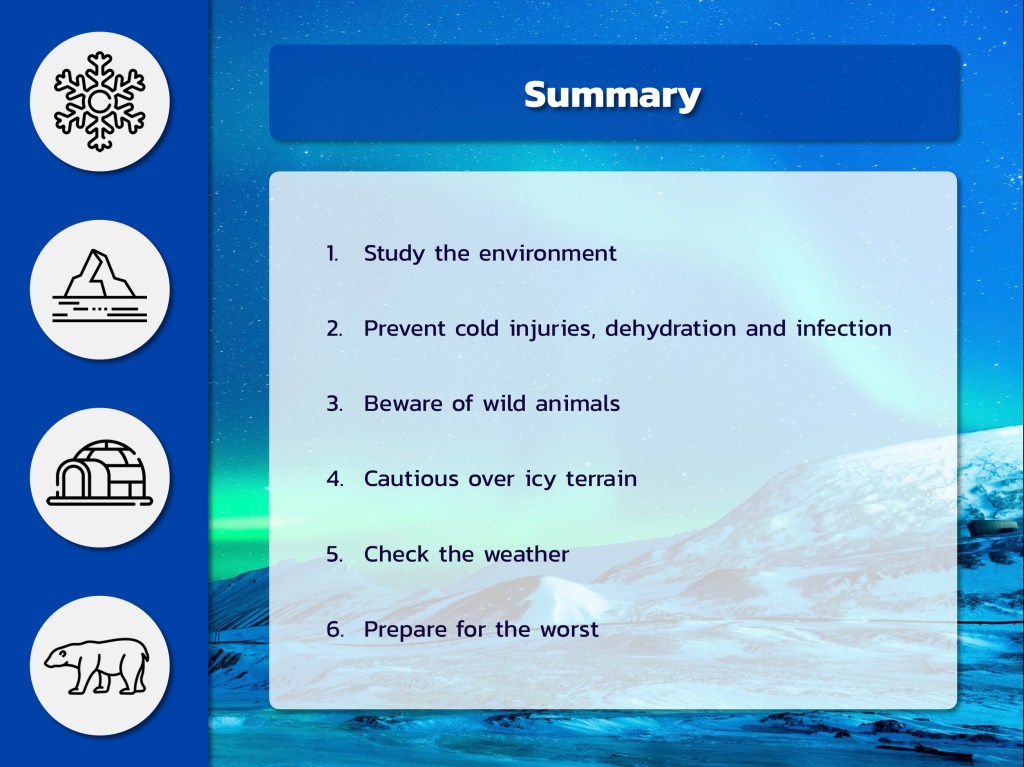 💙 โดยสรุปคือ เมื่อตัดสินใจจะเดินทางไปเที่ยวประเทศในแถบขั้วโลก ควรศึกษาภูมิประเทศและอากาศให้ดี เพราะมีการแปรปรวนสูง อากาศที่หนาวเย็นจะทำให้เกิด Hypothermia, Freezing & Non-Freezing Injury และ Dehydration ได้ง่ายมาก สัตว์อย่างน้องหมีขาวก็น่ากลัว นักท่องเที่ยวควรเดินทางอย่างระมัดระวังบนแผ่นน้ำแข็ง ธารน้ำแข็งและภูเขาน้ำแข็ง สิ่งที่สำคัญที่สุดคือ ต้องเตรียมความพร้อมต่อสภาพที่เลวร้ายที่สุด มีนักเดินทางหลายคนที่ชะล่าใจ สุดท้ายไปเจอพายุ และติดอยู่ในสภาพอากาศที่เลวร้ายจนเสียชีวิต