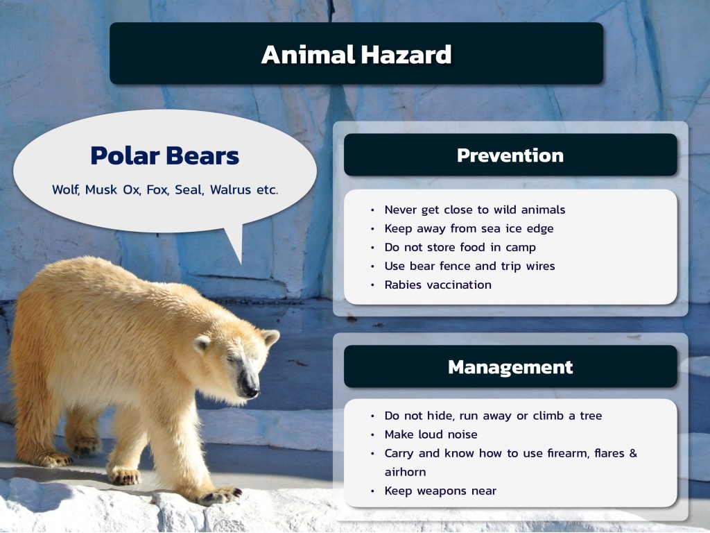 🐻❄ สัตว์ในแถบขั้วโลกตัวที่ดุร้ายที่สุดคือหมีขั้วโลก ซึ่งจะพบได้ในขั้วโลกเหนือเท่านั้น (ไม่มีในขั้วโลกใต้นะ) น้องหมีค่อนข้างดุร้าย ปกติจะล่าน้องแมวน้ำกินแถวๆ แผ่นน้ำแข็ง แต่ถ้าหิวมากๆ ก็มาล่ามนุษย์ได้เหมือนกัน น้องตัวใหญ่แรงเยอะ ไม่น่ารักเหมือนหมีในสวนสัตว์ คนที่เดินทางในขั้วโลกเหนือจะต้องมีปืนเก็บไว้กับตัว ถ้าน้องหมีมาทำร้าย สามารถยิงได้ทันที ดังนั้นก็หลีกเลี่ยงการเก็บอาหารไว้ในแคมพ์ เพราะน้องหมีจะตามกลิ่นอาหารมา กั้นรั้วและวางเชือกดักหมีไว้ ตั้งเวรยามคอยสังเกตน้องหมี ถ้าเจอน้องก็อย่าหนี ยิ่งหนีน้องจะคิดว่าเราเป็นเหยื่อและไล่ล่า ให้ยิงเลย