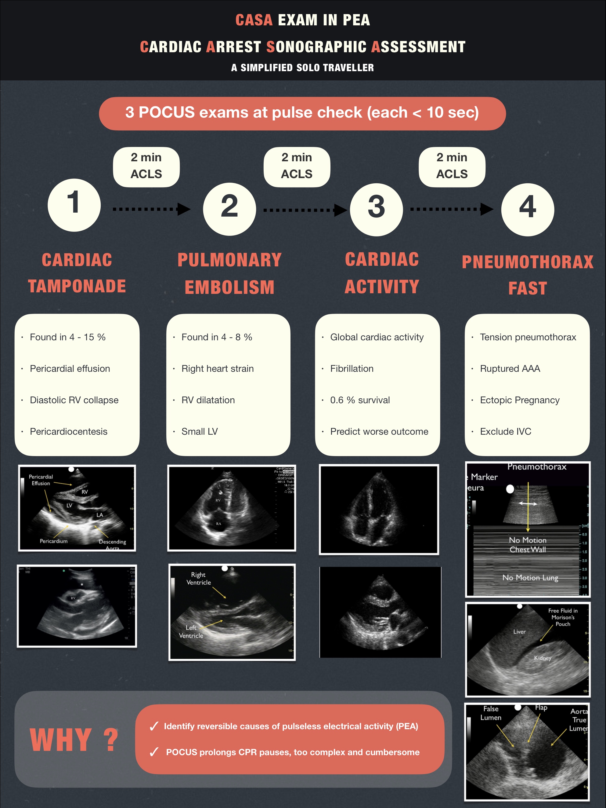 🔺 เพราะถ้าอยู่ตัวคนเดียว จะทำทุกอย่างไม่ทัน ดูมั่วไปหมด CASA จะเรียงตามลำดับความสำคัญ เช่น Cardiac Tamponade พบบ่อยกว่า Pulmonary Embolism และสามารถให้การรักษาได้ทันที จึงต้องประเมินก่อนเป็นลำดับแรก