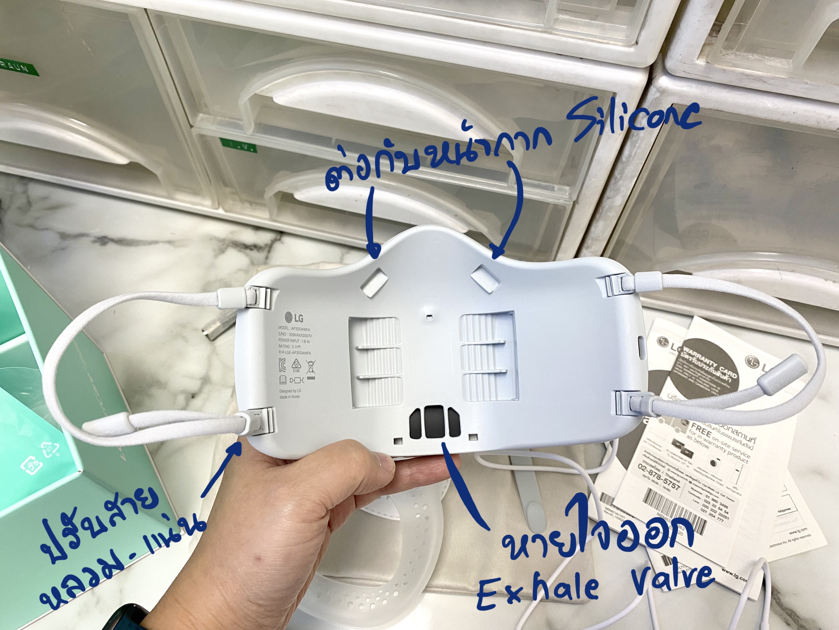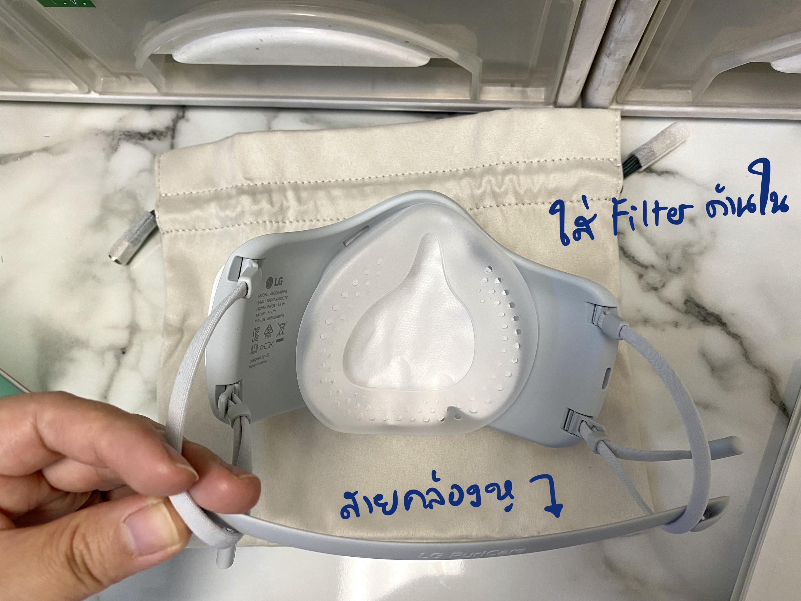 👉🏻 Filter ด้านในที่เป็นแผ่นกรอง ให้ใส่ด้านในหน้ากาก Silicone ควรเปลี่ยนทุกวัน และมันขยับไปมาได้ ไม่ได้ fix อยู่กับที่ ทำให้รู้สึกระแวงว่าแผ่นกรองจะเคลื่อนเวลาเราใส่อยู่รึเปล่า นอกจากนี้ แผ่นกรองจะคลุมบริเวณ Expire Valve แบบหลวมๆ ไม่กระชับ เลยรู้สึกไม่มั่นใจว่าลมหายใจออกจะถูกกรอง 100% มั้ย แต่ใส่ Surgical Mask มันก็ไม่กระชับเหมือนกัน
