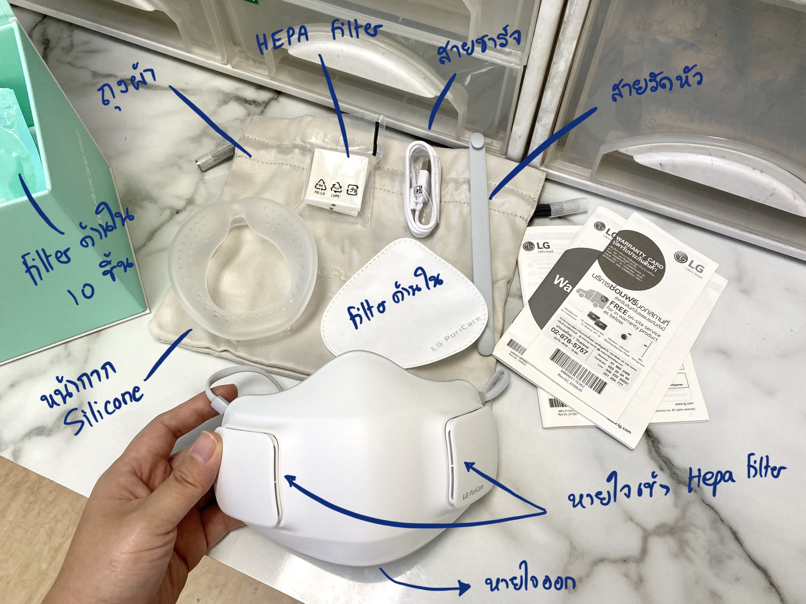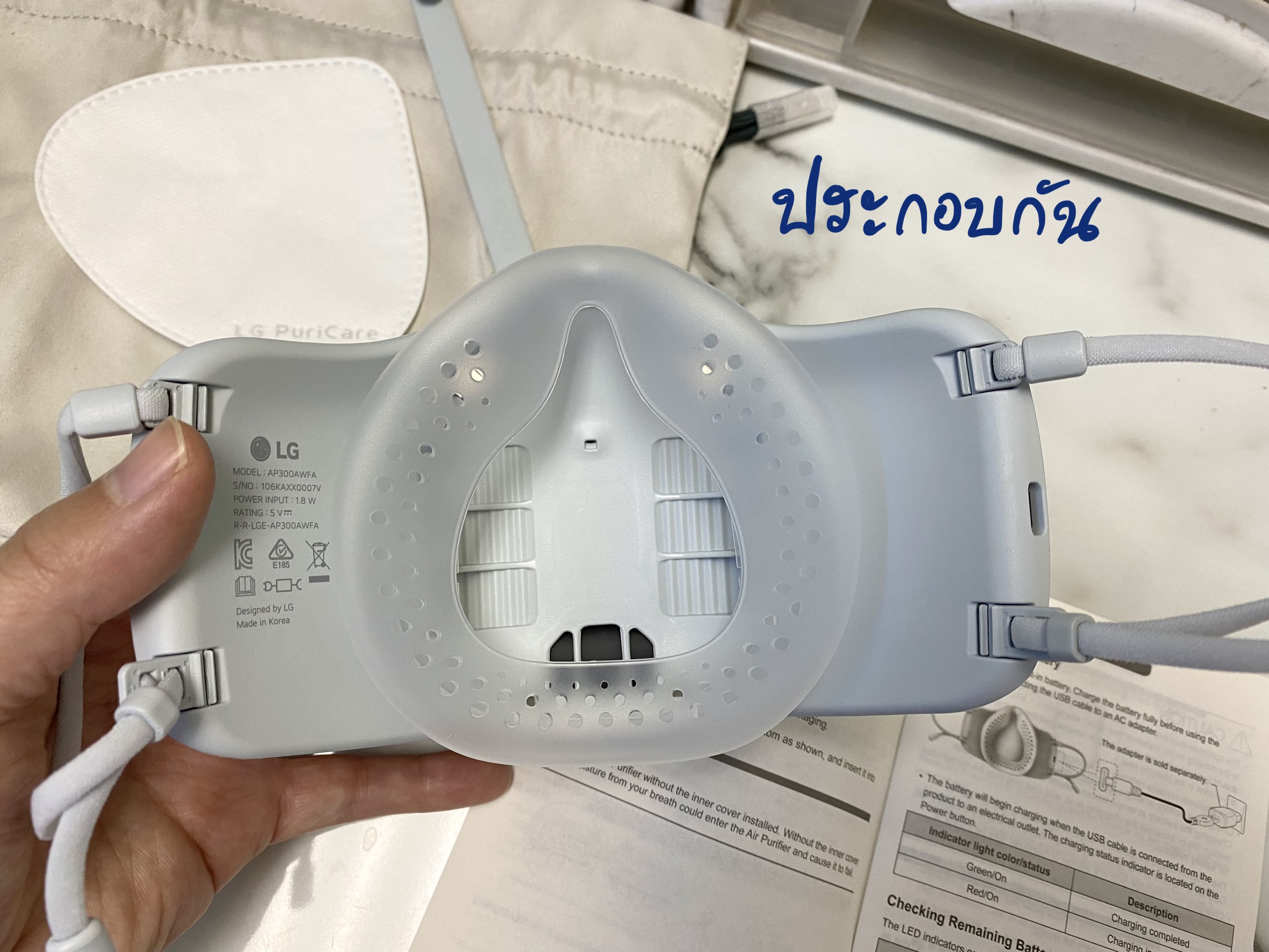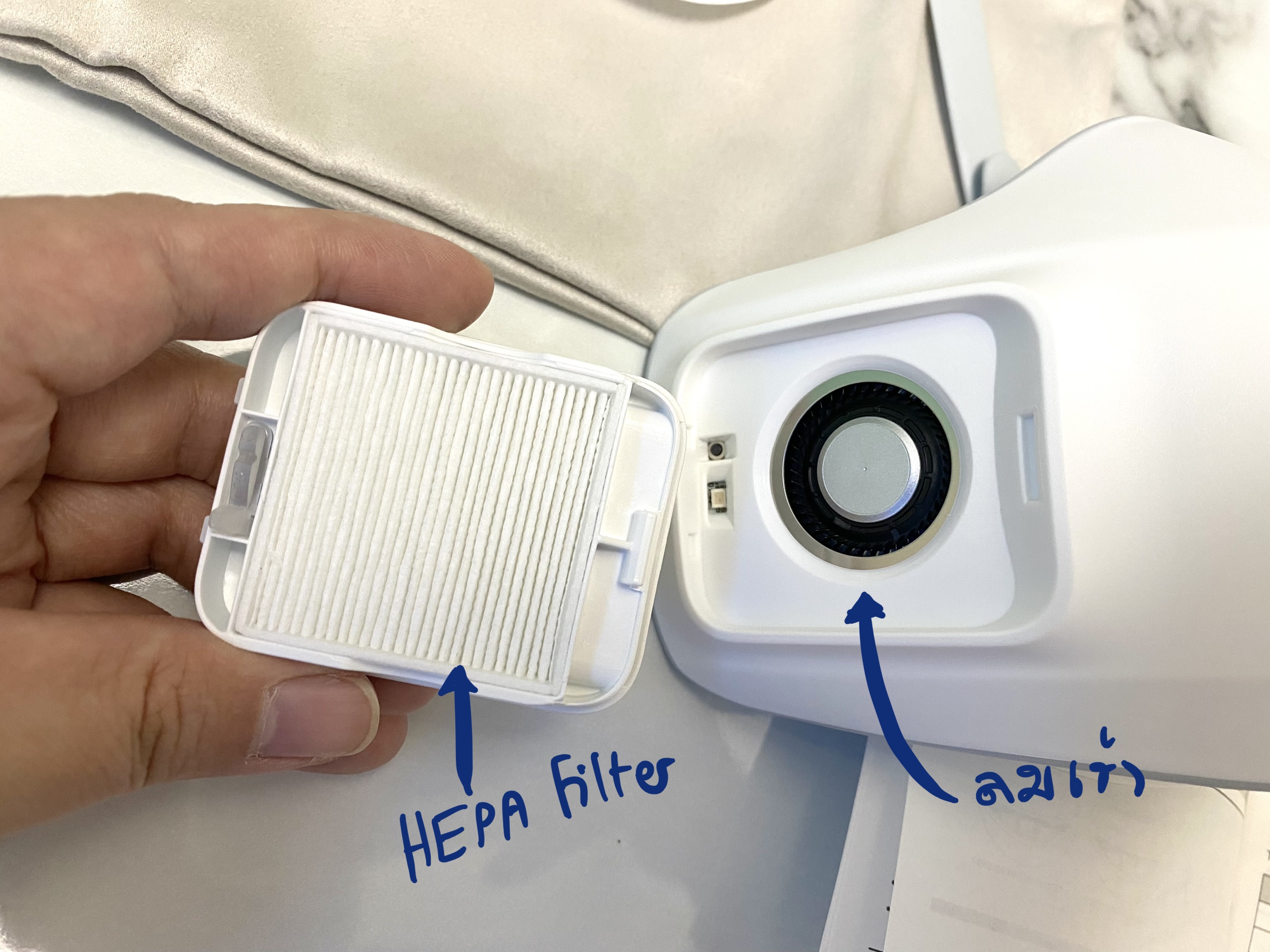 🦠 หน้ากากฟอกอากาศ มีแผ่นกรอง HEPA Filter H13 Class คุณภาพสูง ดักจับอนุภาคเล็กได้ 99.95% มีพัดลมมอเตอร์อัดลมทำให้หายใจสะดวกขึ้น พัดลมมี 3 ระดับที่ 20-60 LPM เครื่องจะมีเซ็นเซอร์จับจังหวะการหายใจเข้าออก เคลมว่ากรองฝุ่นเล็กถึง PM 1.0 และมีอัตรารั่วของอากาศต่ำกว่า 10% (KF94) แบตเตอร์รี่ใช้ได้มากสุด 8 ชั่วโมง ใช้เวลาชาร์จ 2 ชั่วโมง เครื่องหนัก 126 กรัม