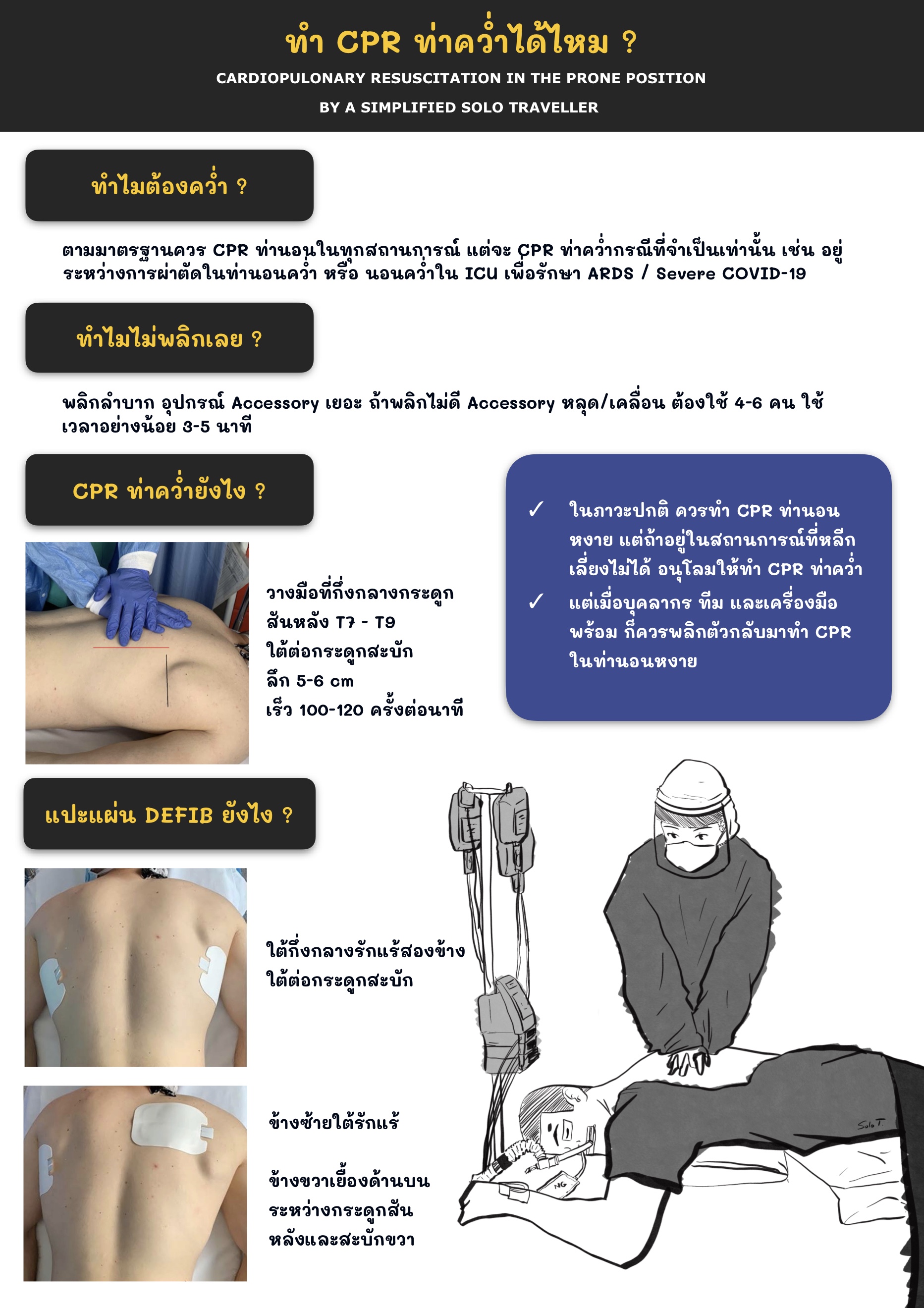 ตอบ : ตามมาตรฐานแล้วควร CPR ท่านอนในทุกสถานการณ์ แต่ที่ต้องทำท่าคว่ำ เพราะจำเป็น ความจริงแล้วอยากจะ CPR ท่าหงายใจจะขาด แต่ทำไม่ได้ เพราะอยู่ระหว่างการผ่าตัดที่ทำในท่าคว่ำ (ผ่ากะโหลก, ผ่ากระดูกสันหลัง ฯลฯ) หรือกำลังนอนคว่ำใน ICU เช่นกำลังรักษา ARDS (Acute Respiratory Distress Syndrome) / Severe COVID-19 Pneumonia ปอดอักเสบขั้นรุนแรง แล้วอาเรส หัวใจหยุดเต้นกะทันหัน กว่าจะพลิกตัวกลับมาก็จะใช้เวลานาน จึงต้อง CPR ท่าคว่ำเบื้องต้นไปก่อน ดังนั้น ในภาวะปกติจึงไม่แนะนำให้ทำท่านี้ ยกเว้นจะเลี่ยงไม่ได้