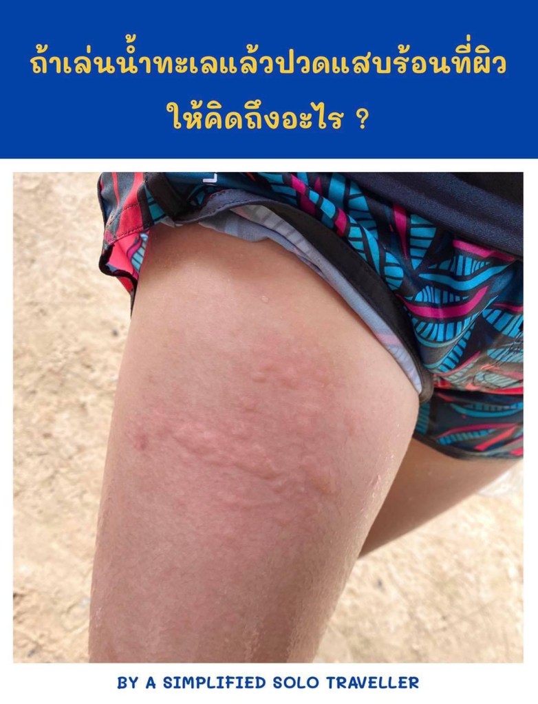 🐙 จะมีผื่นแดงปวดแสบร้อนบวมแดงตามอวัยวะที่สัมผัสแมงกะพรุน ไม่จำเป็นต้องพบลักษณะเป็นเส้น