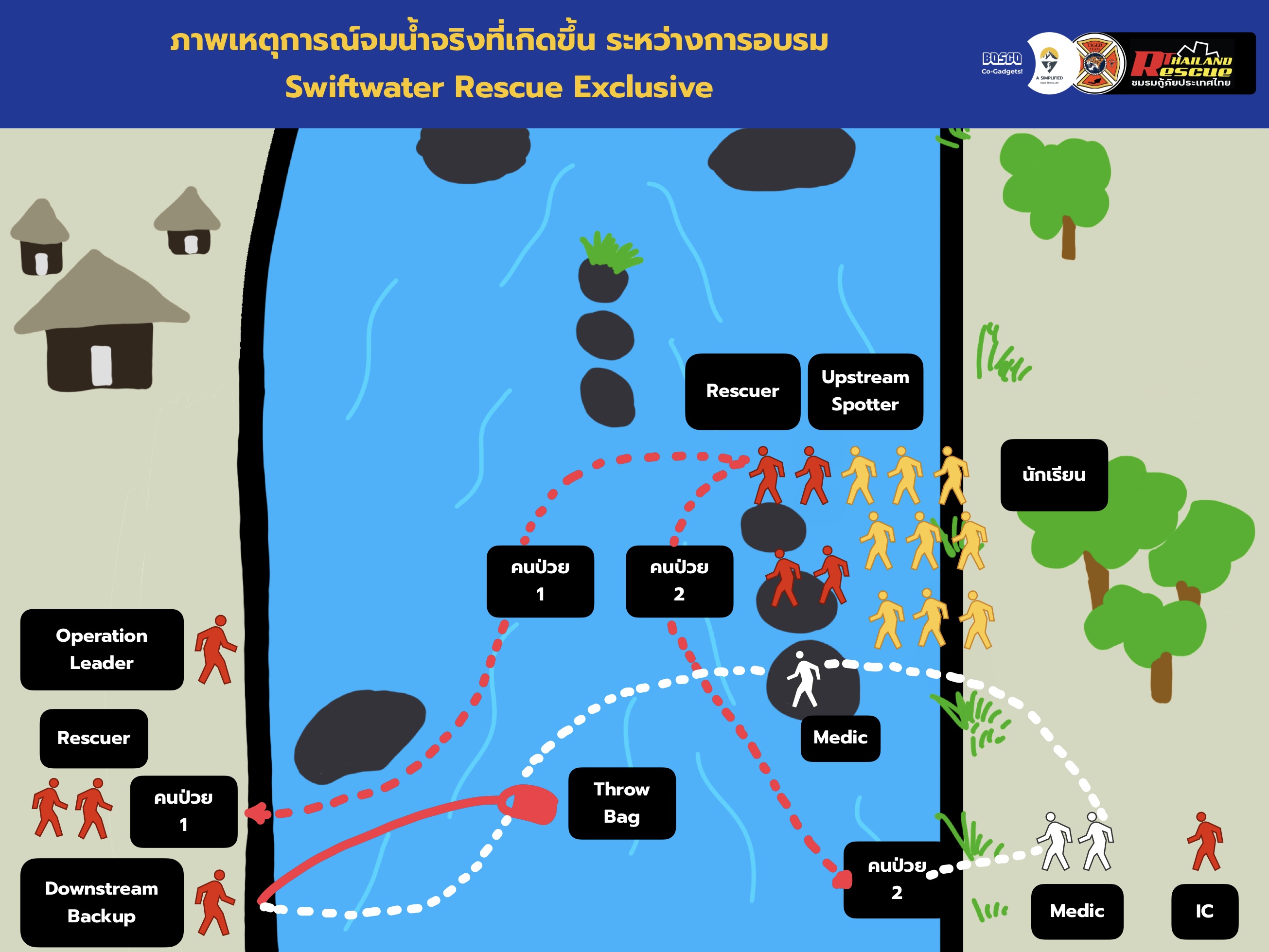 🏊🏻♀️ ตัดสินใจเดินลุยน้ำขึ้นไปด้านบน แล้วกระโดดเพื่อว่ายเข้าไปอีกฝั่ง ตะโกนว่า Throw Bag ขณะว่ายข้ามไป แล้วพี่ๆ Downstream Backup ก็โยน Throw Bag มาให้ จึงสามารถ Pendulum เข้าฝั่งสำเร็จ แล้ววิ่งไปหาผู้ป่วย