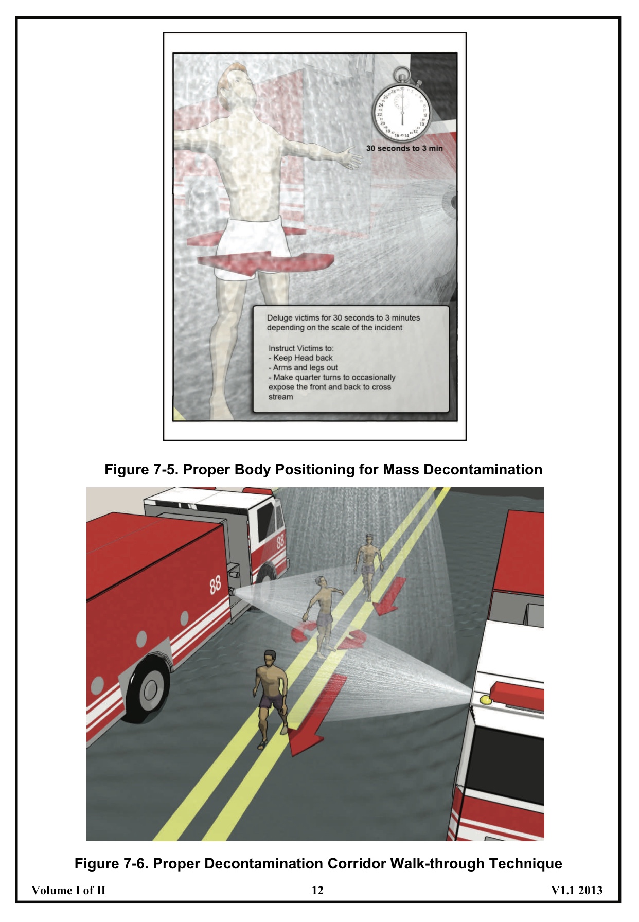 Lake, W. et al. (2013) Guidelines for mass casualty decontamination during an hazmat/weapon of mass destruction incident: volume 1 and 2. Edgewood chemical biological center. U.S. Army research, development and engineering command.