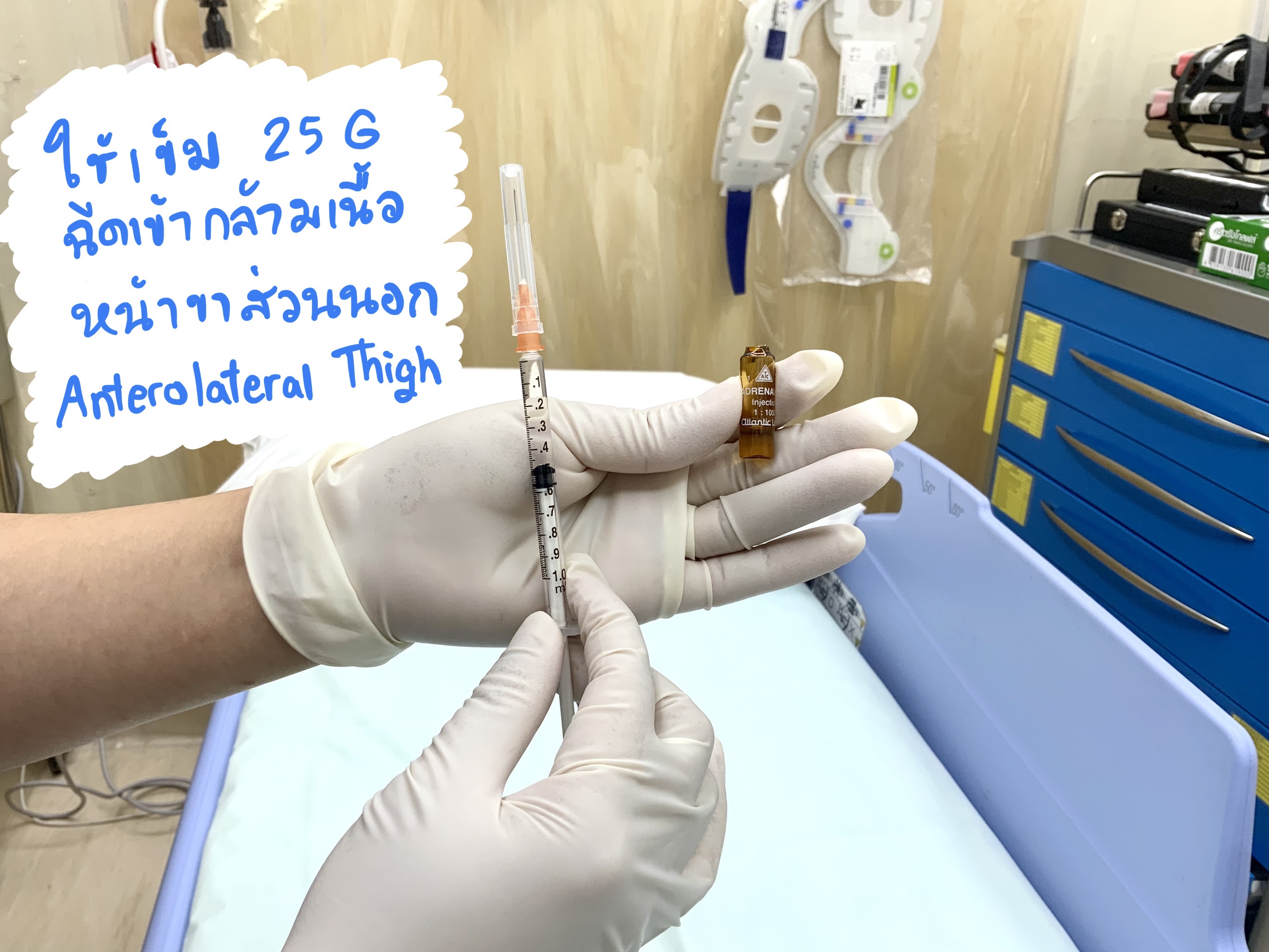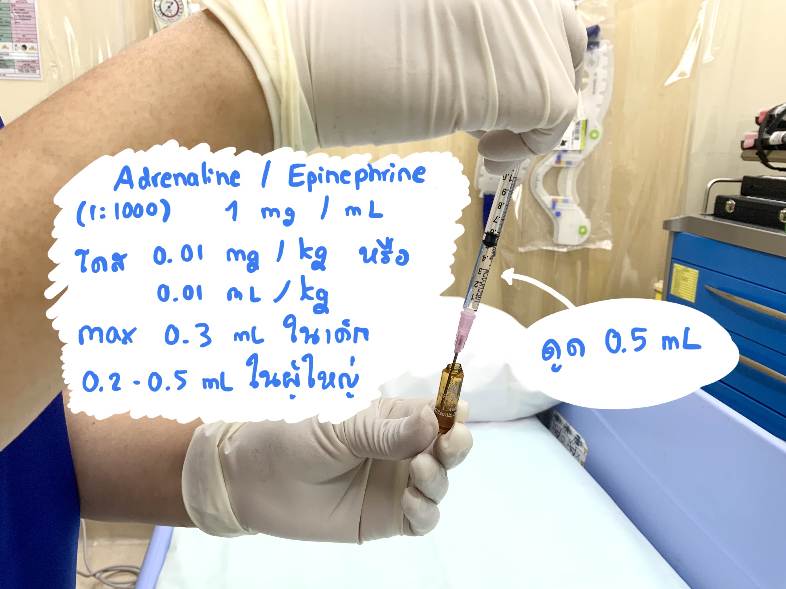 📌 WHO กล่าวไว้ว่า Epinephrine (Adrenaline) เป็นยาที่สำคัญที่สุดใน Anaphylaxis มันคือยาแรกที่ต้องฉีดให้เร็วที่สุด เป็นยาช่วยชีวิต และถ้าเป็นไปได้ ควรเป็นคนไข้ฉีดตัวเองด้วยซ้ำเพื่อความรวดเร็ว !!! ฉีดตัวเองก่อน แล้วค่อยโทรเรียกรถพยาบาล ที่ต่างประเทศจะมีสิ่งที่เรียกว่า Epinephrine Auto-Injector (Epipen) อยู่ในชุดปฐมพยาบาล (First Aid Kit) อุปกรณ์นี้เป็นปากกาที่มียาอยู่ด้านใน เมื่อกดใช้ เครื่องจะยิงเข็มและยาโดยอัตโนมัติ ตัวนี้พกขึ้นเครื่องบินได้ ได้รับอนุญาตจาก TSA (Transportation Security Administration) ด้วย