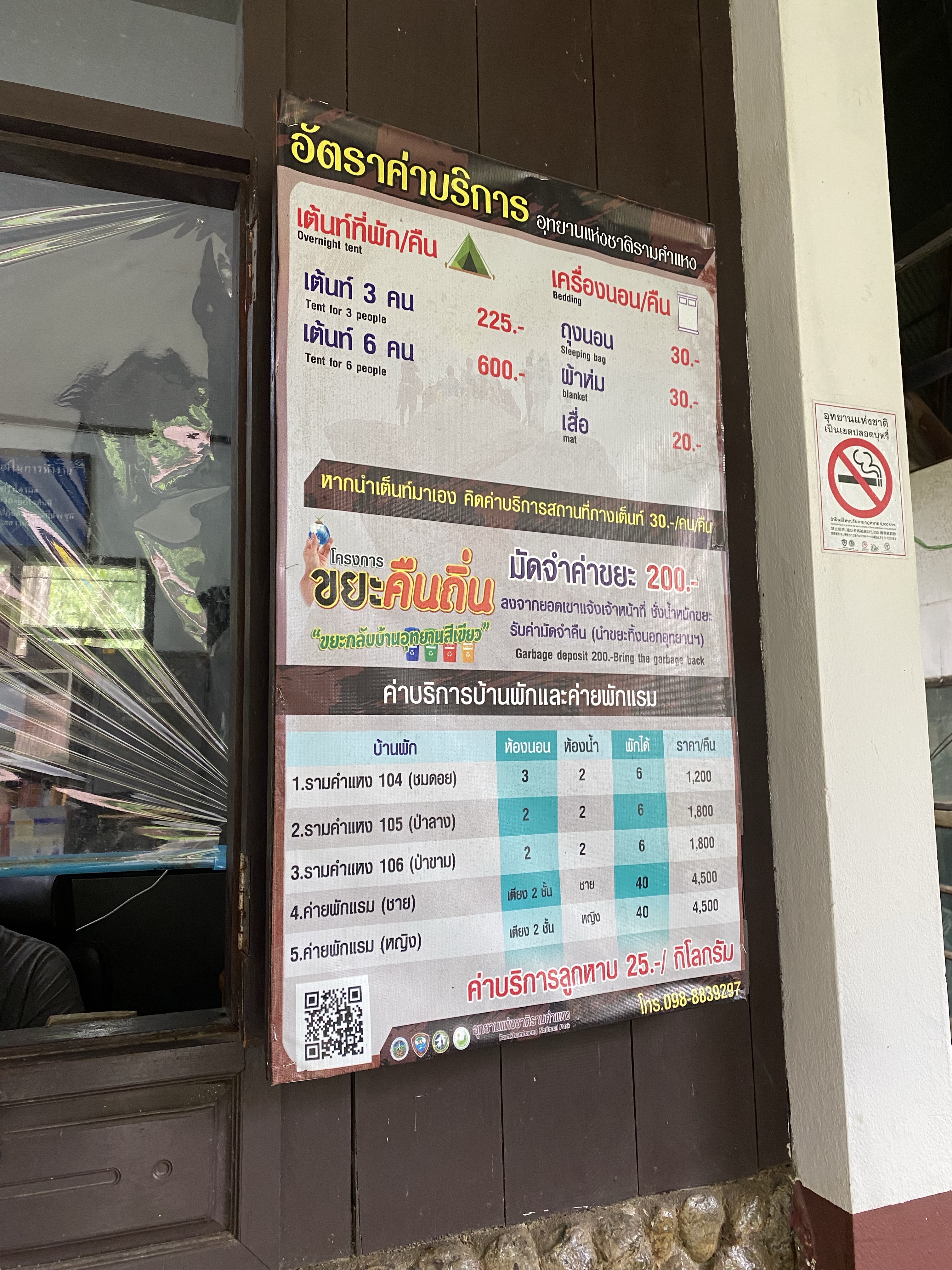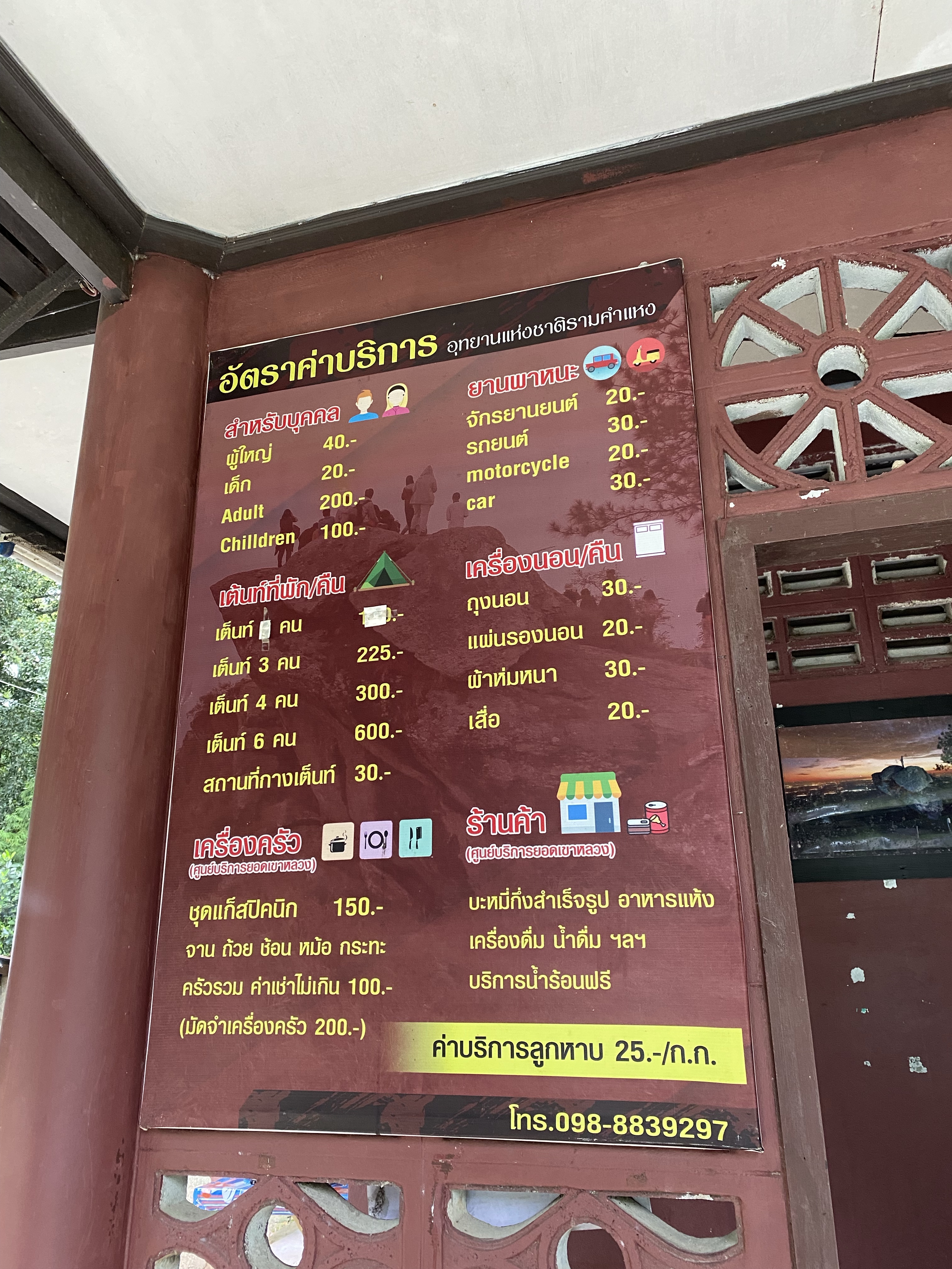 – ค่ากางเต้นท์ 30, เต้นท์ 3 คน 225, เต้นท์ 4 คน 300, เต้นท์ 6 คน 600, ถุงนอน 30, แผ่นรองนอน 20, ผ้าห่ม 30, เสื่อ 20