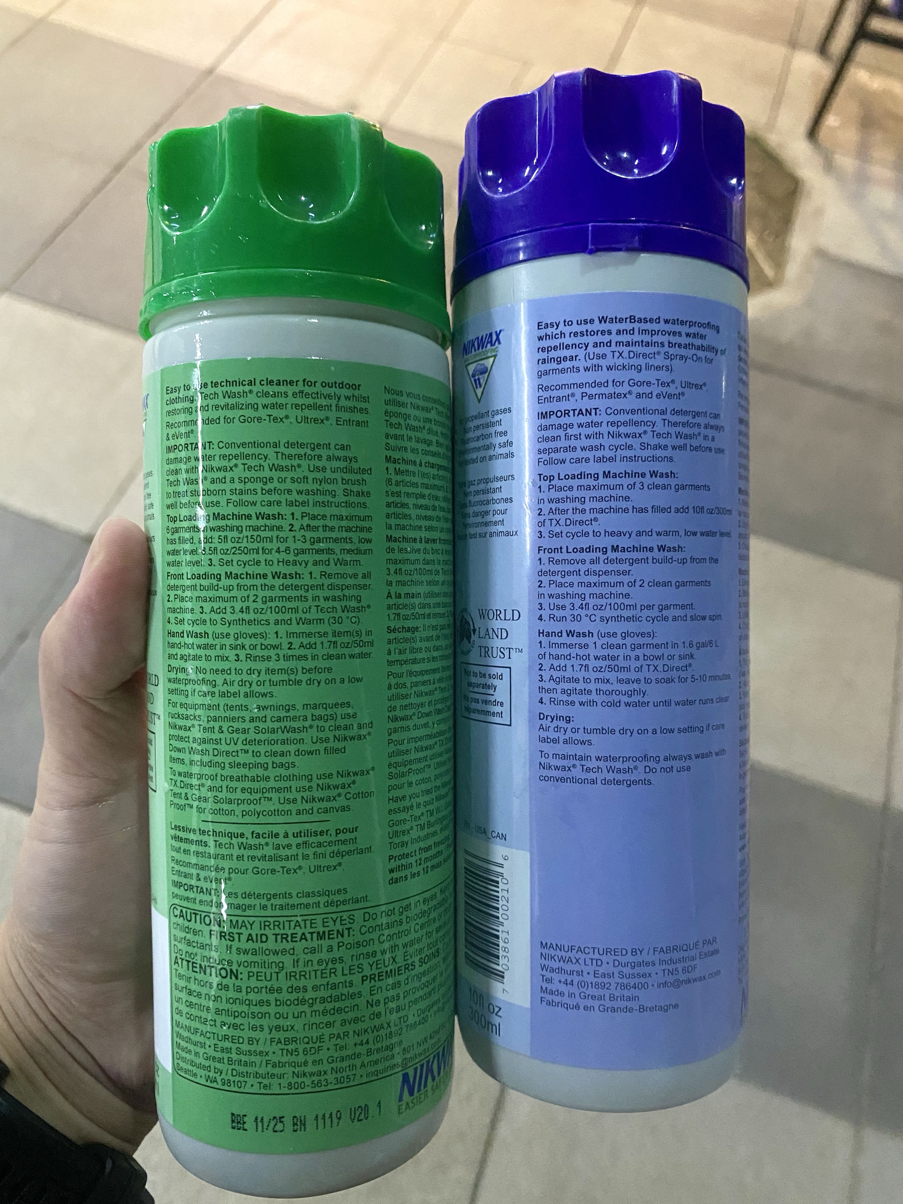 🔹 วิธีการเคลือบสารกันน้ำ ก็แสนง่าย ซื้อน้ำยา Waterproof Wash มาใช้ค่ะ นี่ซื้อน้ำยายี่ห้อ Nikwax มาจากอเมริกา มี 2 ขวด ต้องใช้คู่กัน : Tech Wash เอาไว้ล้างชุดให้สะอาดเอี่ยมอ่อง เอาสิ่งสกปรกออกจากรูขุมขนของเนื้อผ้า ส่วนต่อมาคือ TX.Direct Wash In เป็นตัวเคลือบสาร “กันน้ำ” ไปที่ผิวผ้า