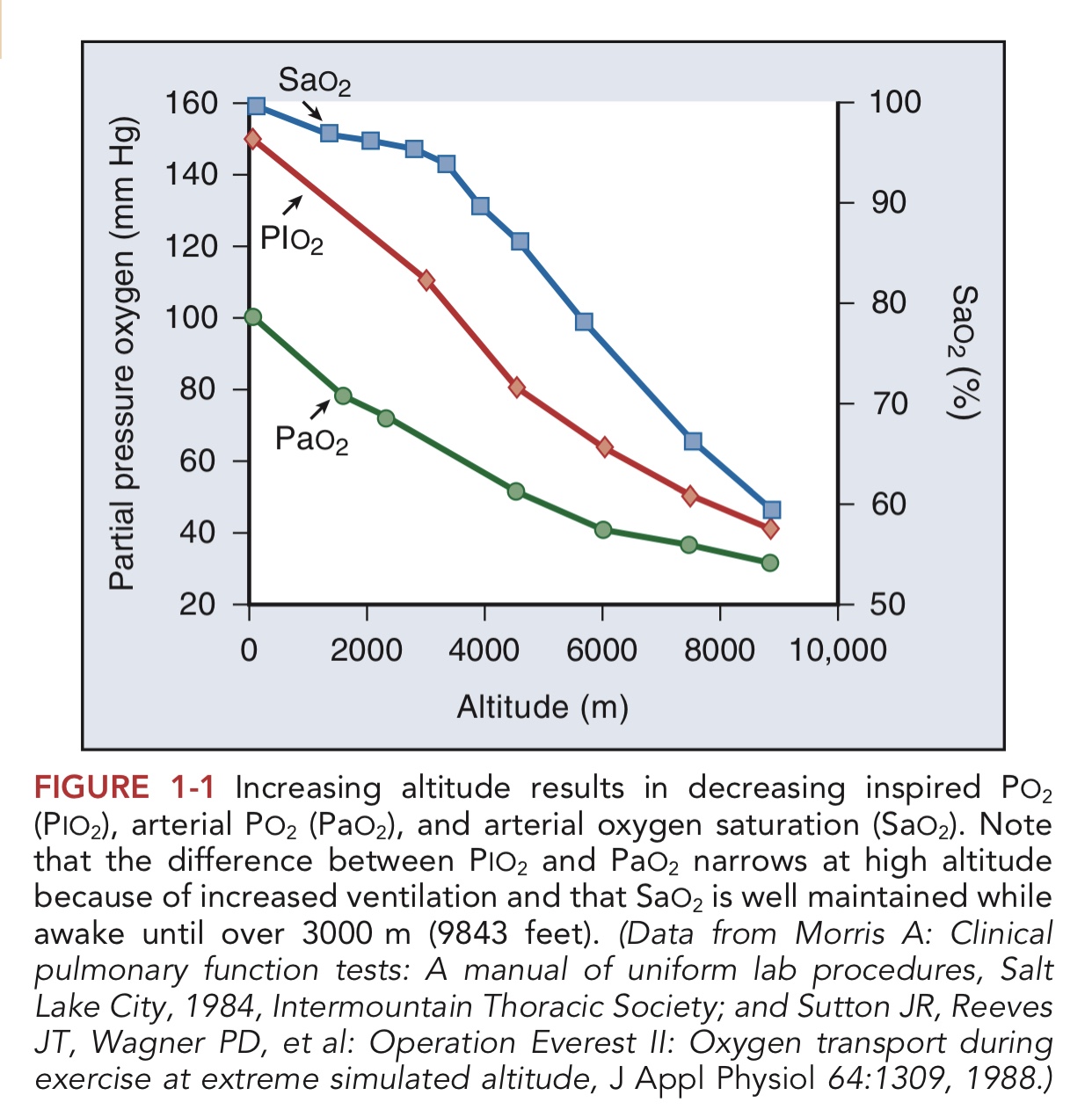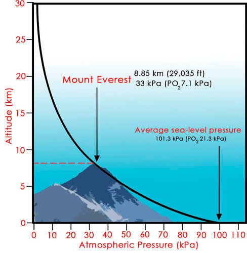 ⬆️ ณ ความสูง ของภูเขาเอเวอร์เรส 8848 เมตรเหนือระดับน้ำทะเล ความกดอากาศเหลือเพียง 33 kPa และ PO2 เหลือ 7.1 kPa