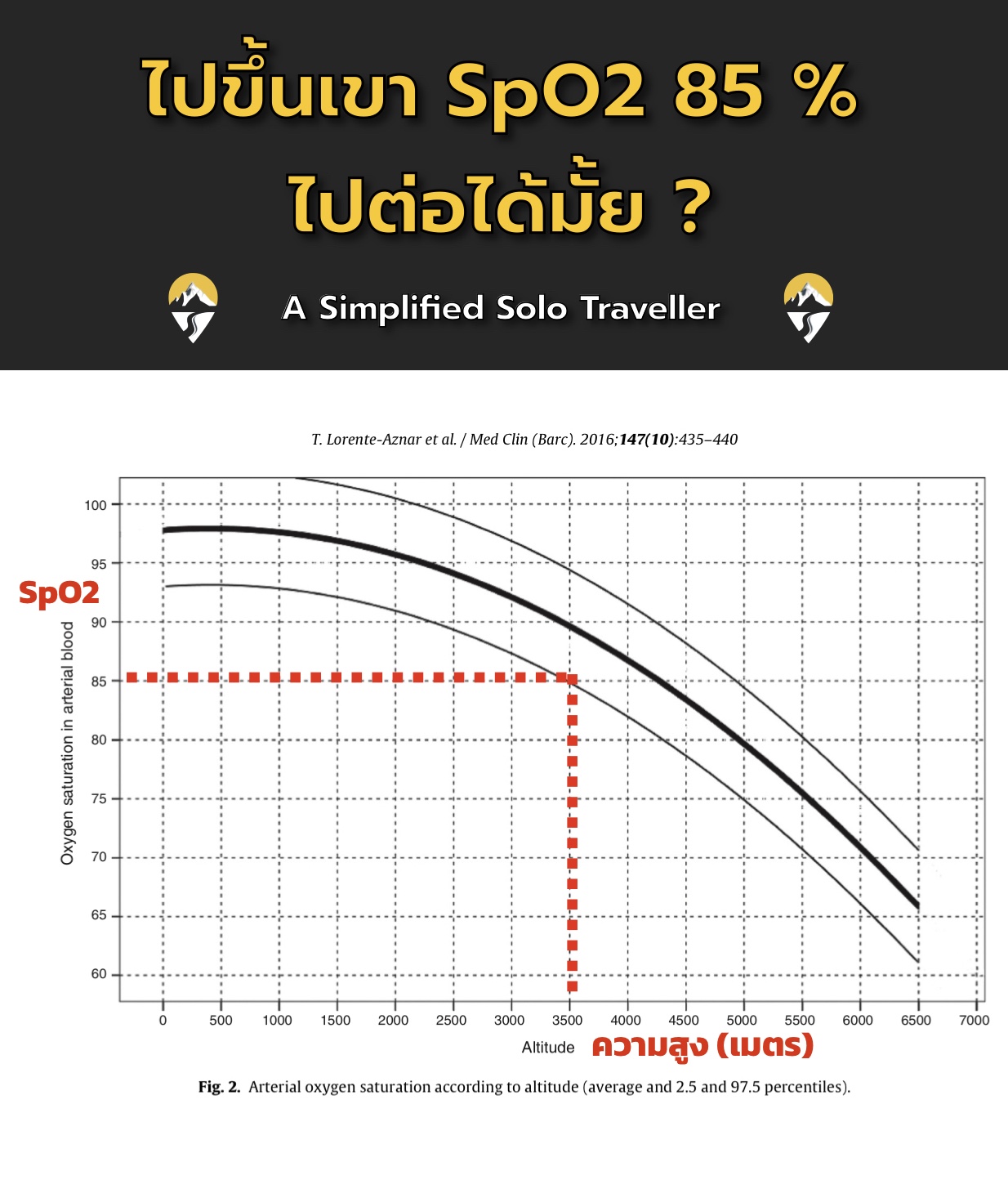 📉 กราฟด้านล่างจะอธิบายความสัมพันธ์ระหว่าง ความสูง (เมตร) และค่า SpO2 เราจะเห็นว่าที่ความสูง 3500 เมตร โดยเฉลี่ย ค่า SpO2 จะอยู่ที่ +/- 85 % ดังนั้น ในการแปลผลว่า SpO2 ระดับไหนอันตราย เราจะต้องรู้ค่าปกติ (Normal value) ของแต่ละความสูงค่ะ ถึงจะเอามาประเมินได้