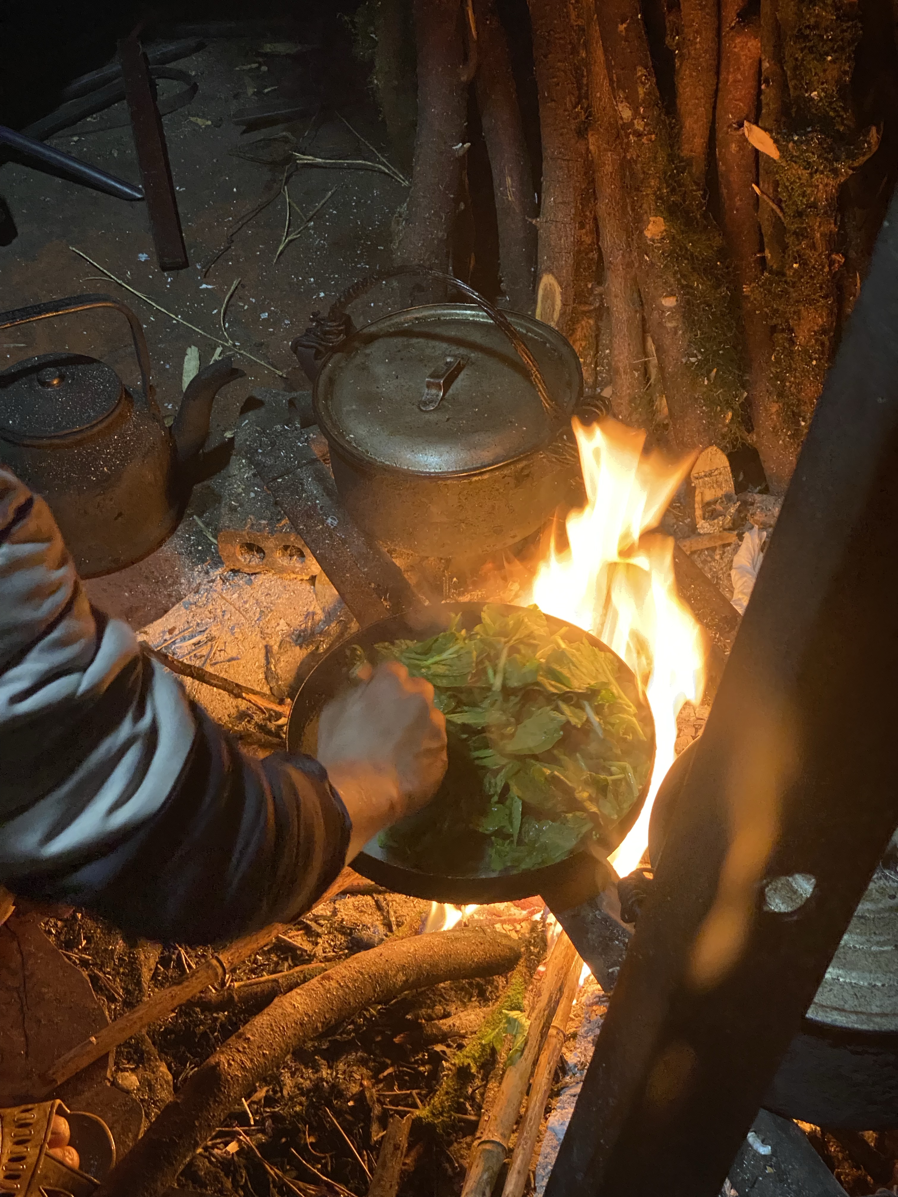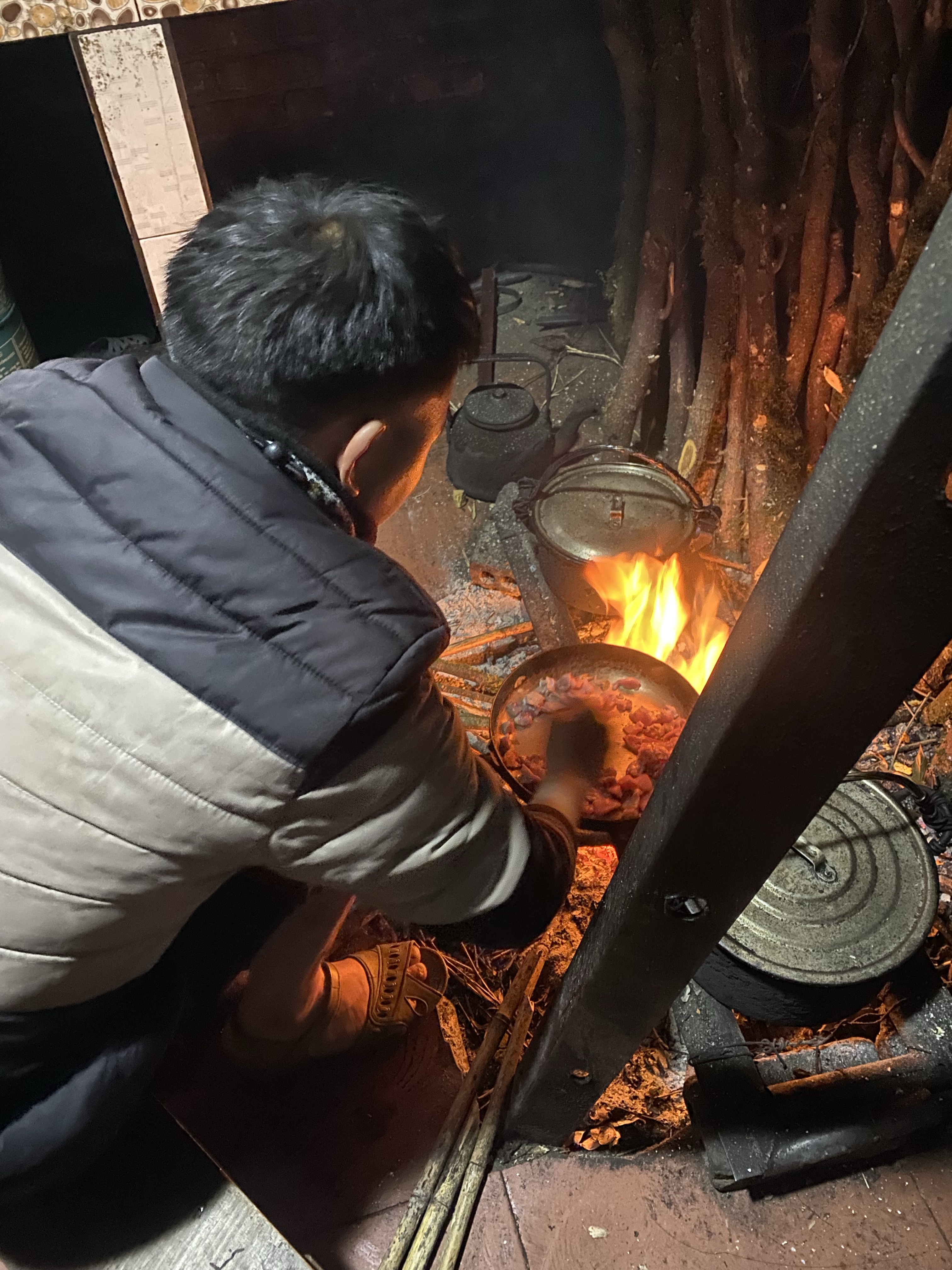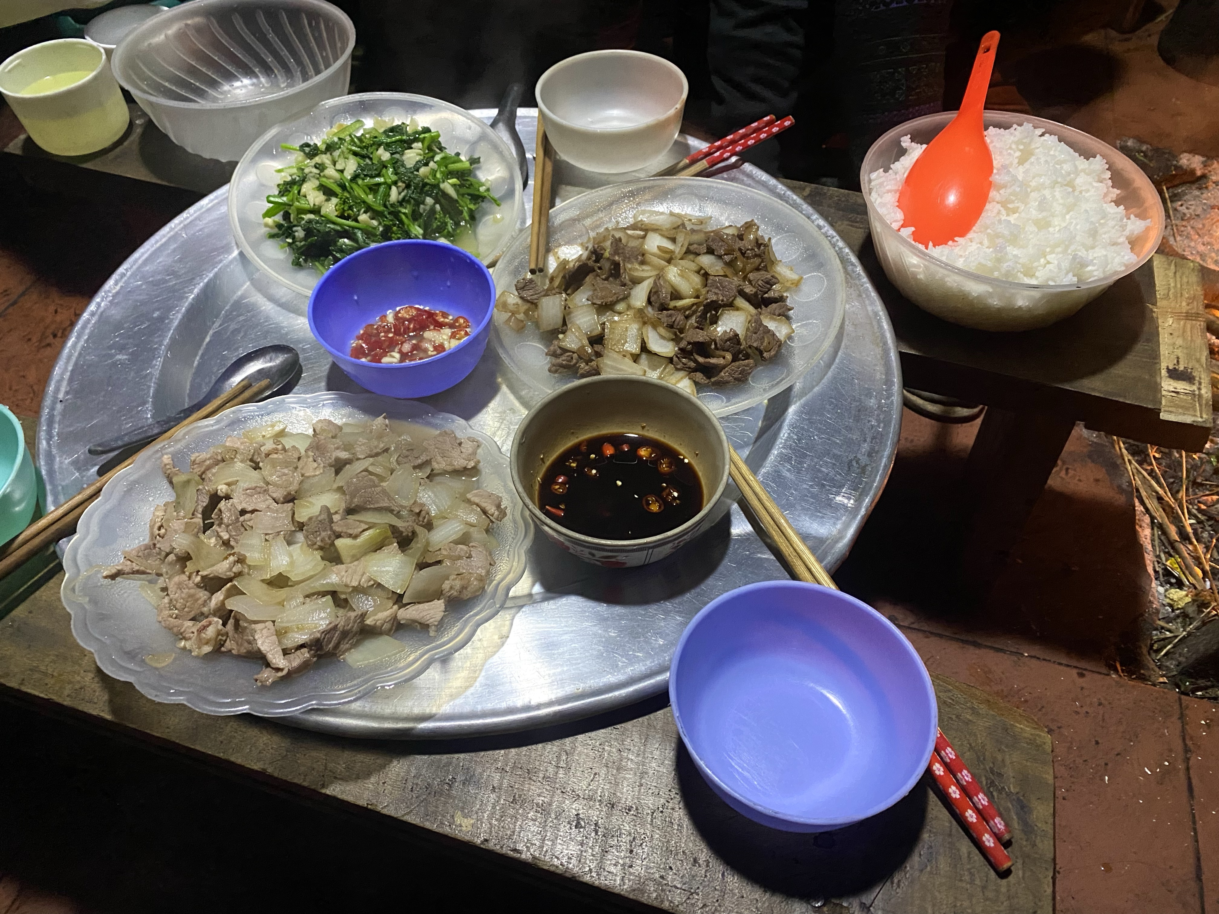 🥘 ข้าวเย็นทาน ณ ความสูง 2800 เมตร ไกด์ลงมือทำกับข้าวเองกับมือ เค้าแบกผัก เนื้อสัตว์ ข้าว น้ำมัน เครื่องปรุงมาเองหมด ครัวที่นี่ใช้ฟืนจุดไฟ เป็นสไตล์บ้านๆ ได้เมนูหมูผัดหัวหอม เนื้อผัดหัวหอม ผัดผัก และเต้าหู้ทอดกับซอสมะเขือเทศ ทานคู่กับข้าวร้อนๆ อร่อยมาก ได้นั่งทานกับคุณปู่คุณย่าที่ดูแลจุดพักแรม ทานด้วยกันแบบครอบครัวชาวเวียดนามมาก นั่งข้างๆ เตาไฟ เค้าก็ดื่มเหล้าขาวกัน
