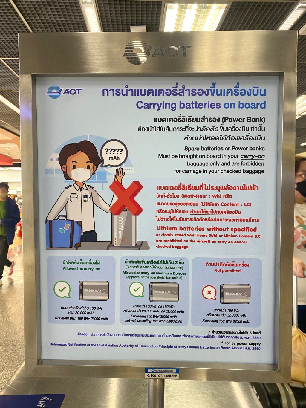 1.) ต้องนำติดตัวเป็นสัมภาระแบบ Carry On เท่านั้น ห้ามโหลดใต้ท้องเครื่อง เพราะมีโอกาสระเบิดและลุกติดไฟได้ ถ้าอยู่ด้านล่าง ไม่มีคนเห็น ไม่มีคนช่วยดับไฟ ไฟลุกเครื่องบินน้า