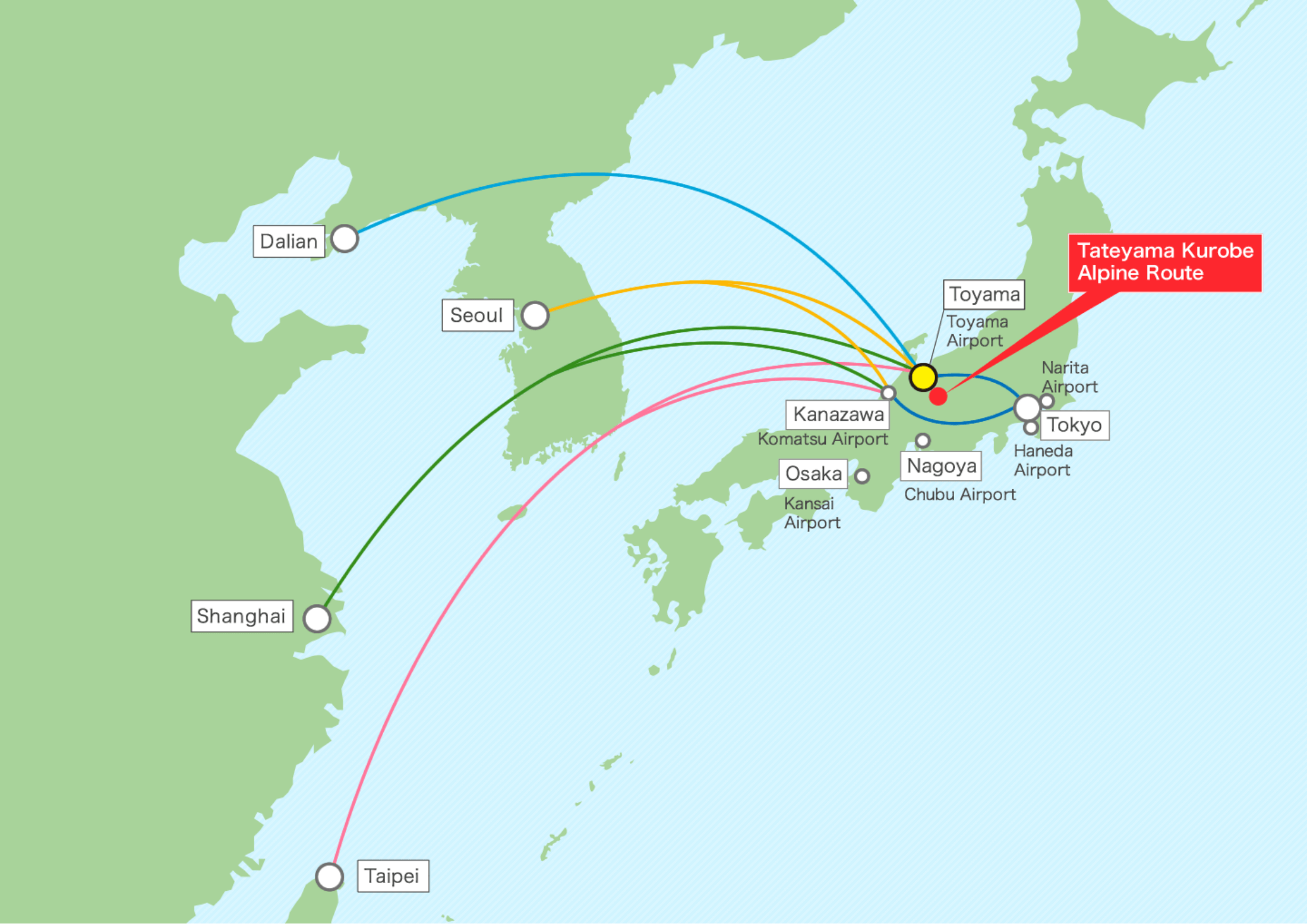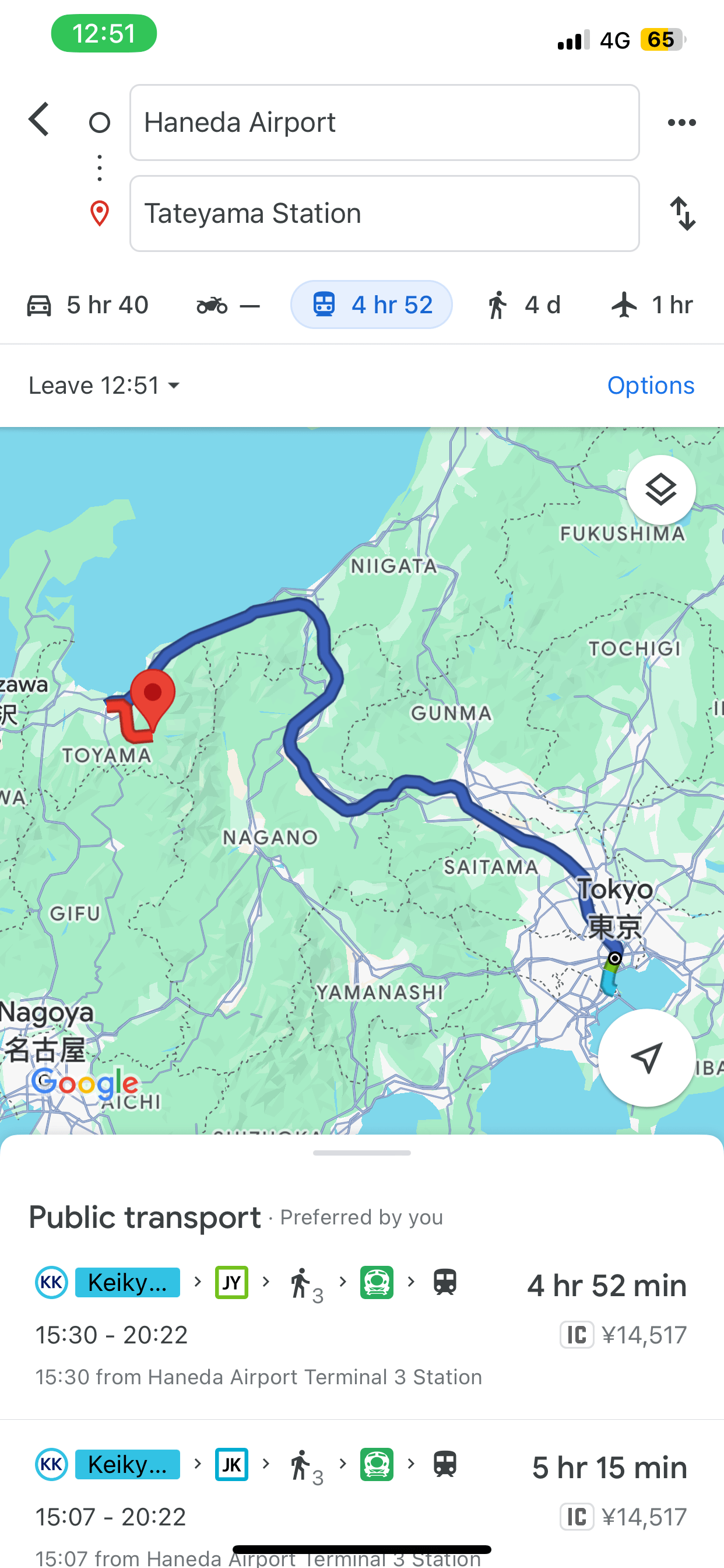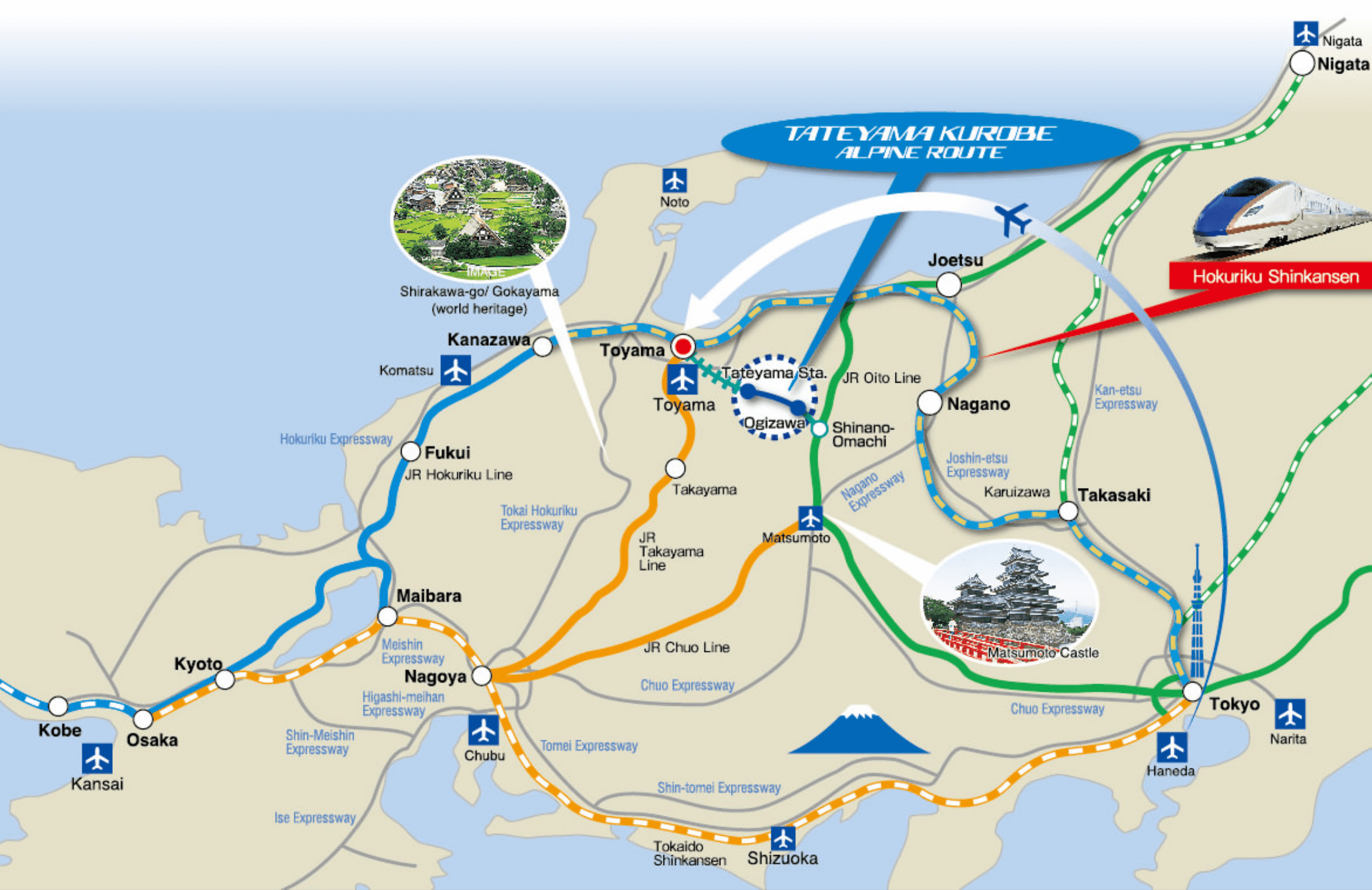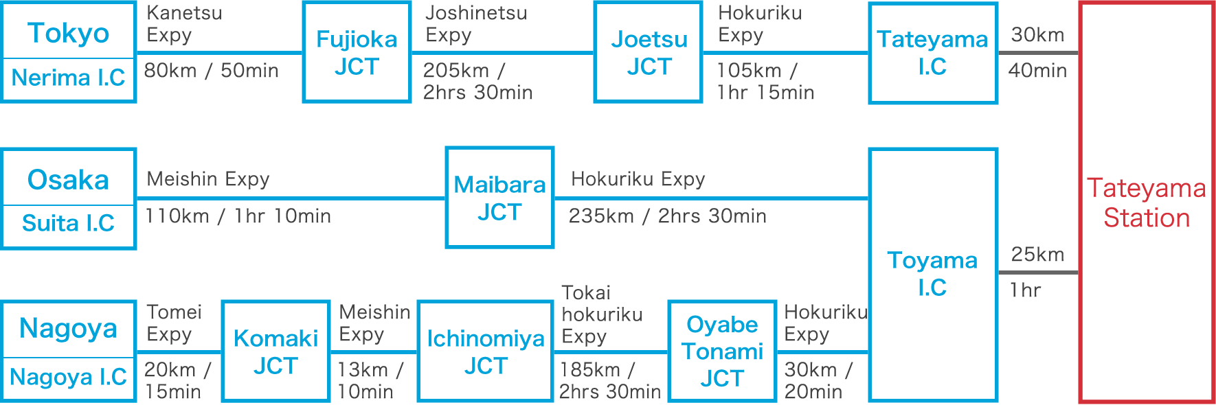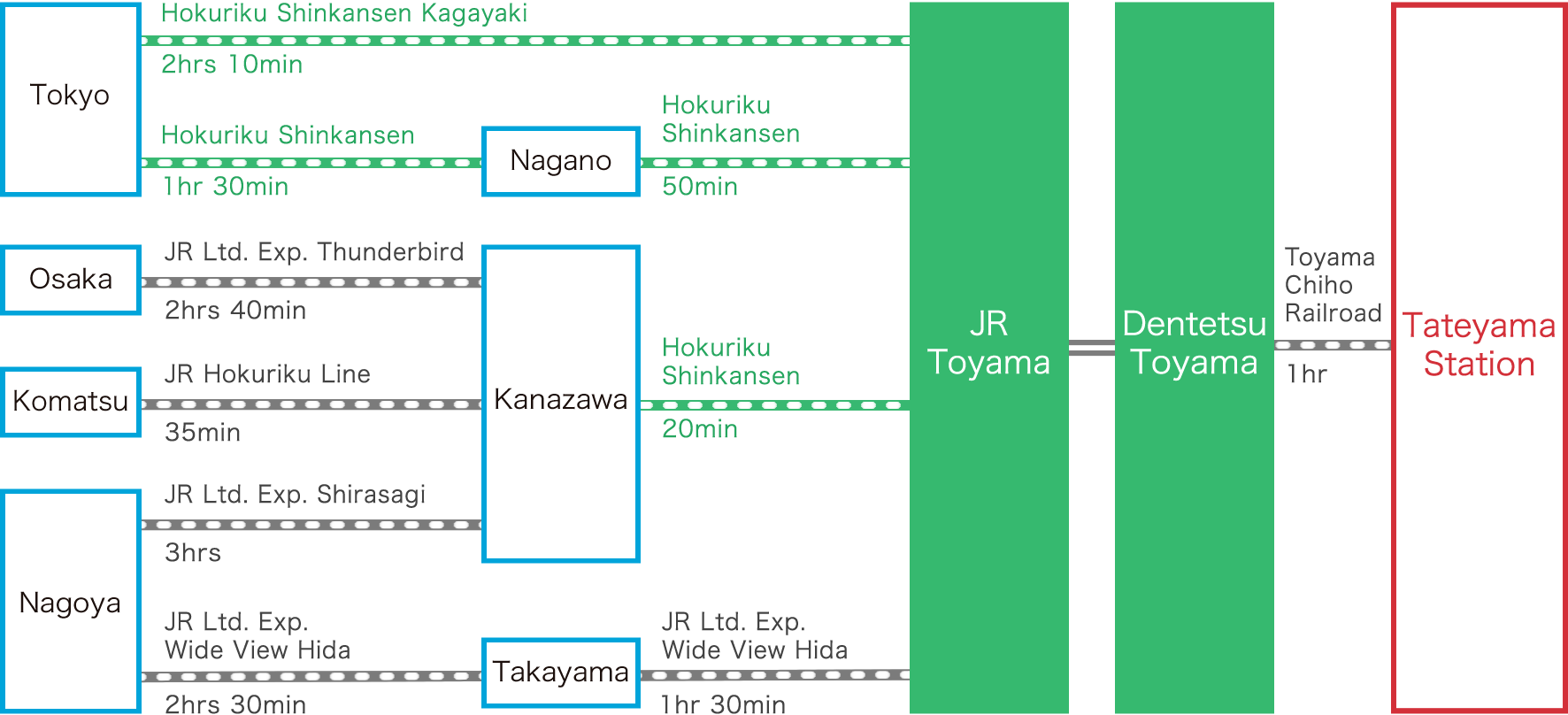 – จาก Toyama Station ขึ้นรถไฟ Toyama Chiho Railroad ไปลง Tateyama Station ใช้เวลา 65 นาที
