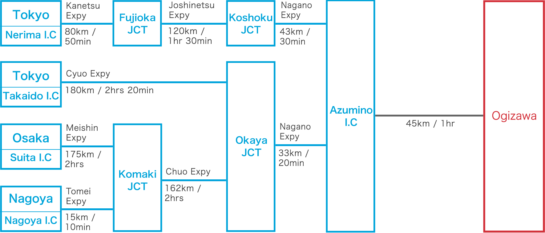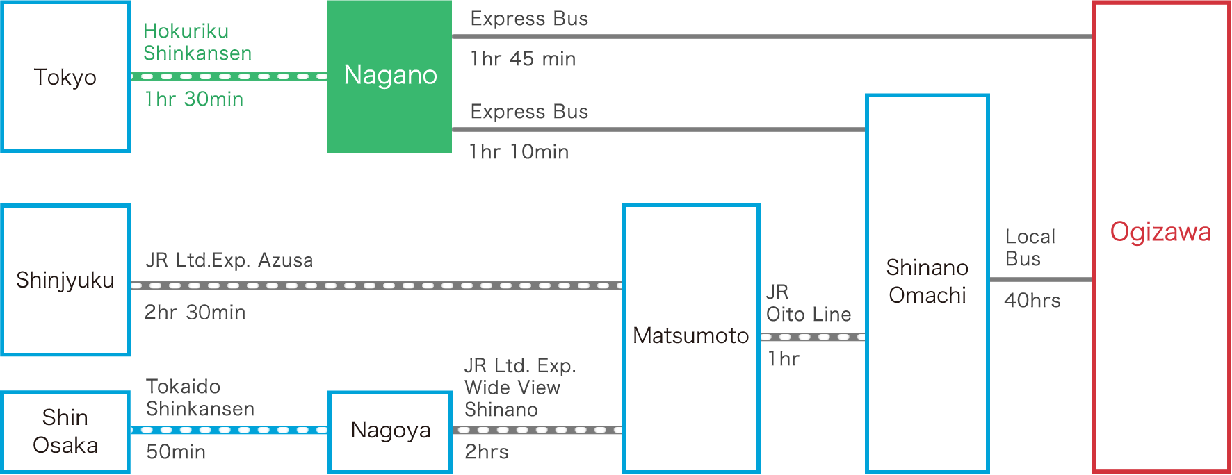 – จาก Nagano Station นั่งรถบัส Express Bus ไปลง Ogizawa ใช้เวลา 105 นาที